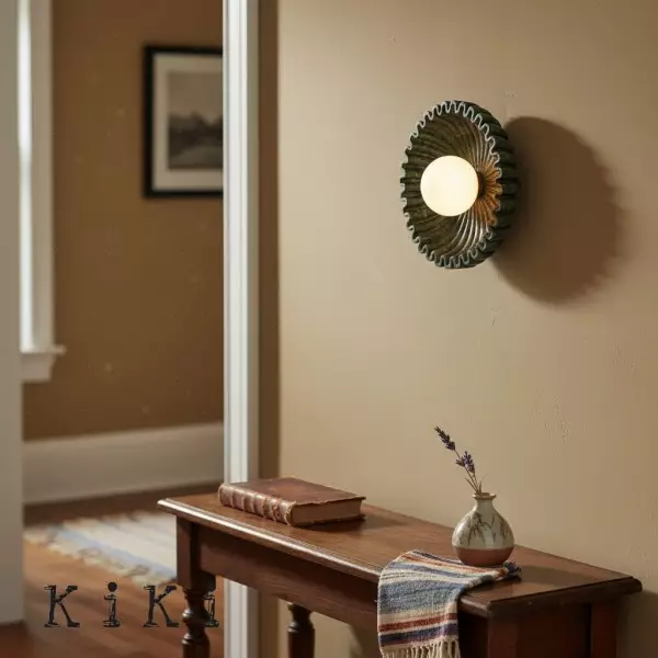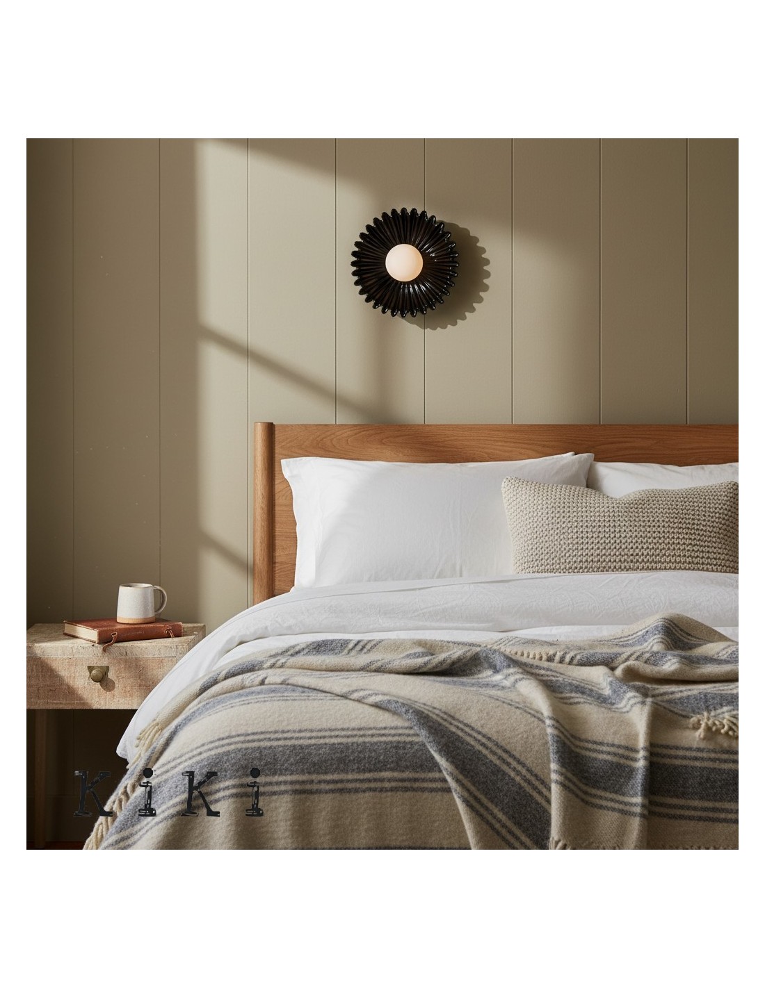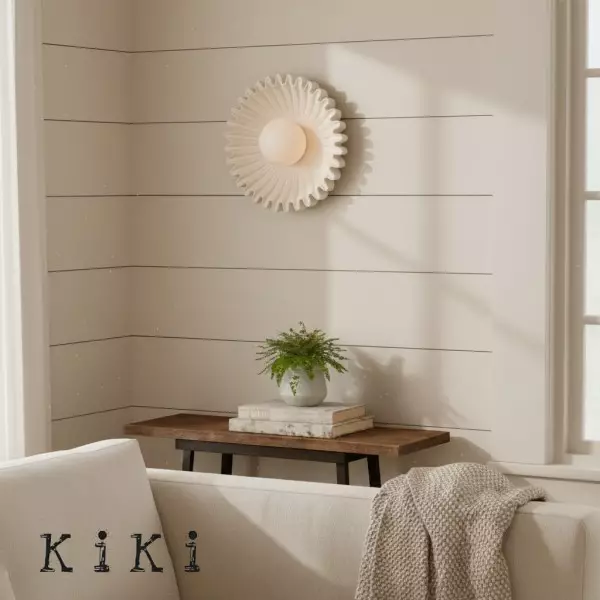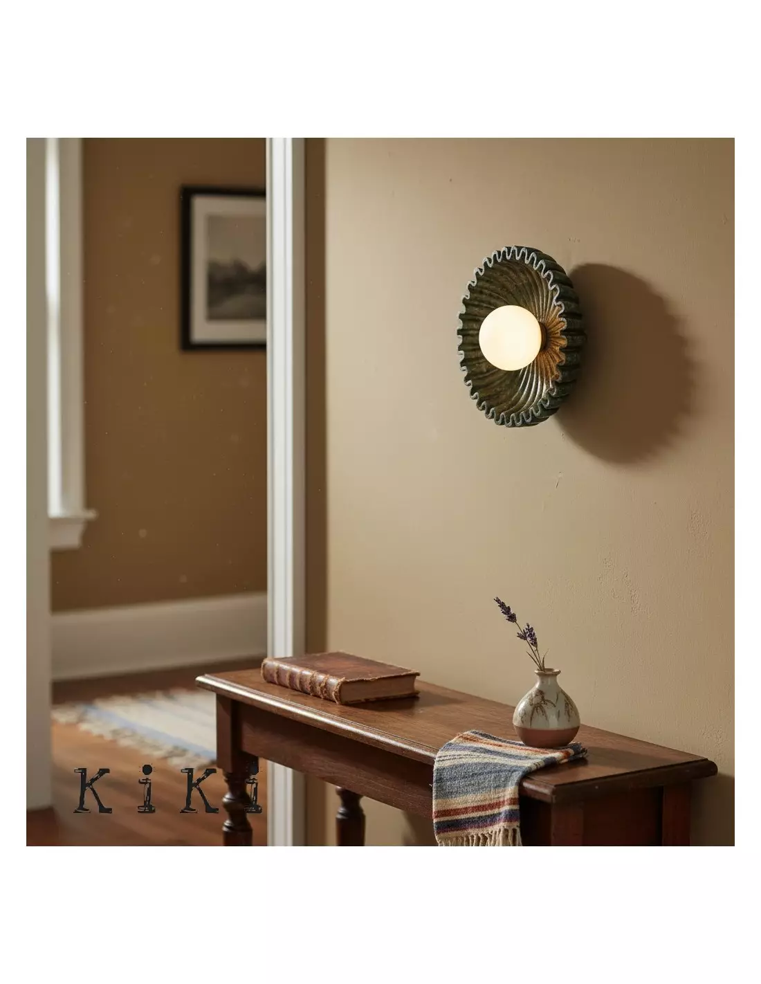 Die Keramik-Wandleuchte vereint auf harmonische Weise Kunst und Funktion. Eine runde Opalkugel schmiegt sich anmutig in eine strukturierte Keramikschale und erzeugt so eine skulpturale Präsenz, die zugleich sanft und edel wirkt. Die strukturierte Rückseite, die an zarte Stofffalten erinnert, verleiht dem Stück einen haptischen, handgefertigten Charakter.
