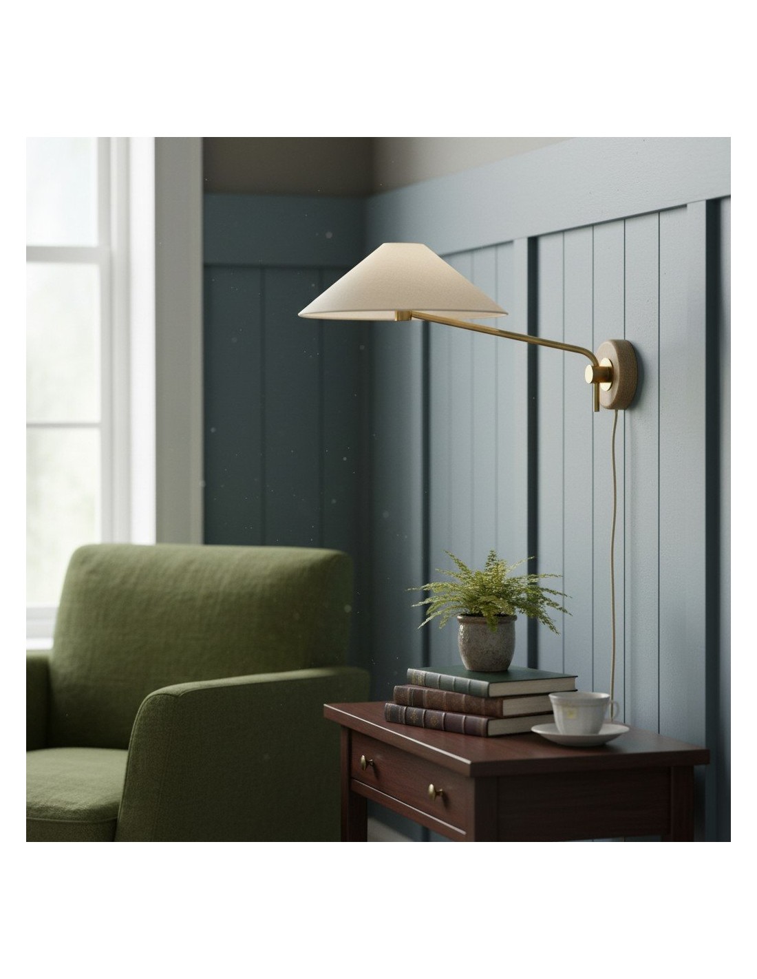Die Wandleuchte Ivoryne vereint minimalistisches Design mit natürlicher Wärme. Mit ihrem konischen Schirm, der ausgewogenen Halterung und dem verstellbaren Schwenkarm sorgt sie für ein fokussiertes, sanftes Licht. Ideal für Schlafzimmer, Leseecken und exklusive Interieurs bietet sie ruhige, funktionale und stilvolle Beleuchtung.