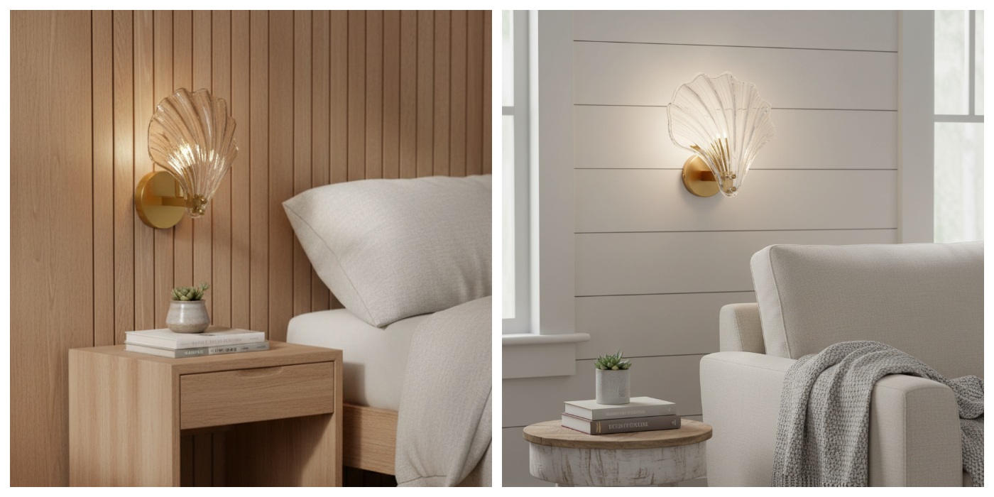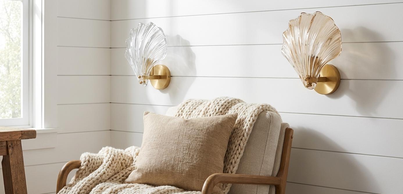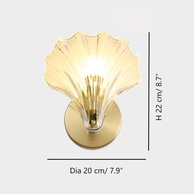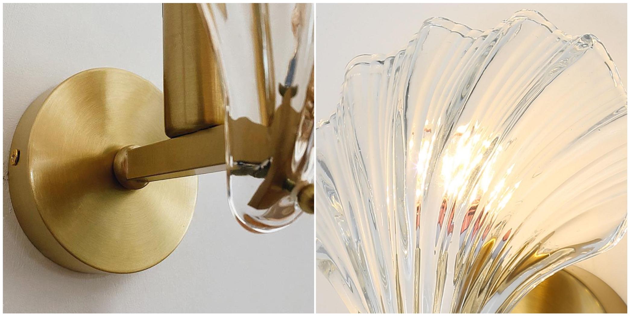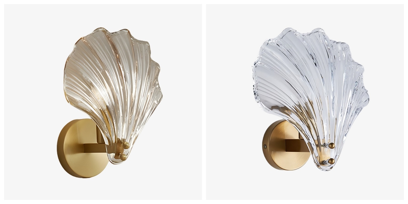 Wunderschöne Wandleuchten aus Messing. Die Leuchten haben die Form einer Muschel und sind in sehr gutem Zustand. Das Licht der Muschel-Wandleuchte wird von einem muschelförmigen Lampenschirm umhüllt, der es streut und für eine angenehme Atmosphäre im Raum sorgt. Ideal für Wohnzimmer, Schlafzimmer und Flur. Sie können die Farbe nach Ihren Wünschen wählen. Das Glas ist in zwei Ausführungen erhältlich: Braun und Klar.
