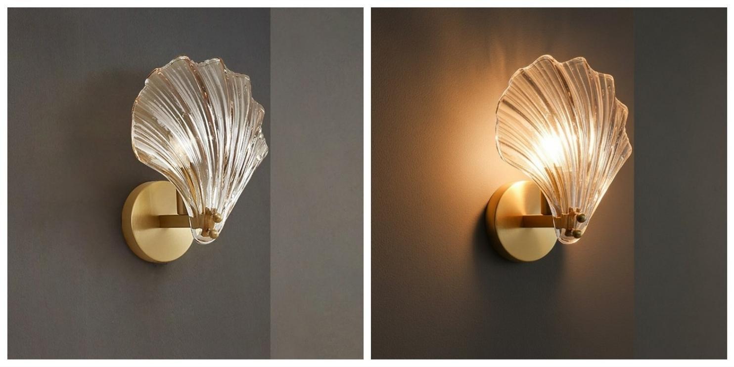 Wunderschöne Wandleuchten aus Messing. Die Leuchten haben die Form einer Muschel und sind in sehr gutem Zustand. Das Licht der Muschel-Wandleuchte wird von einem muschelförmigen Lampenschirm umhüllt, der es streut und für eine angenehme Atmosphäre im Raum sorgt. Ideal für Wohnzimmer, Schlafzimmer und Flur. Sie können die Farbe nach Ihren Wünschen wählen. Das Glas ist in zwei Ausführungen erhältlich: Braun und Klar.