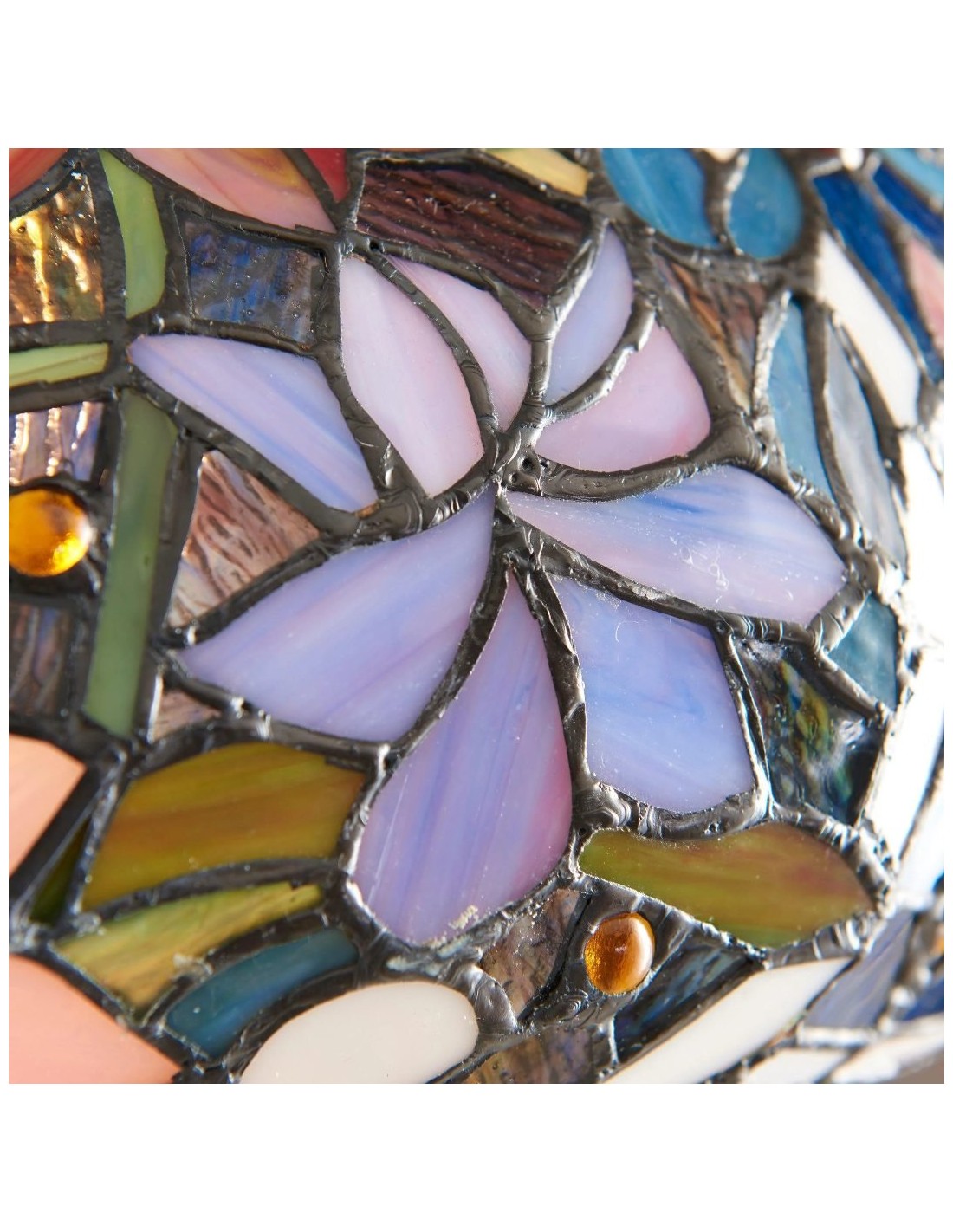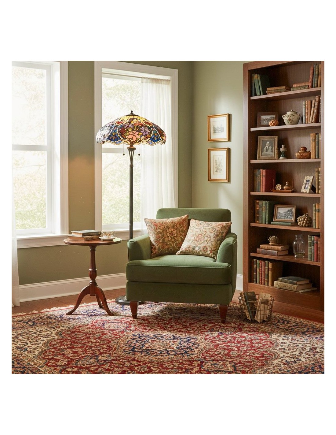 Die Tiffany-Stehlampe Sullivan besticht durch ihren handgefertigten Lampenschirm aus Buntglas mit einem filigranen Blumenmuster. Sie strahlt warmes Licht aus und eignet sich hervorragend als elegante Leselampe oder als stilvolles Accessoire für Ihren Nachttisch oder Ihr Wohnzimmer.