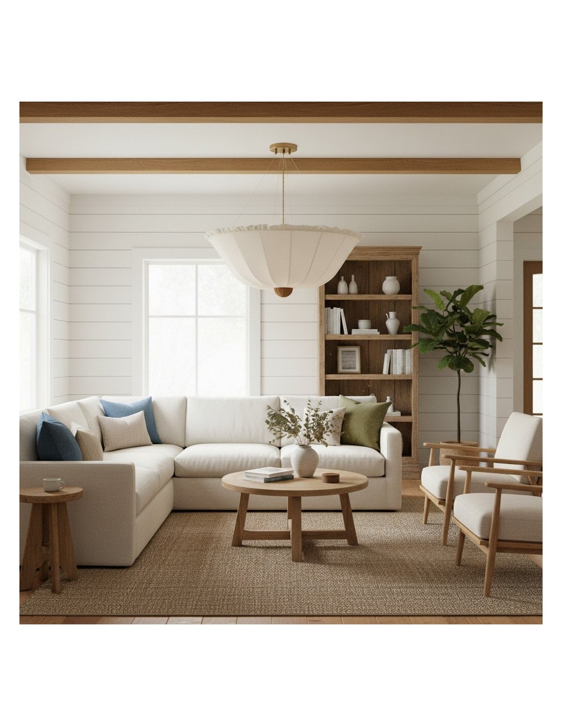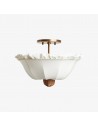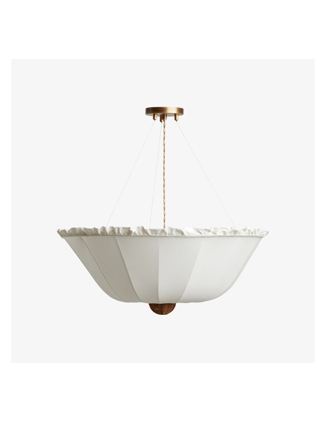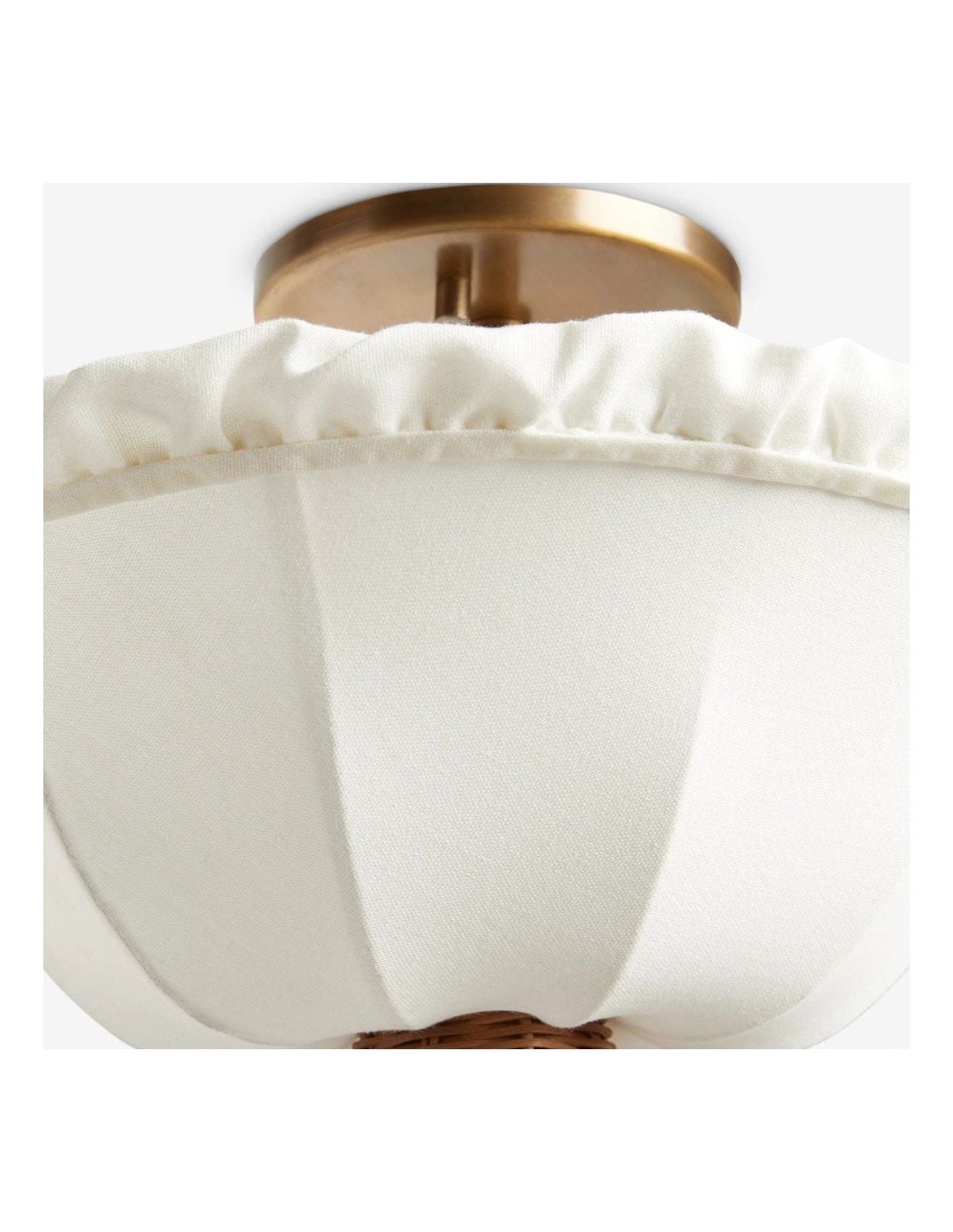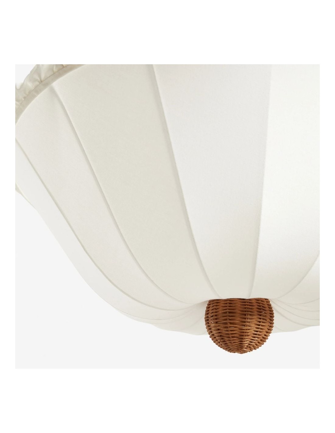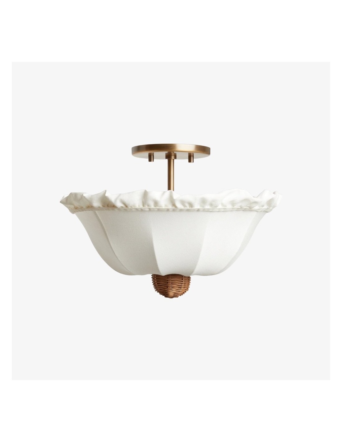 Diese flache Deckenleuchte kombiniert natürliche Flechtelemente mit einem schirmförmigen Schirm und verströmt so einen luftigen, zeitlosen Charme. Dank ihrer kompakten Bauweise und klaren Linienführung eignet sie sich perfekt für kleinere Räume oder Räume mit niedrigen Decken.