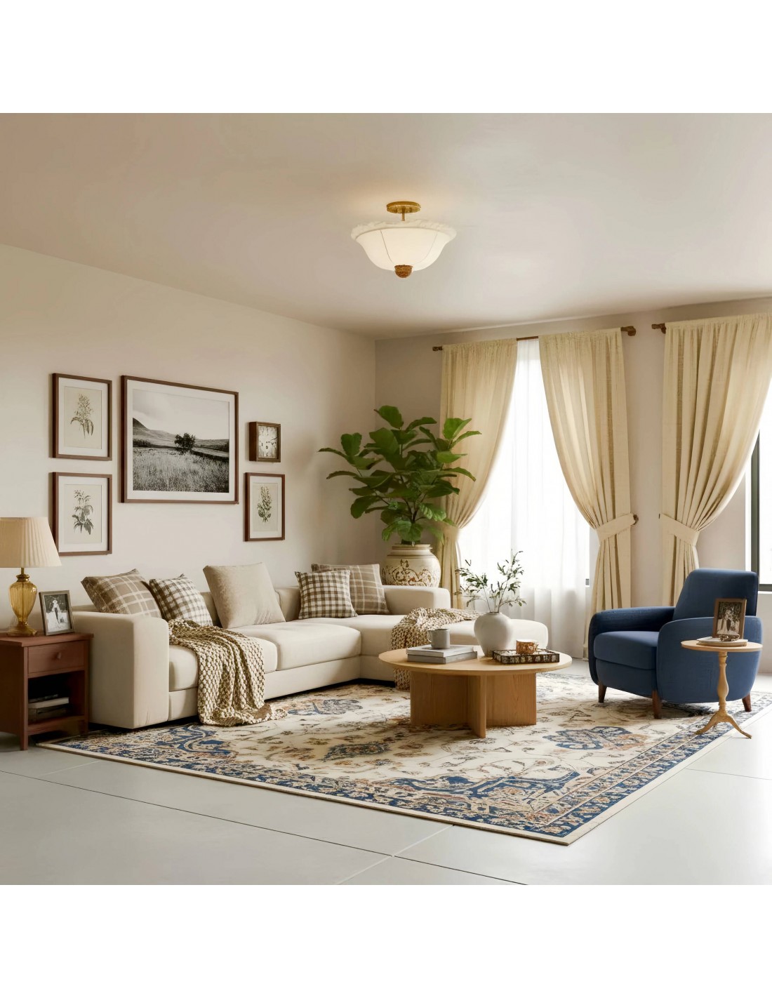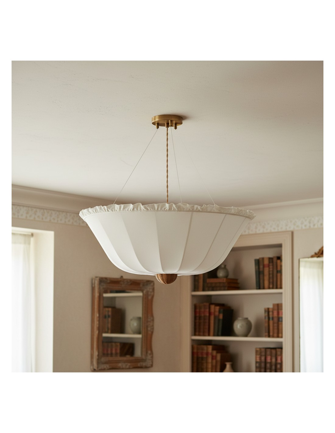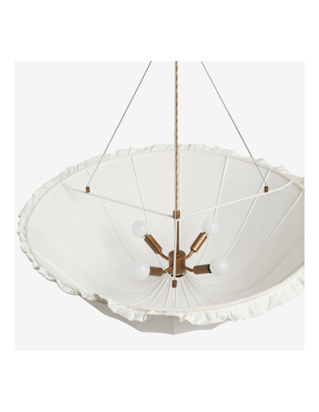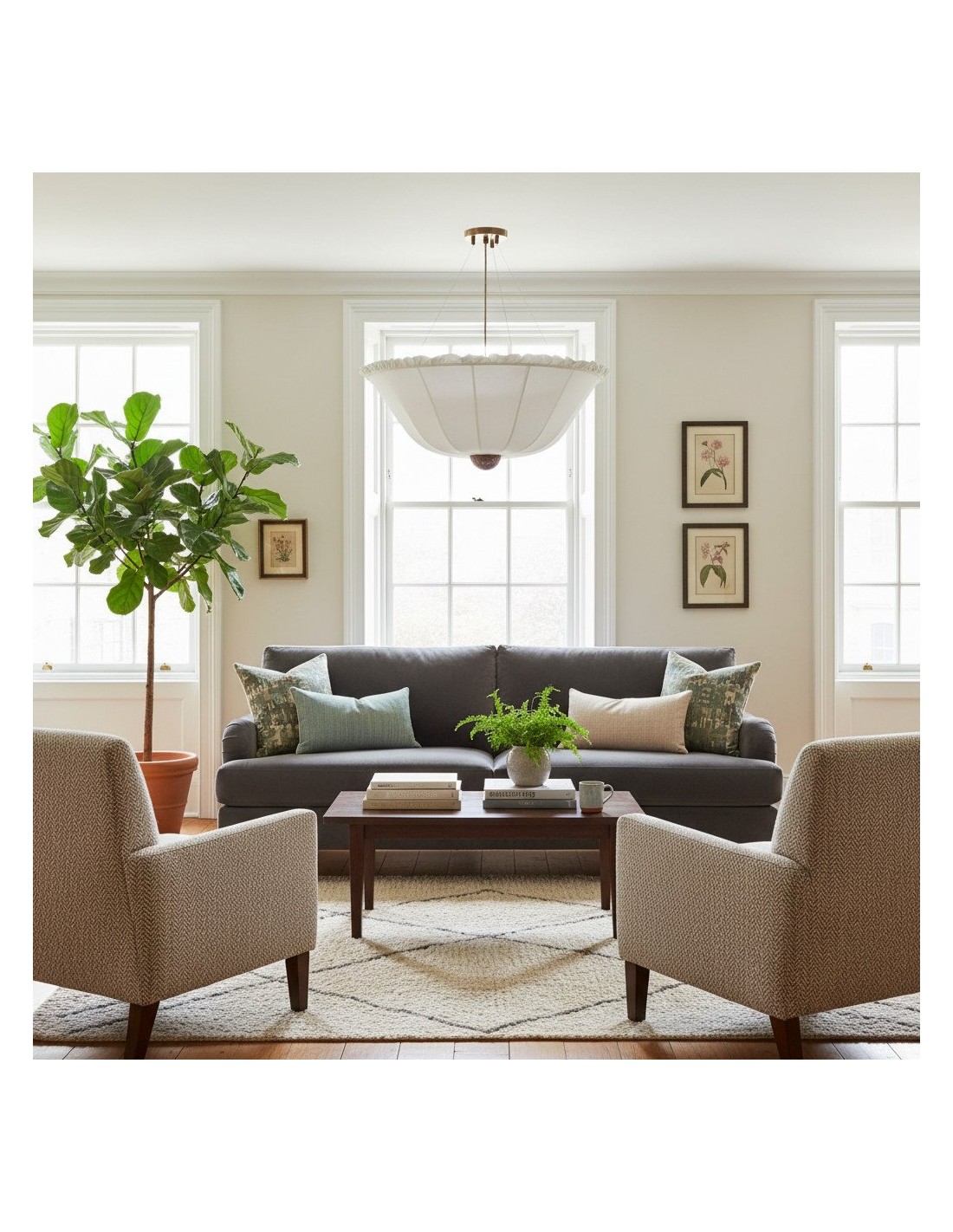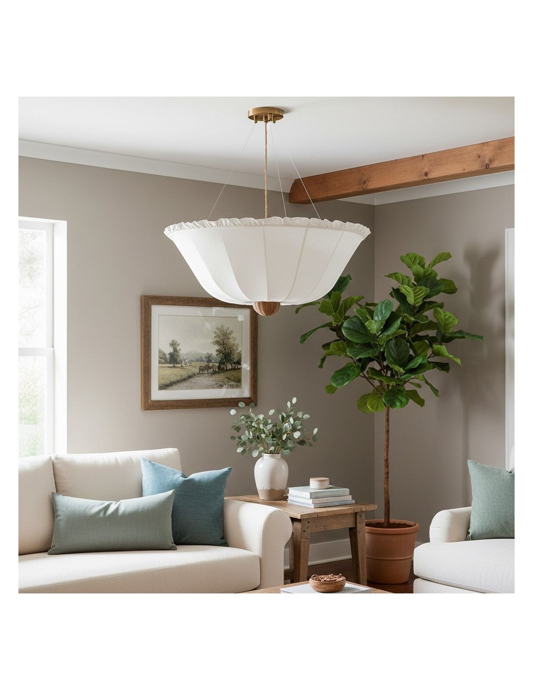 Diese flache Deckenleuchte kombiniert natürliche Flechtelemente mit einem schirmförmigen Schirm und verströmt so einen luftigen, zeitlosen Charme. Dank ihrer kompakten Bauweise und klaren Linienführung eignet sie sich perfekt für kleinere Räume oder Räume mit niedrigen Decken.