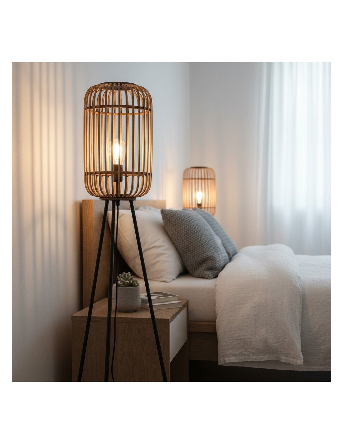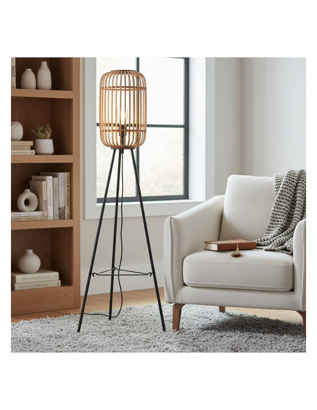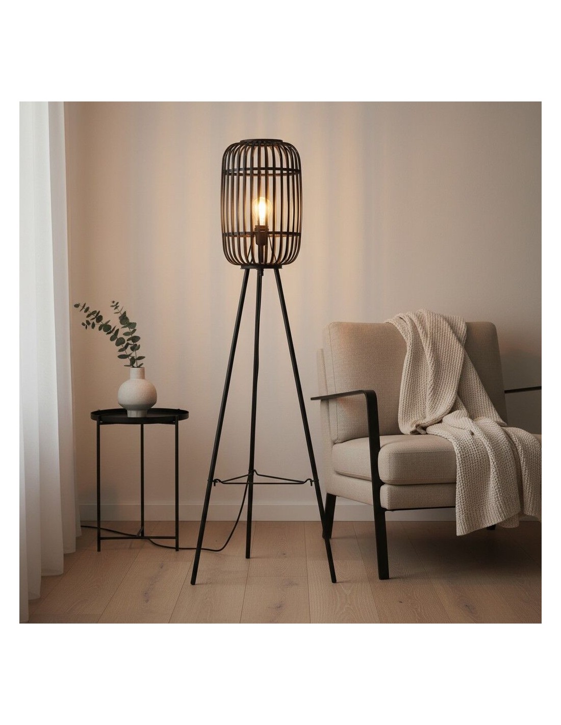 Die Stehleuchte Yumeko kombiniert ein schlankes Gestell mit einem strukturierten Lampenschirm aus gewebtem Bambus und erzeugt so ein warmes, stimmungsvolles Licht. Diese einflammige Stehleuchte schafft eine behagliche Atmosphäre und eignet sich ideal für Wohnzimmer, Schlafzimmer, Leseecken oder Homeoffices. Sie passt perfekt zu modernen, skandinavischen oder Boho-Einrichtungen.