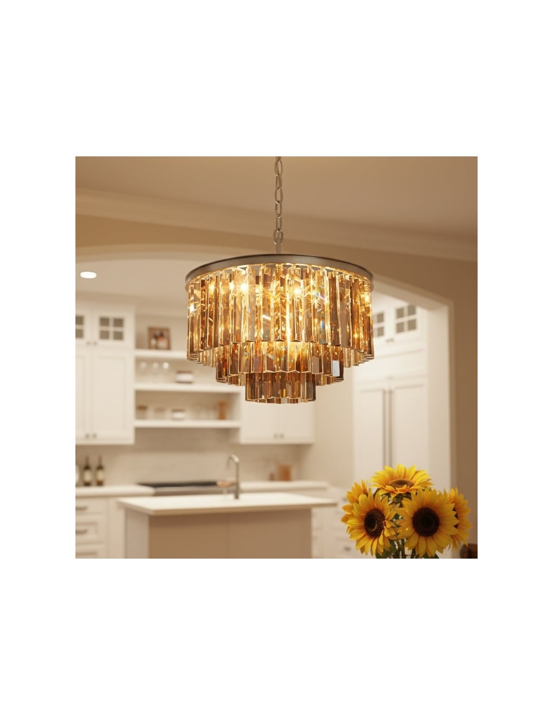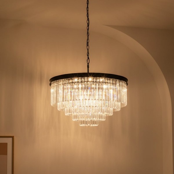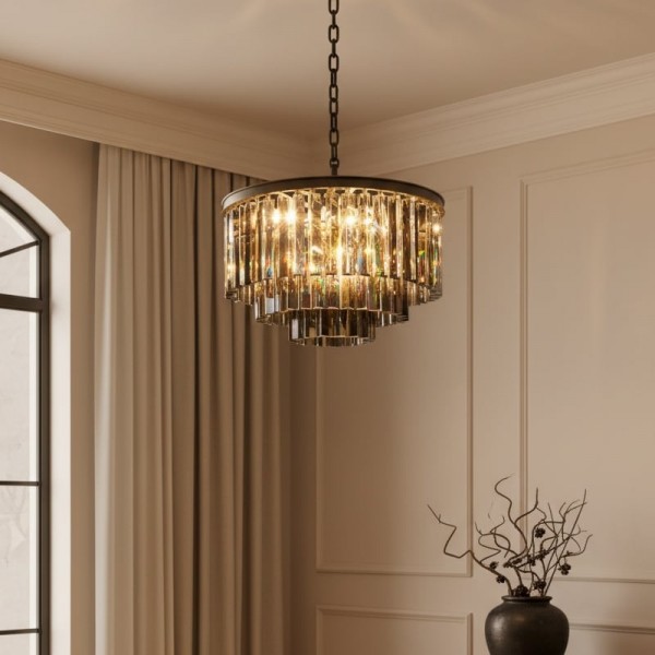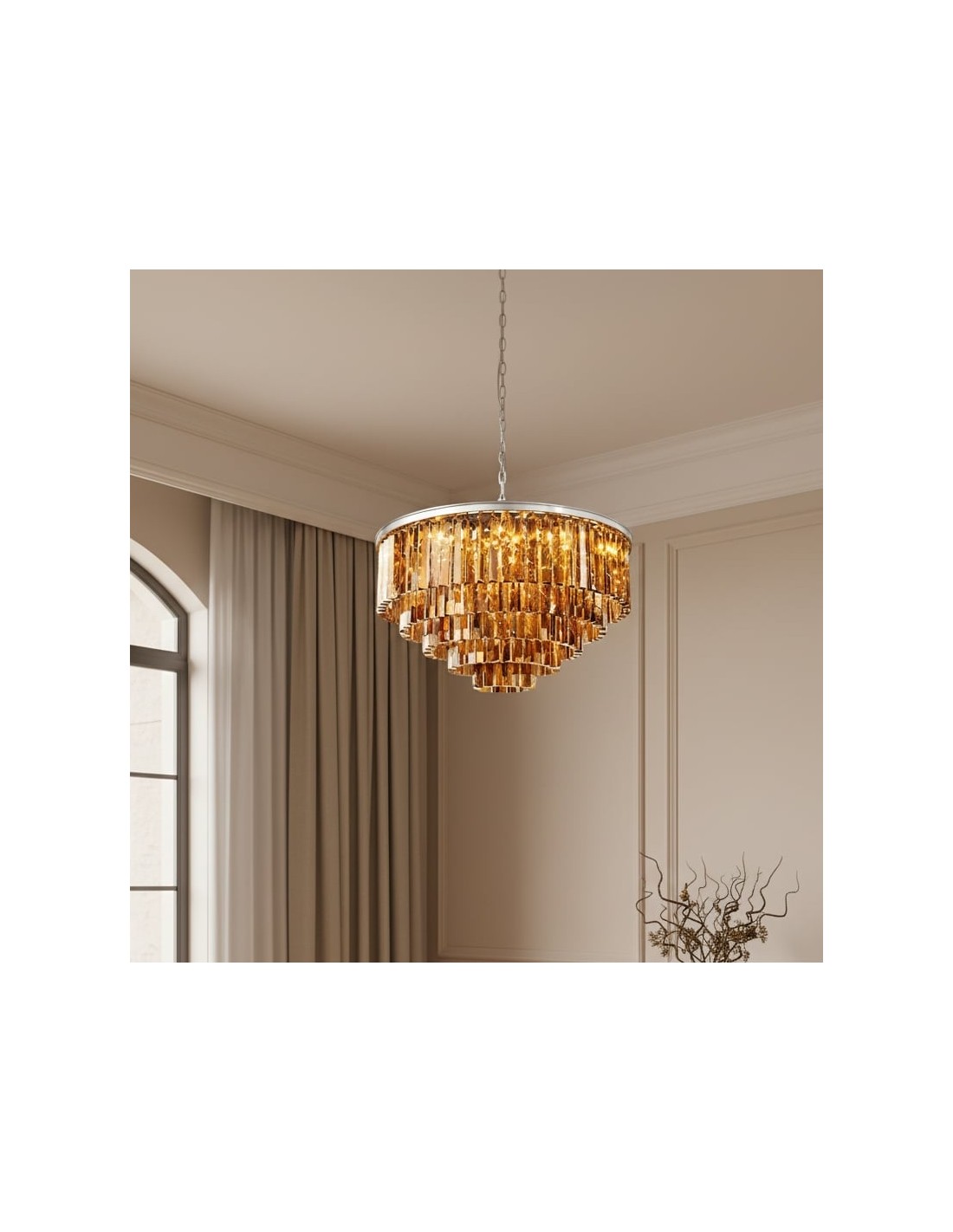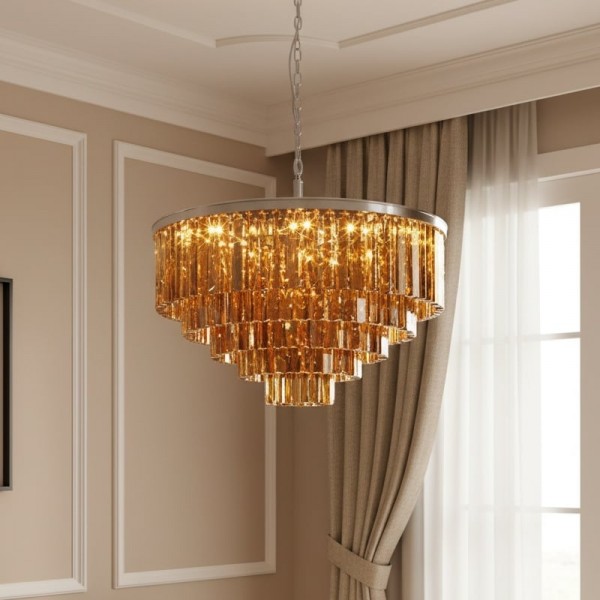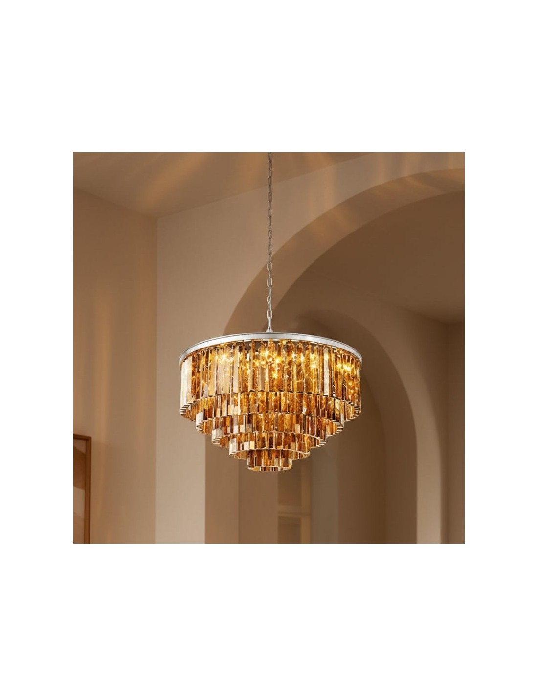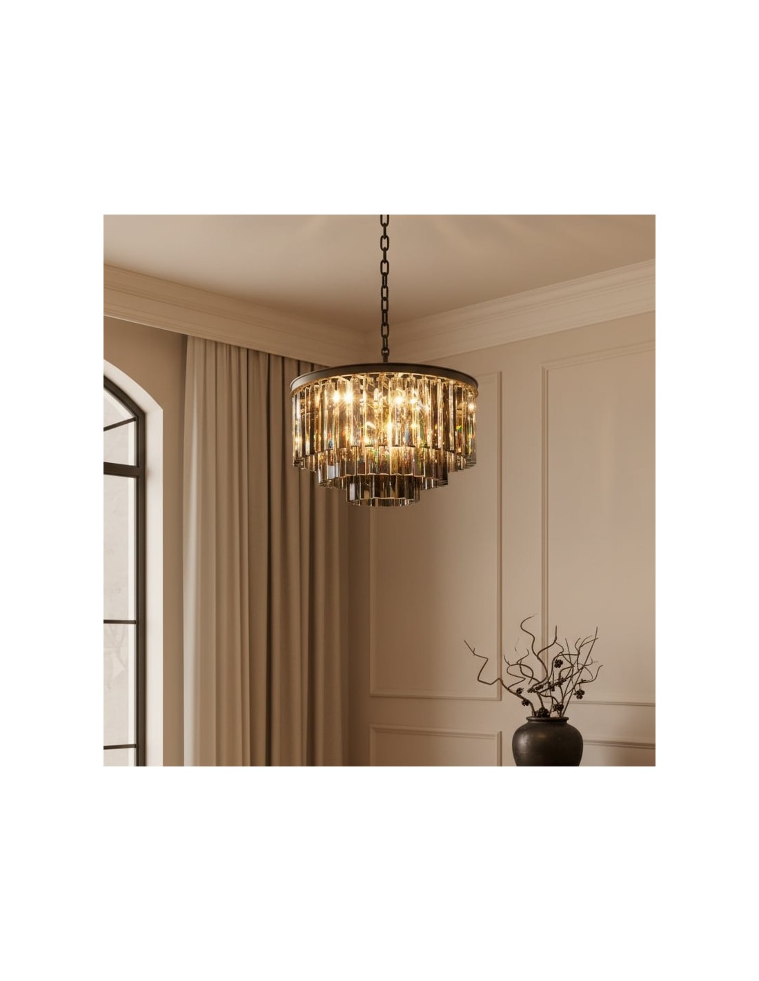 This striking round chandelier featuring layered crystal prisms and a metal frame, designed for modern and contemporary interiors. The fixture creates sparkling ambient and accent lighting for living rooms, dining rooms, foyers and bedrooms.