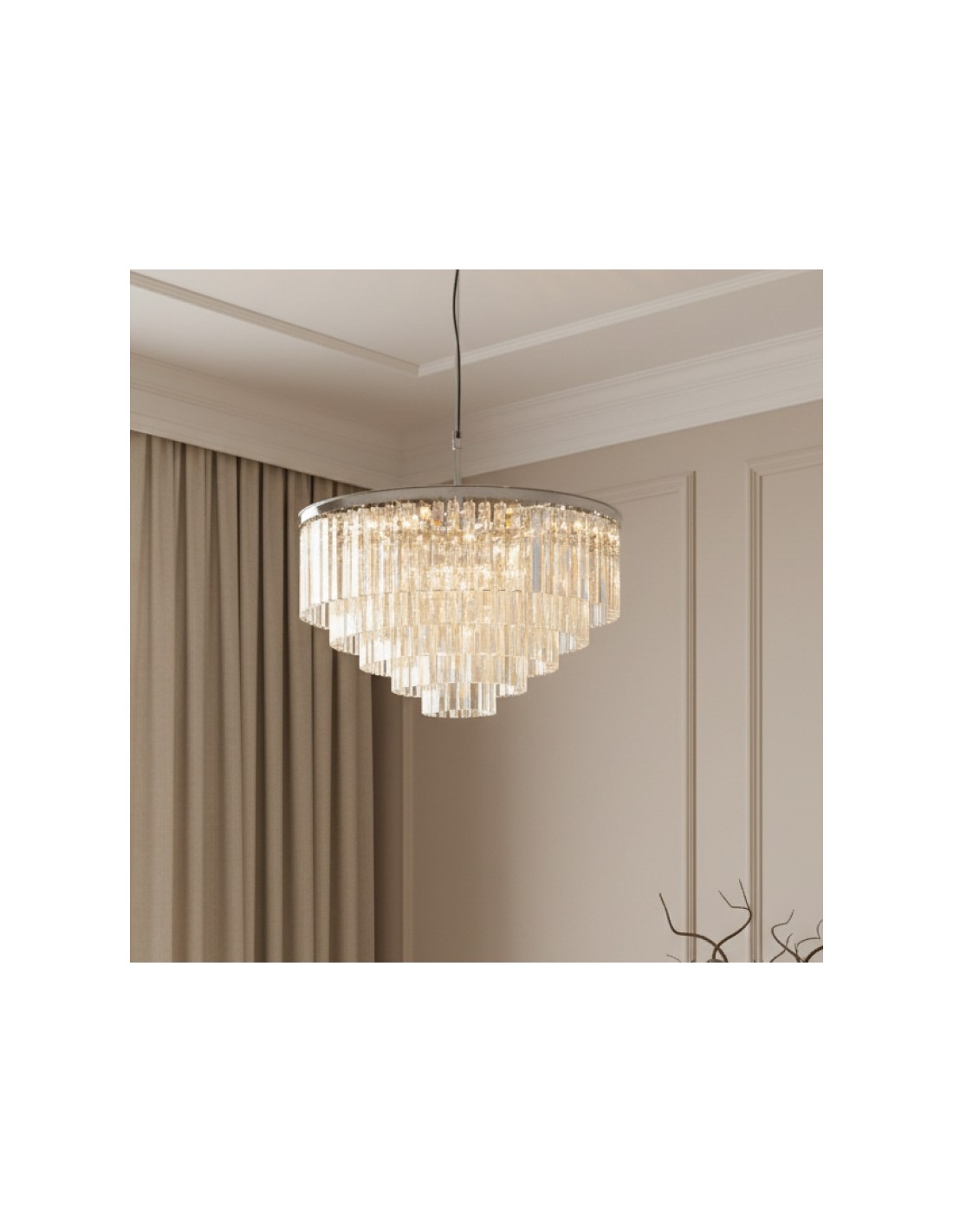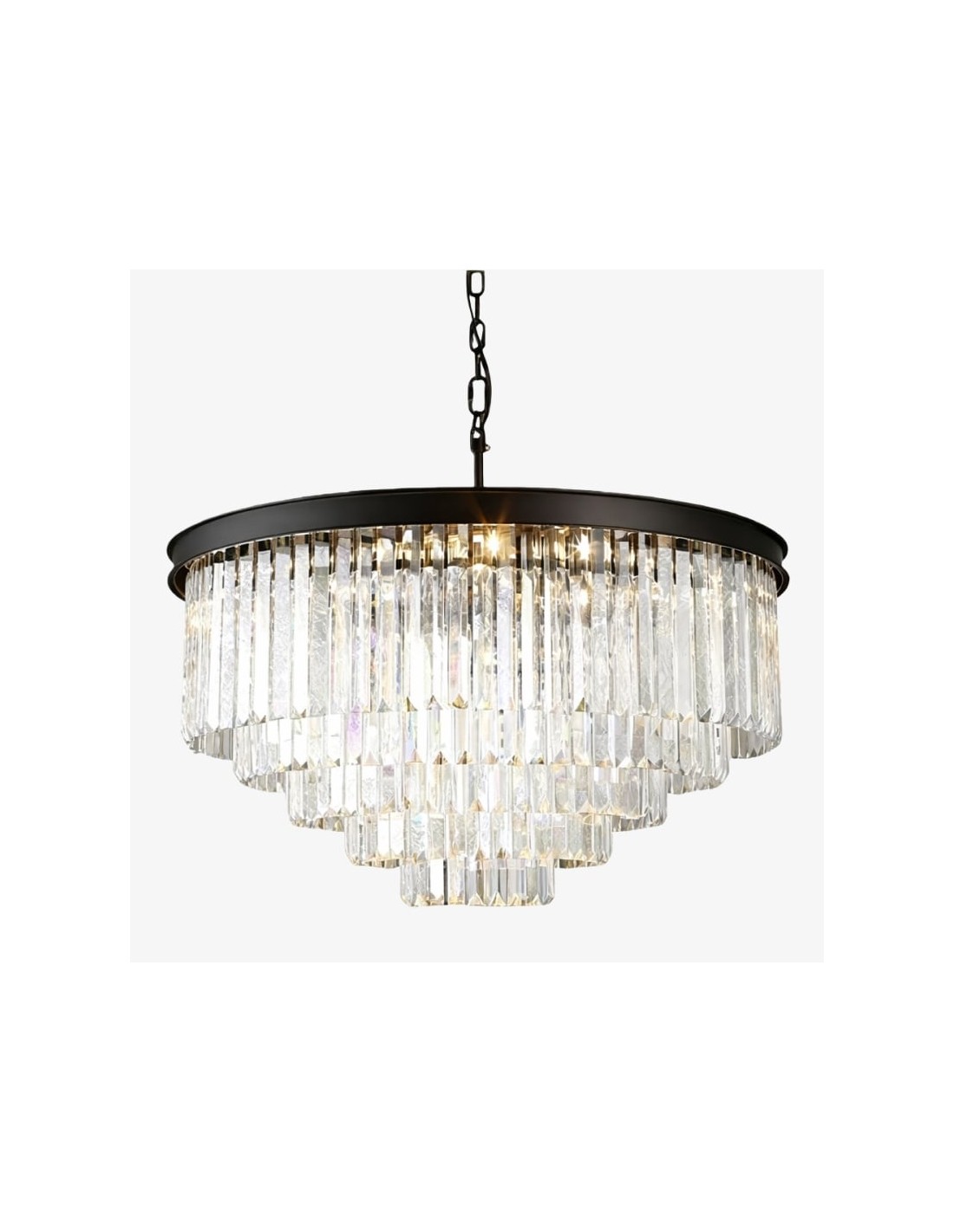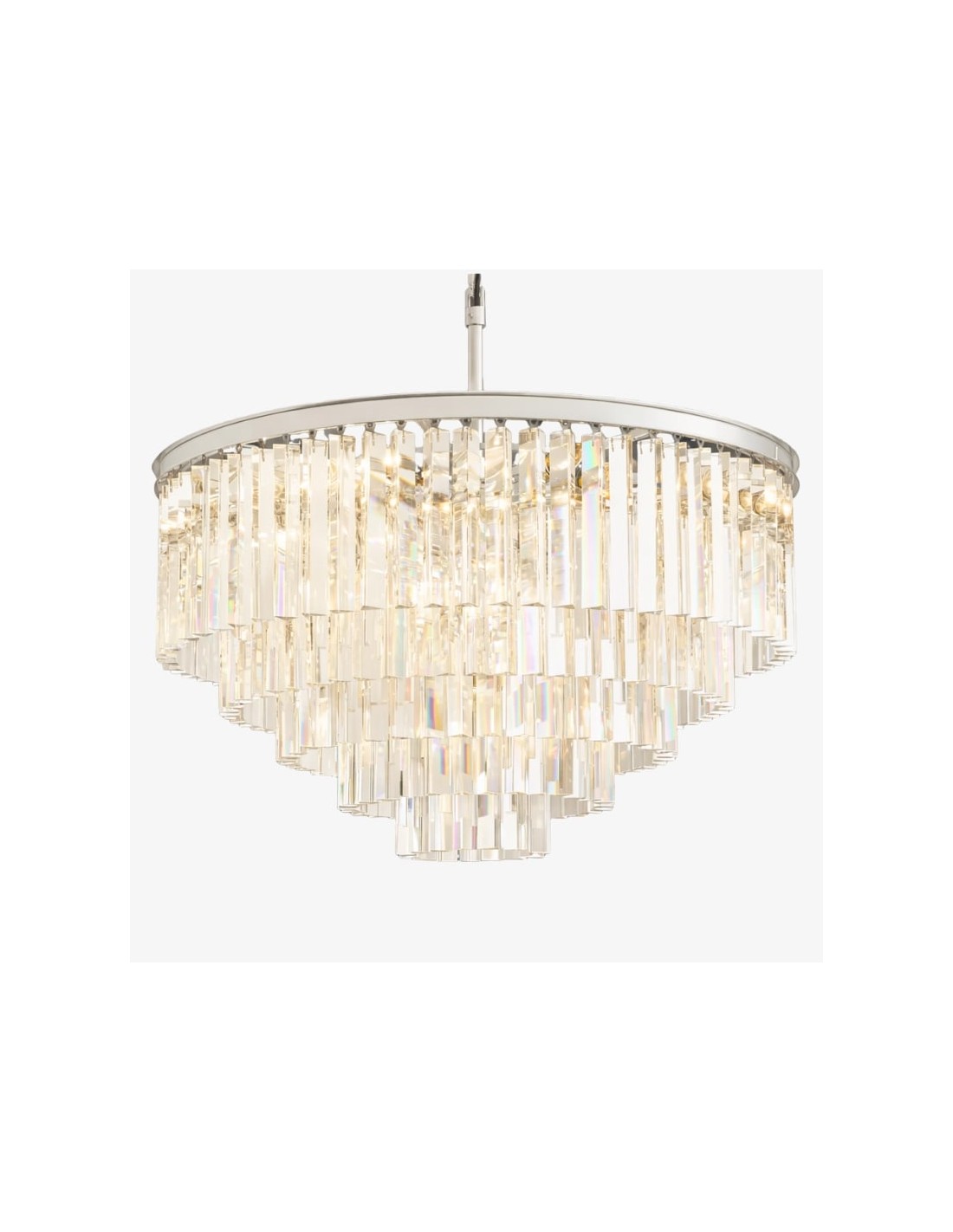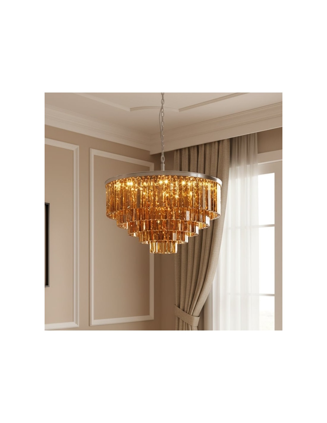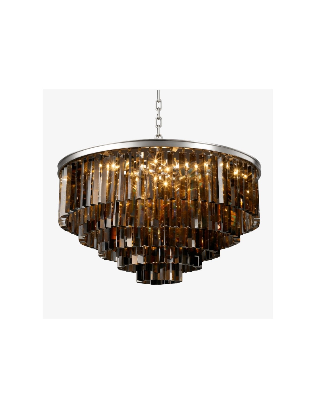 This striking round chandelier featuring layered crystal prisms and a metal frame, designed for modern and contemporary interiors. The fixture creates sparkling ambient and accent lighting for living rooms, dining rooms, foyers and bedrooms.