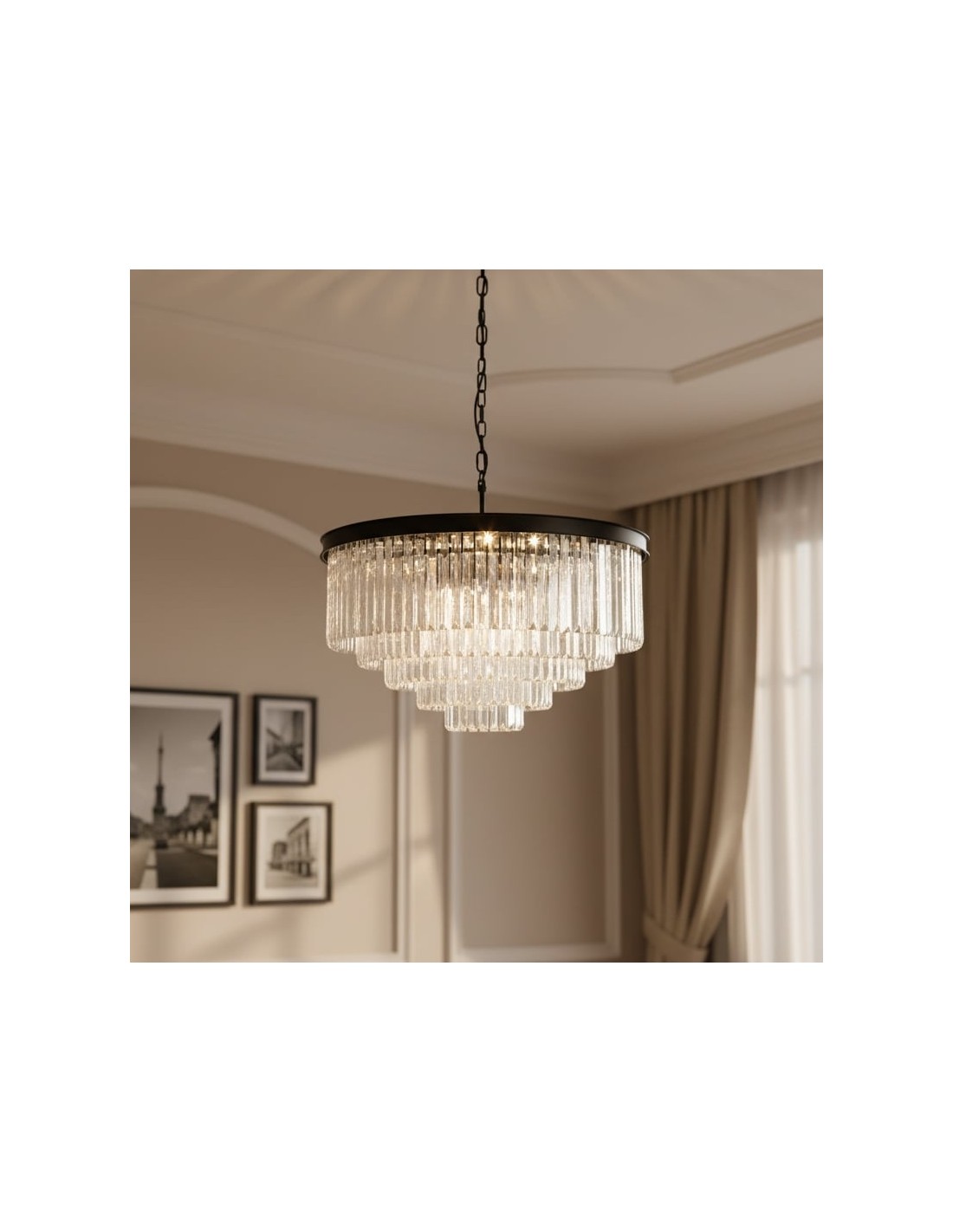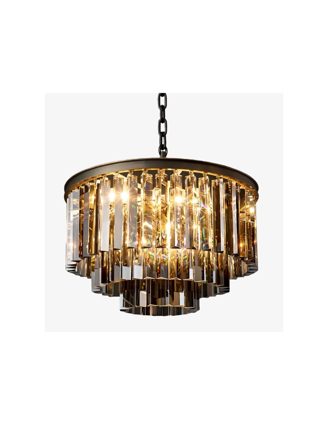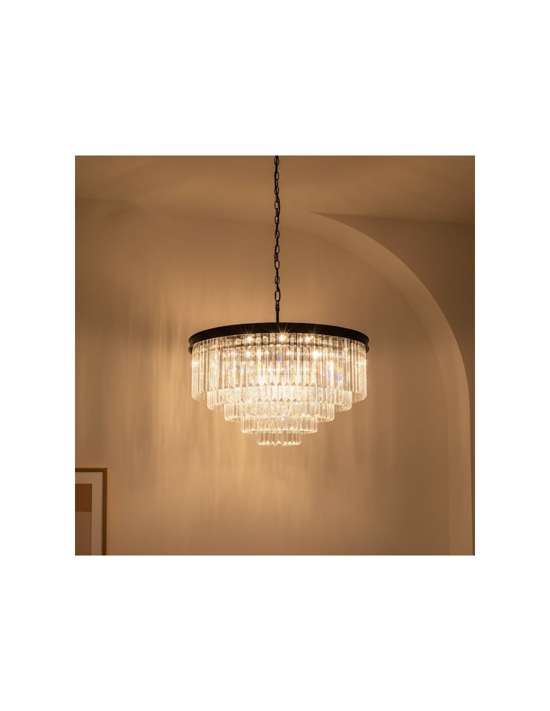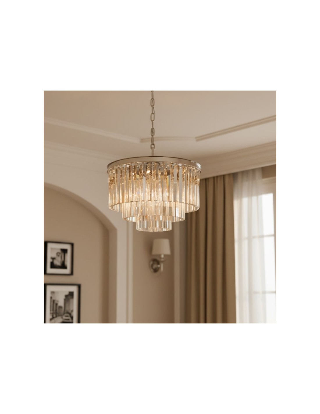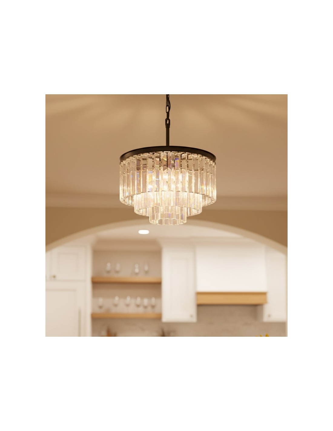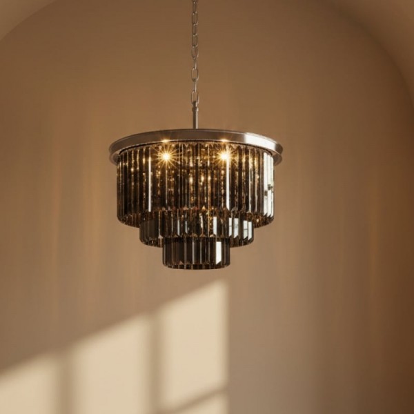 This striking round chandelier featuring layered crystal prisms and a metal frame, designed for modern and contemporary interiors. The fixture creates sparkling ambient and accent lighting for living rooms, dining rooms, foyers and bedrooms.