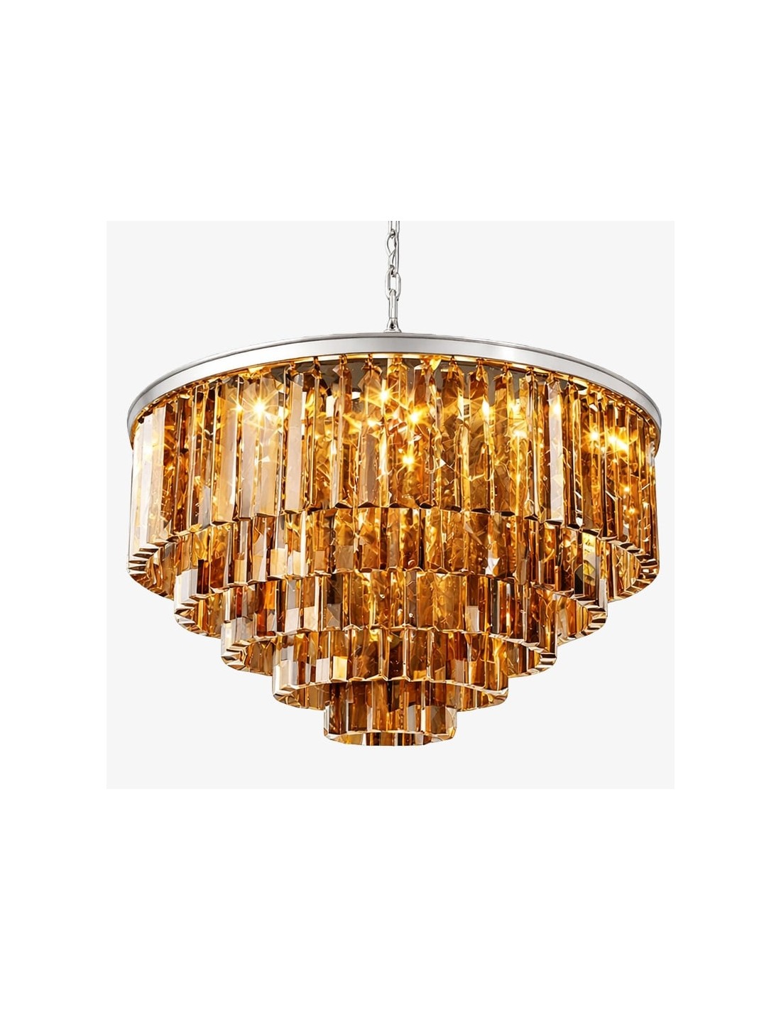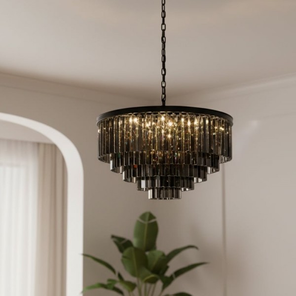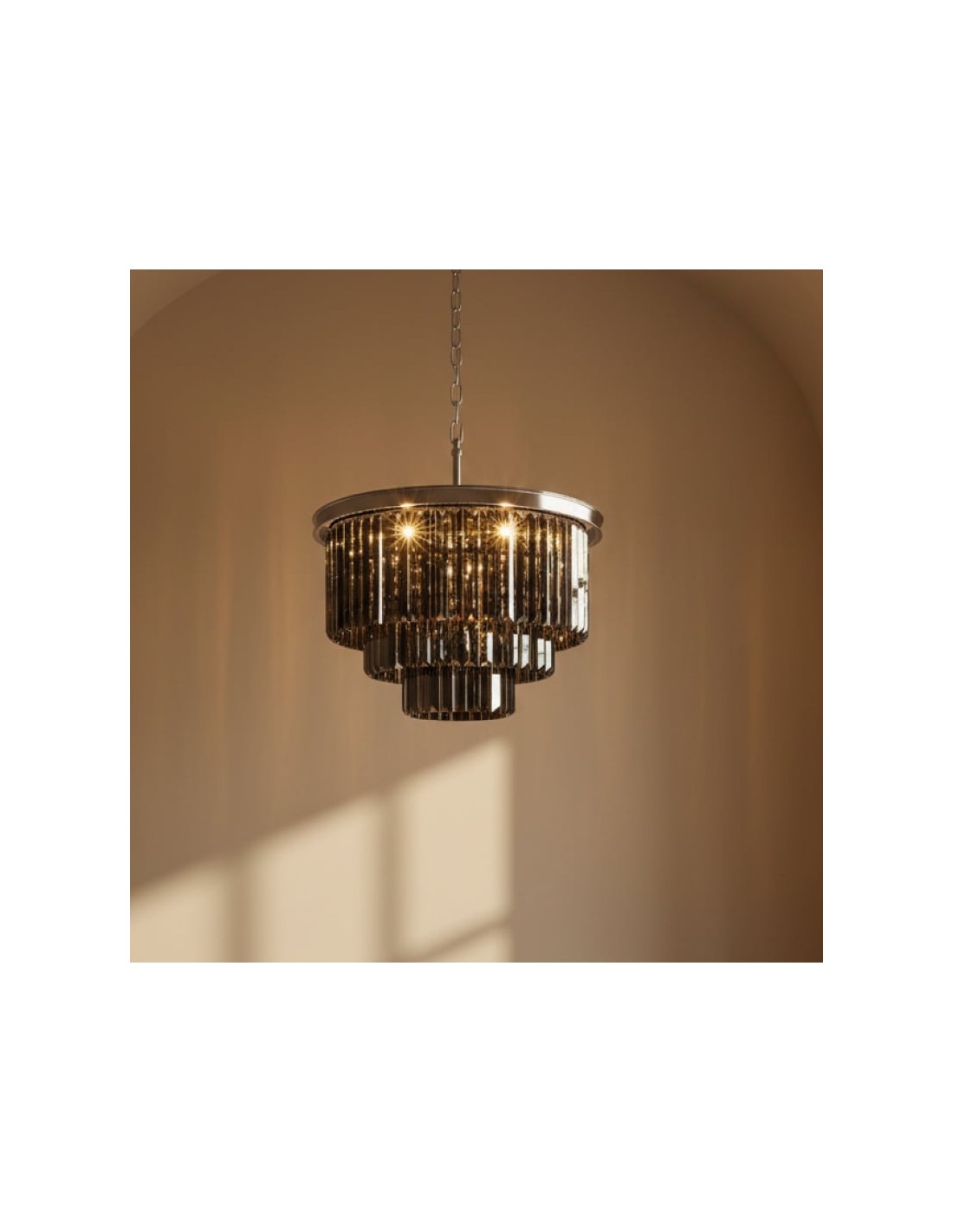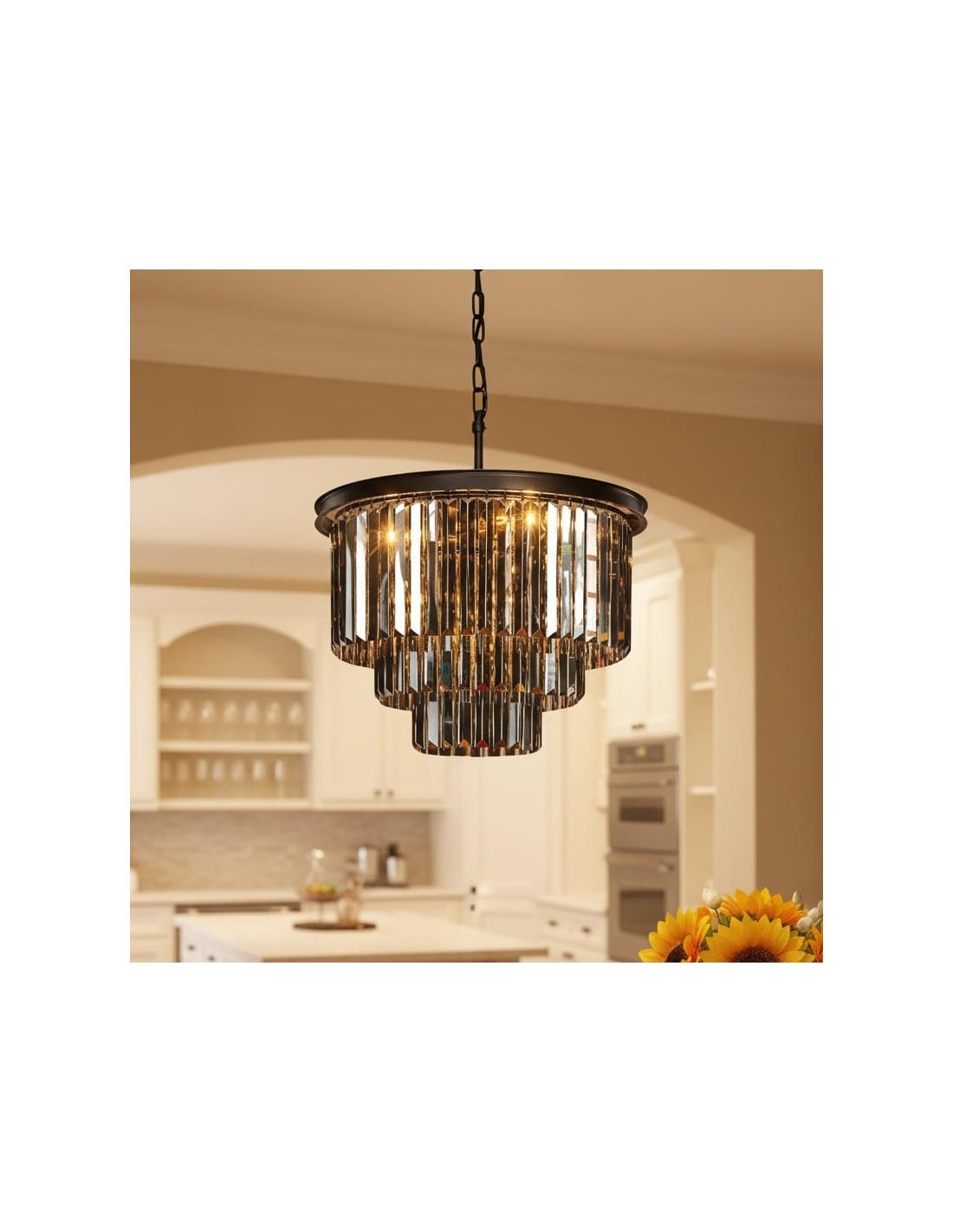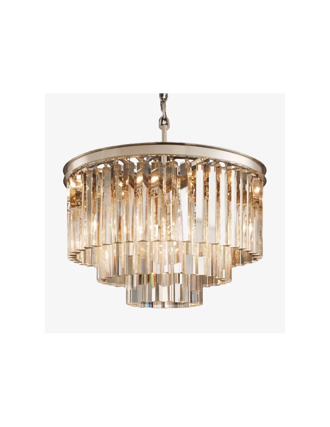 This striking round chandelier featuring layered crystal prisms and a metal frame, designed for modern and contemporary interiors. The fixture creates sparkling ambient and accent lighting for living rooms, dining rooms, foyers and bedrooms.