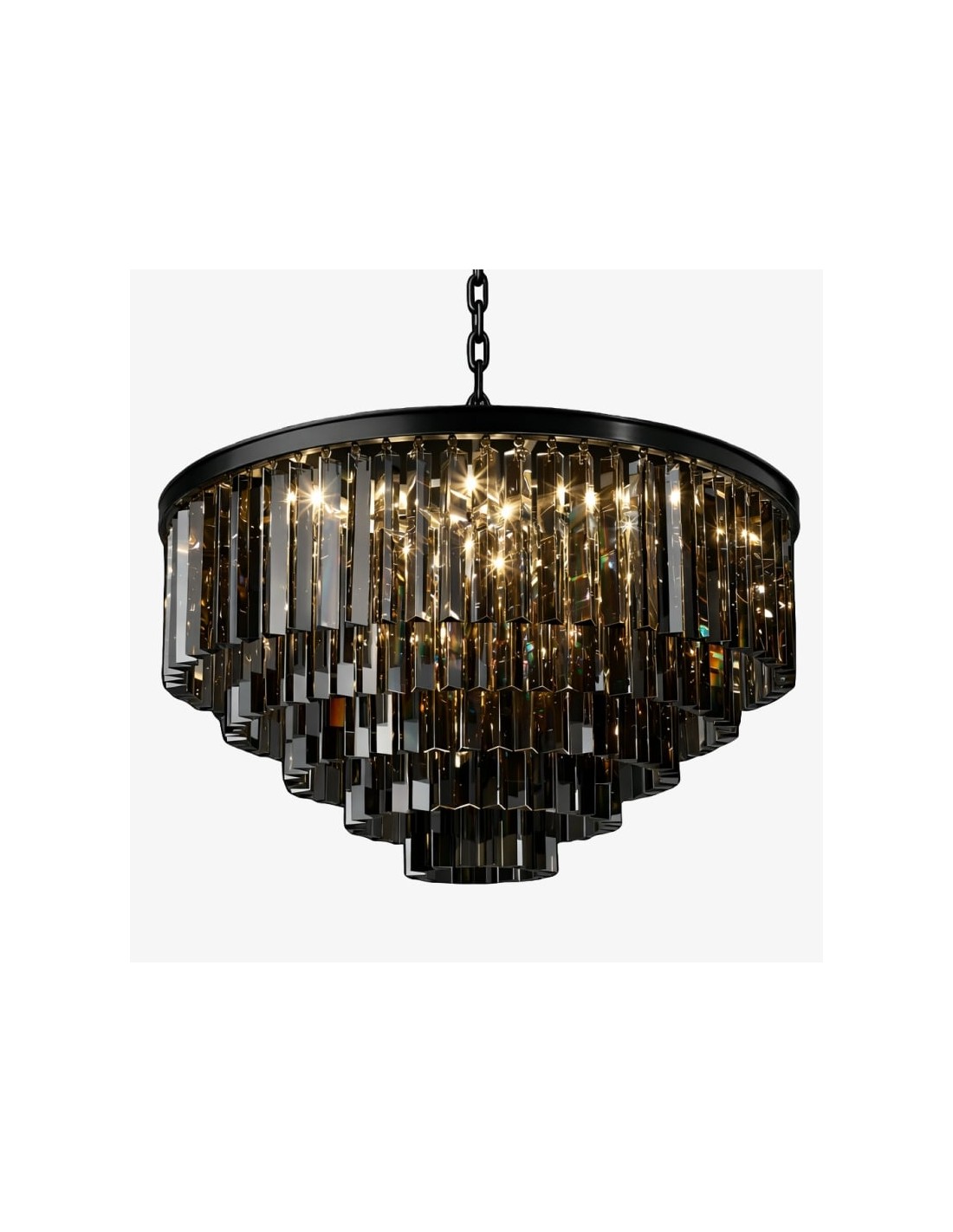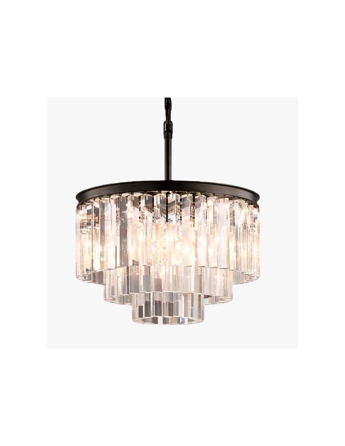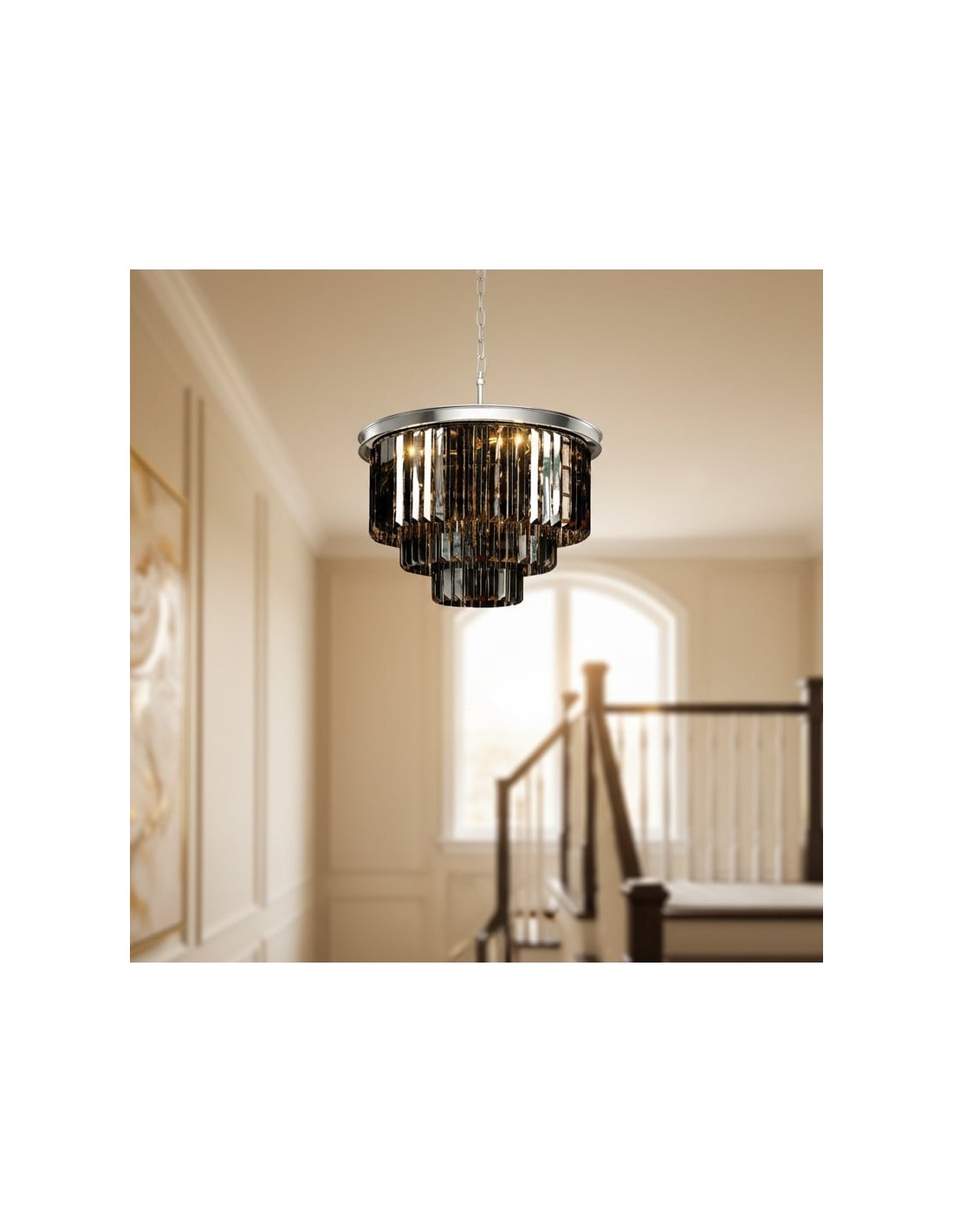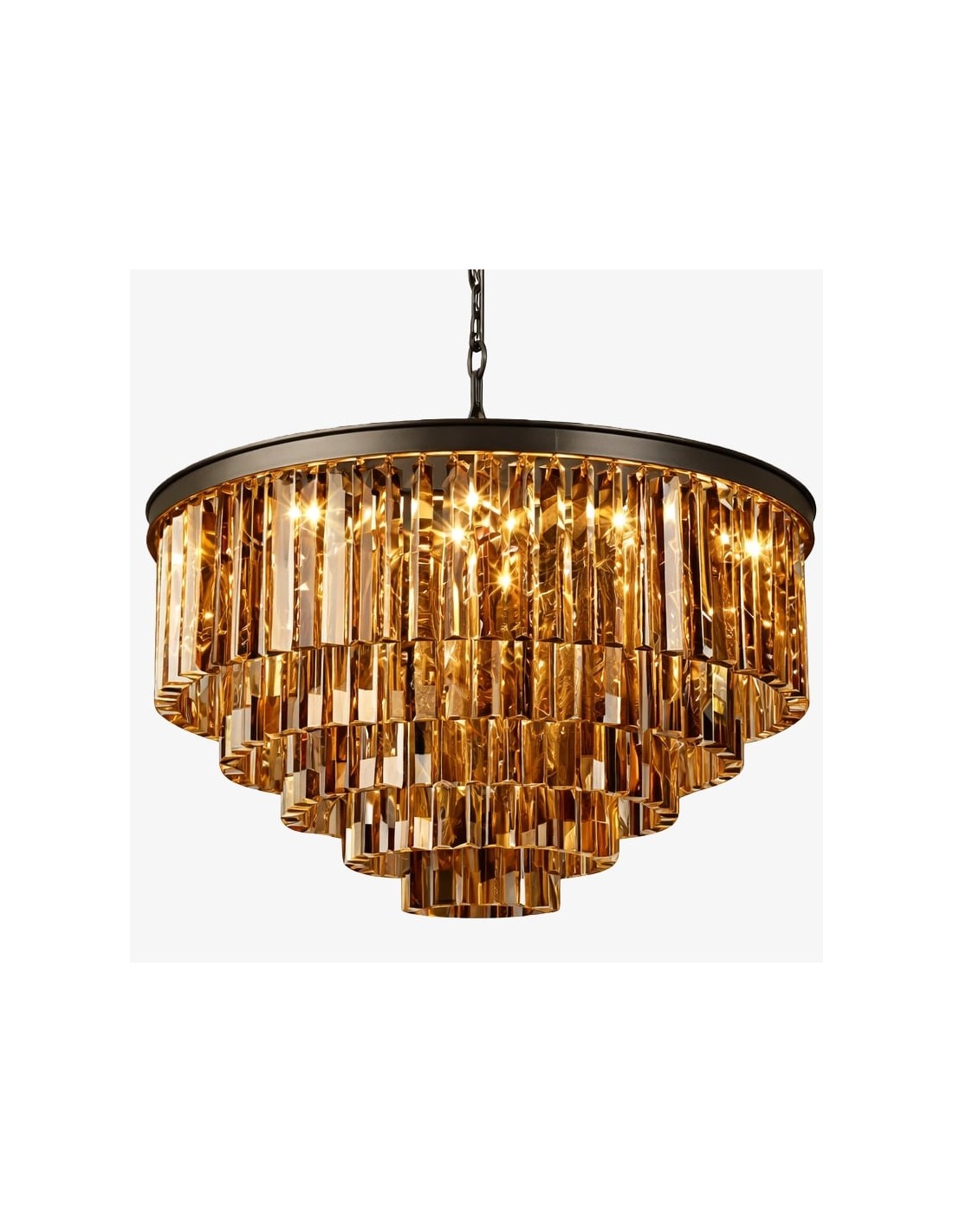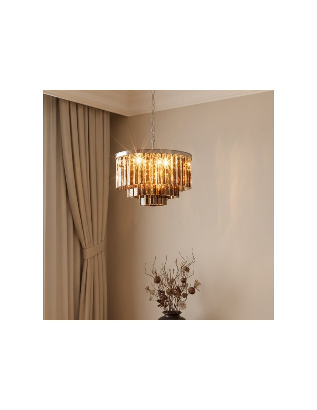 This striking round chandelier featuring layered crystal prisms and a metal frame, designed for modern and contemporary interiors. The fixture creates sparkling ambient and accent lighting for living rooms, dining rooms, foyers and bedrooms.