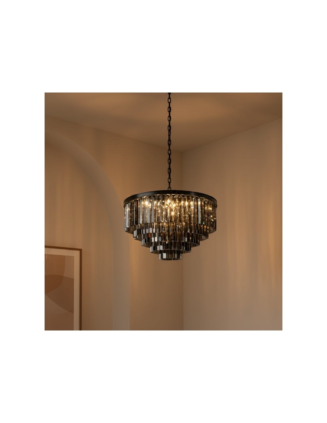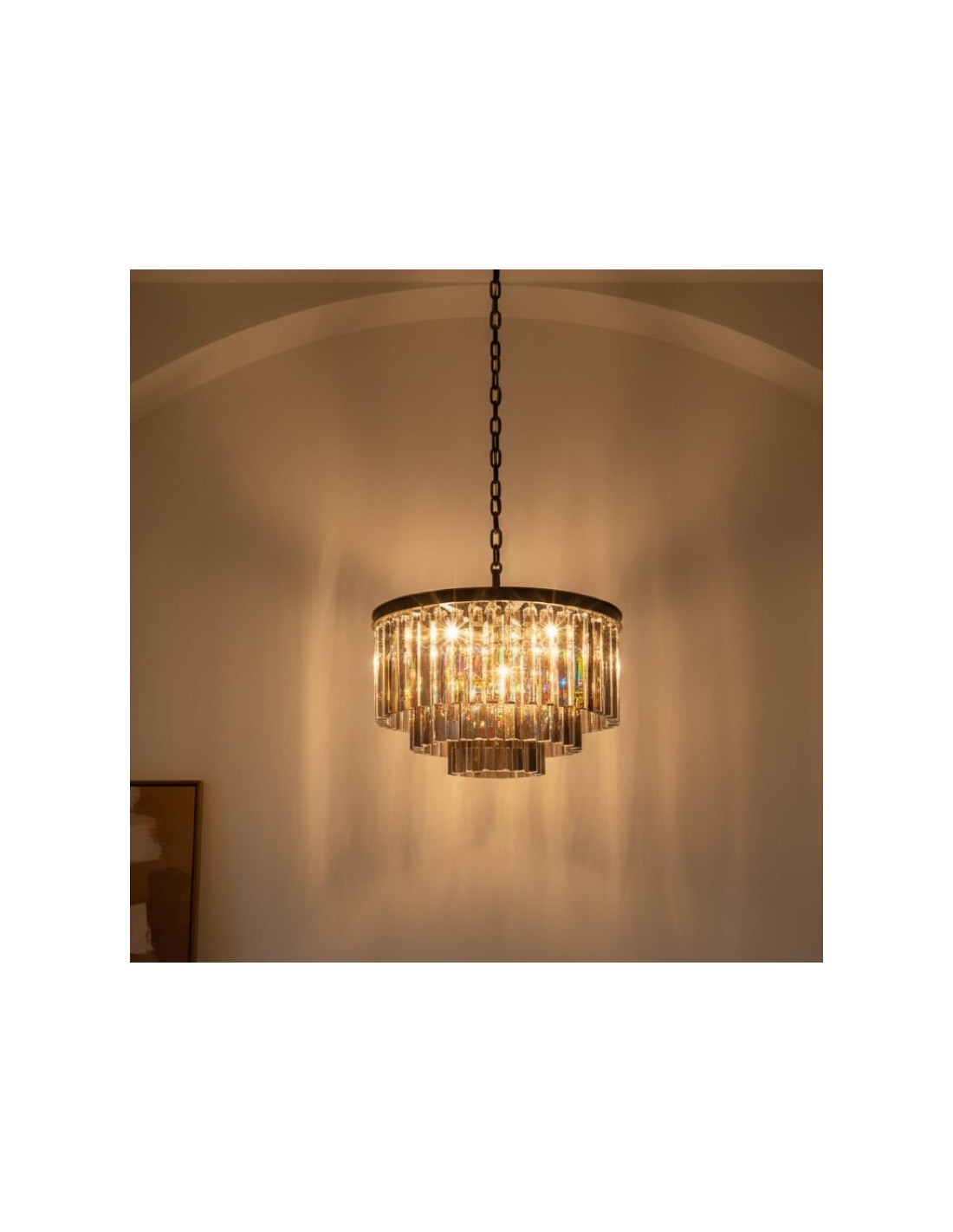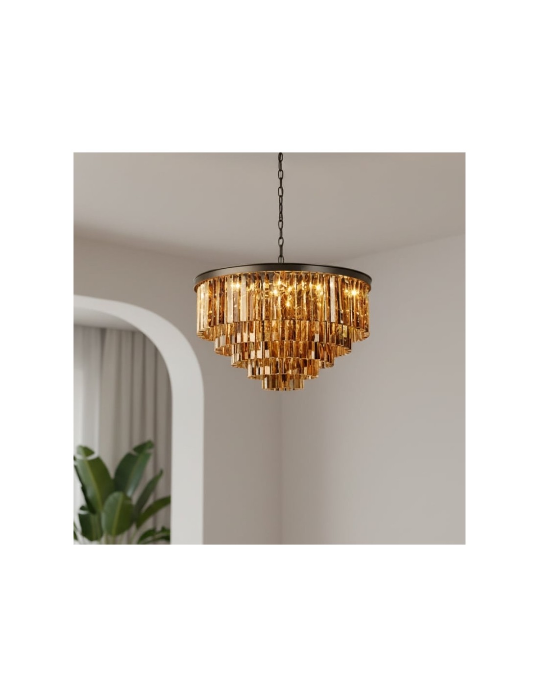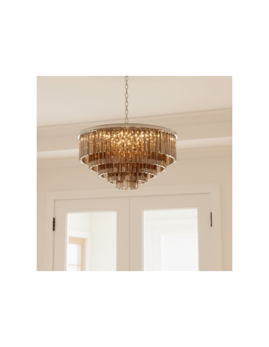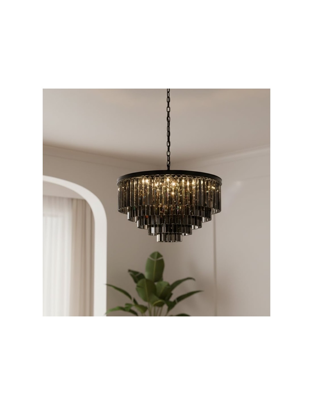 This striking round chandelier featuring layered crystal prisms and a metal frame, designed for modern and contemporary interiors. The fixture creates sparkling ambient and accent lighting for living rooms, dining rooms, foyers and bedrooms.