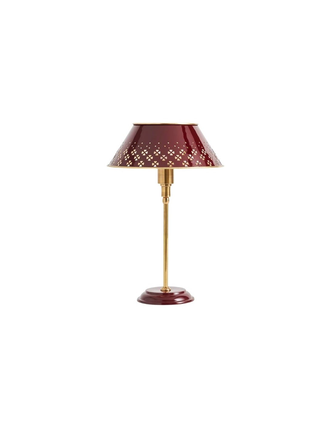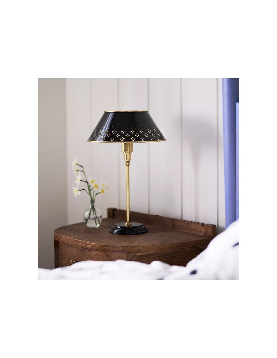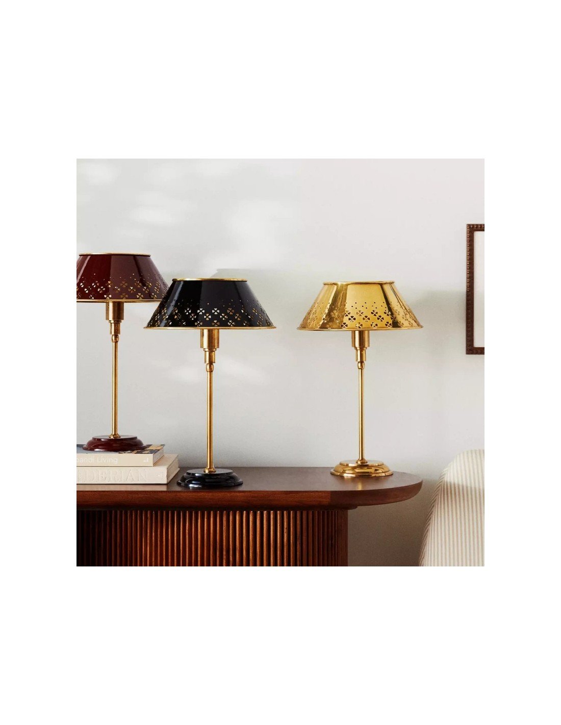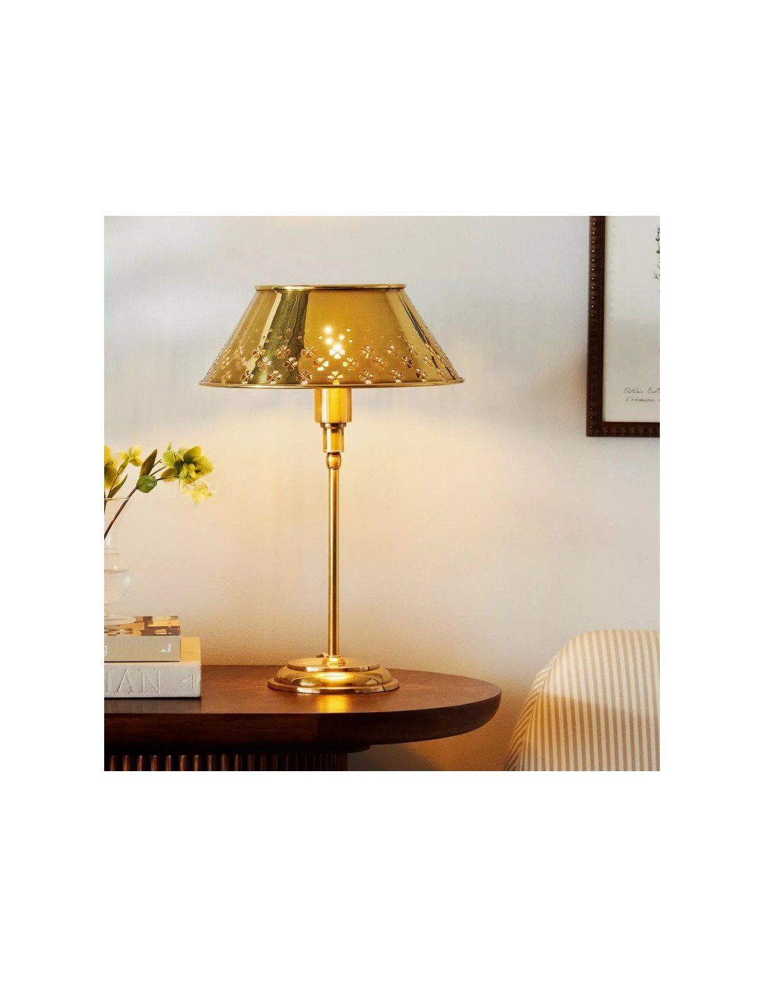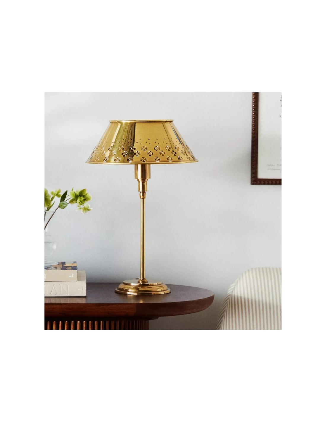 Add a vintage touch to your home with this perforated table lamp, featuring a floral motif along the border and highlighted by enameled brass accents. Inspired by the 1980s Space Age design, it’s a perfect addition to any contemporary living room or office.