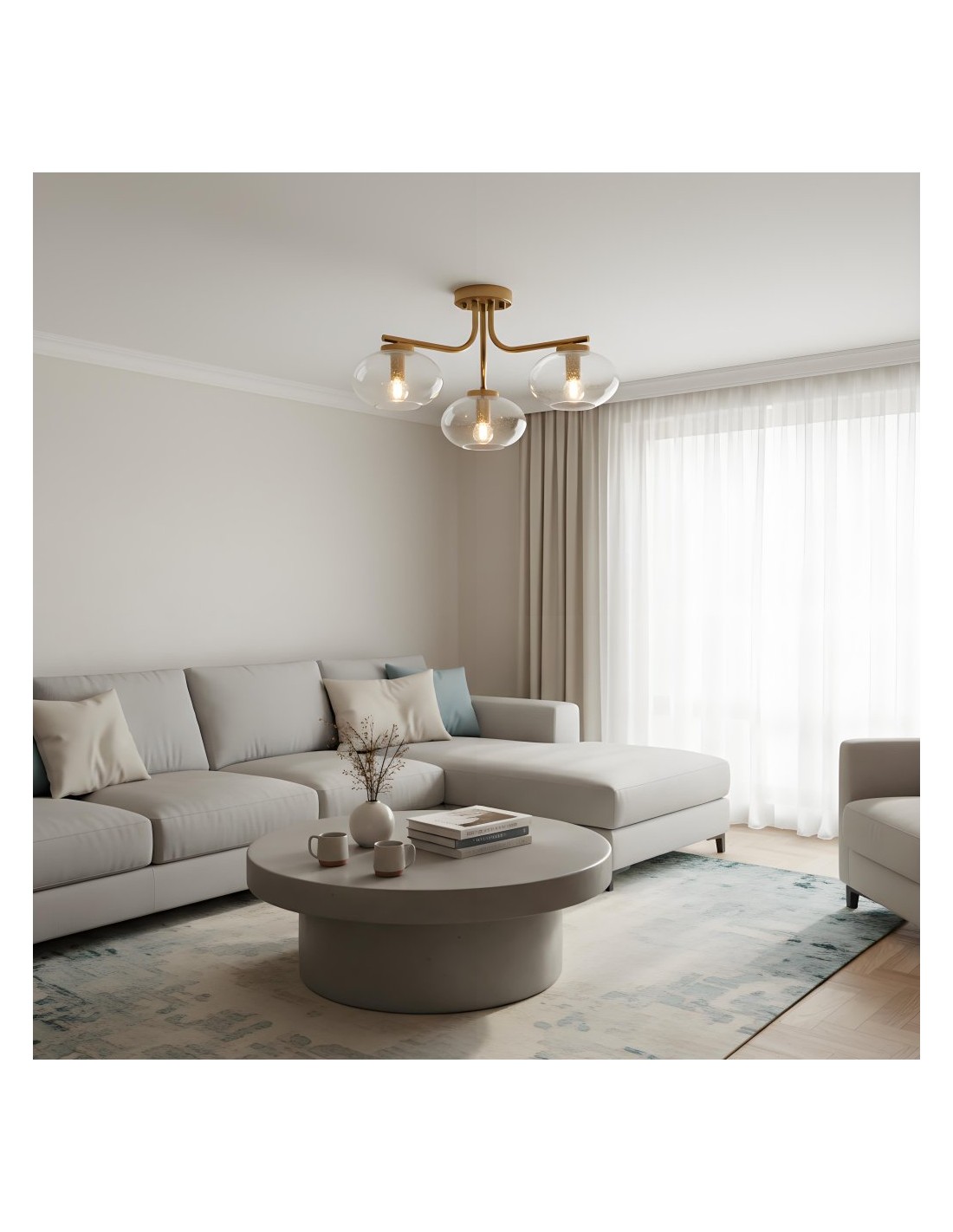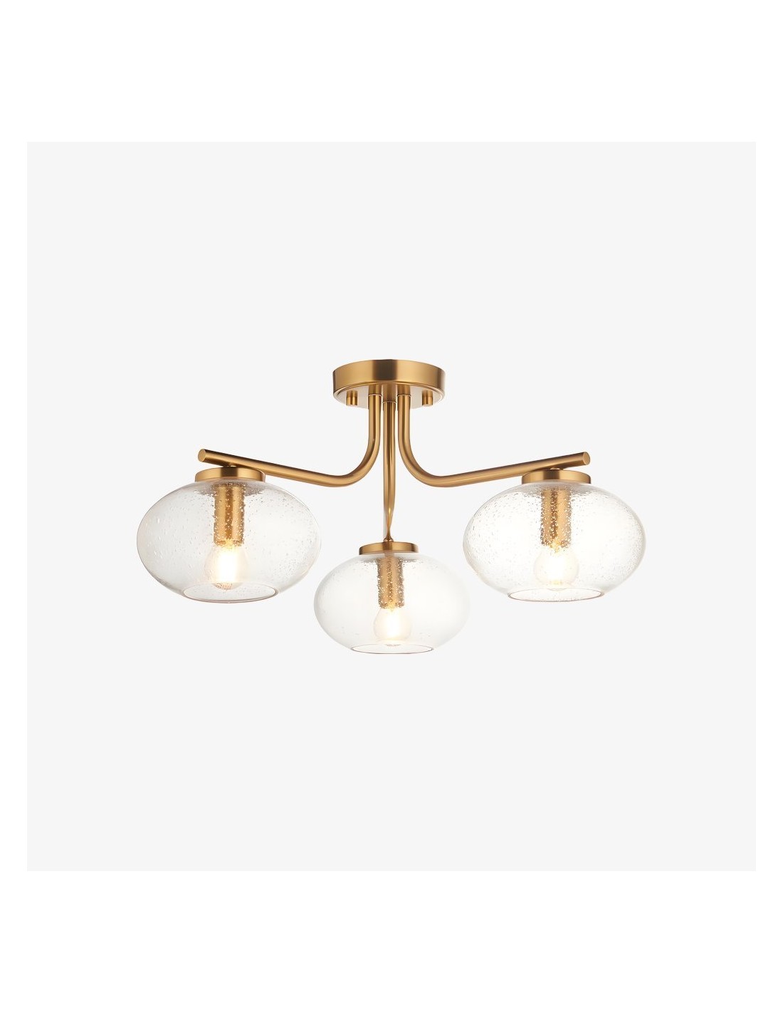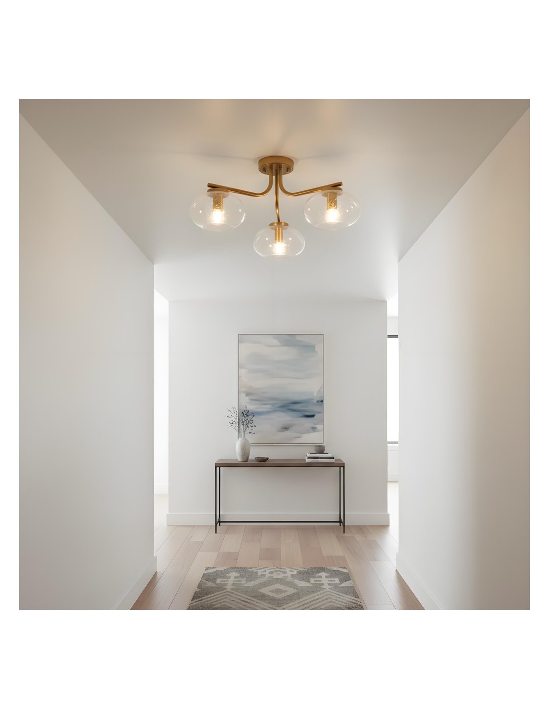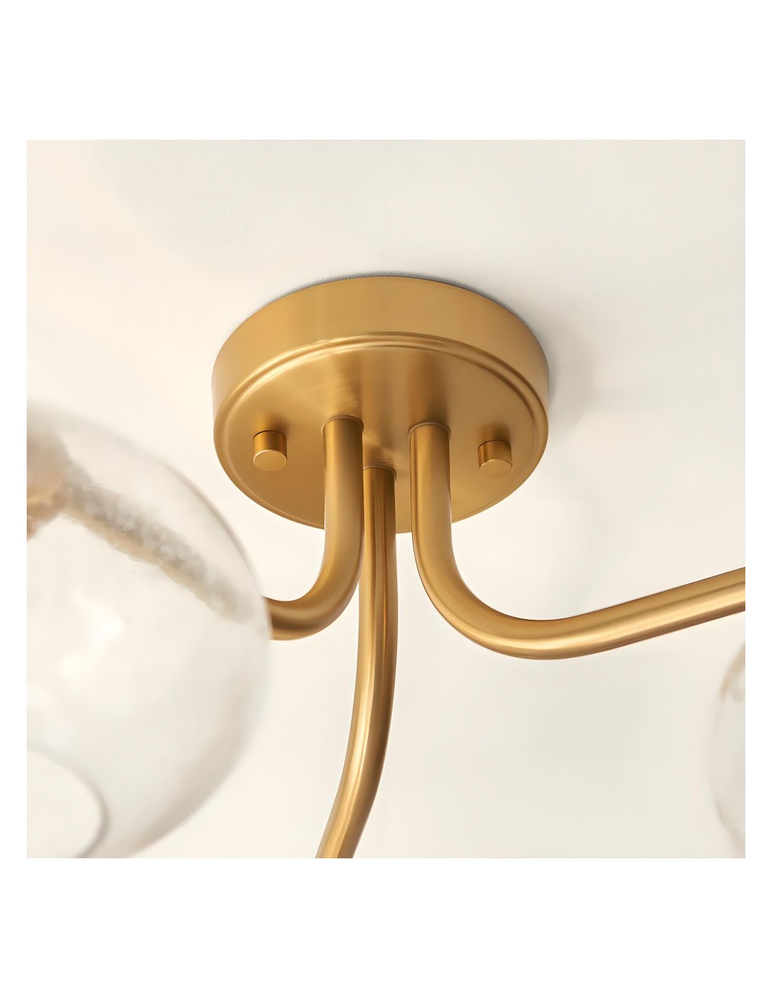 The ceiling lamp features a transparent bubble glass shade crafted using a hand-blown technique, resulting in a beautifully textured and shimmering effect under light. The brass-plated arm boasts smooth, clean lines, giving the lamp a sculptural three-dimensional feel while maintaining an elegant and understated style. It is suitable for living rooms or hallways.