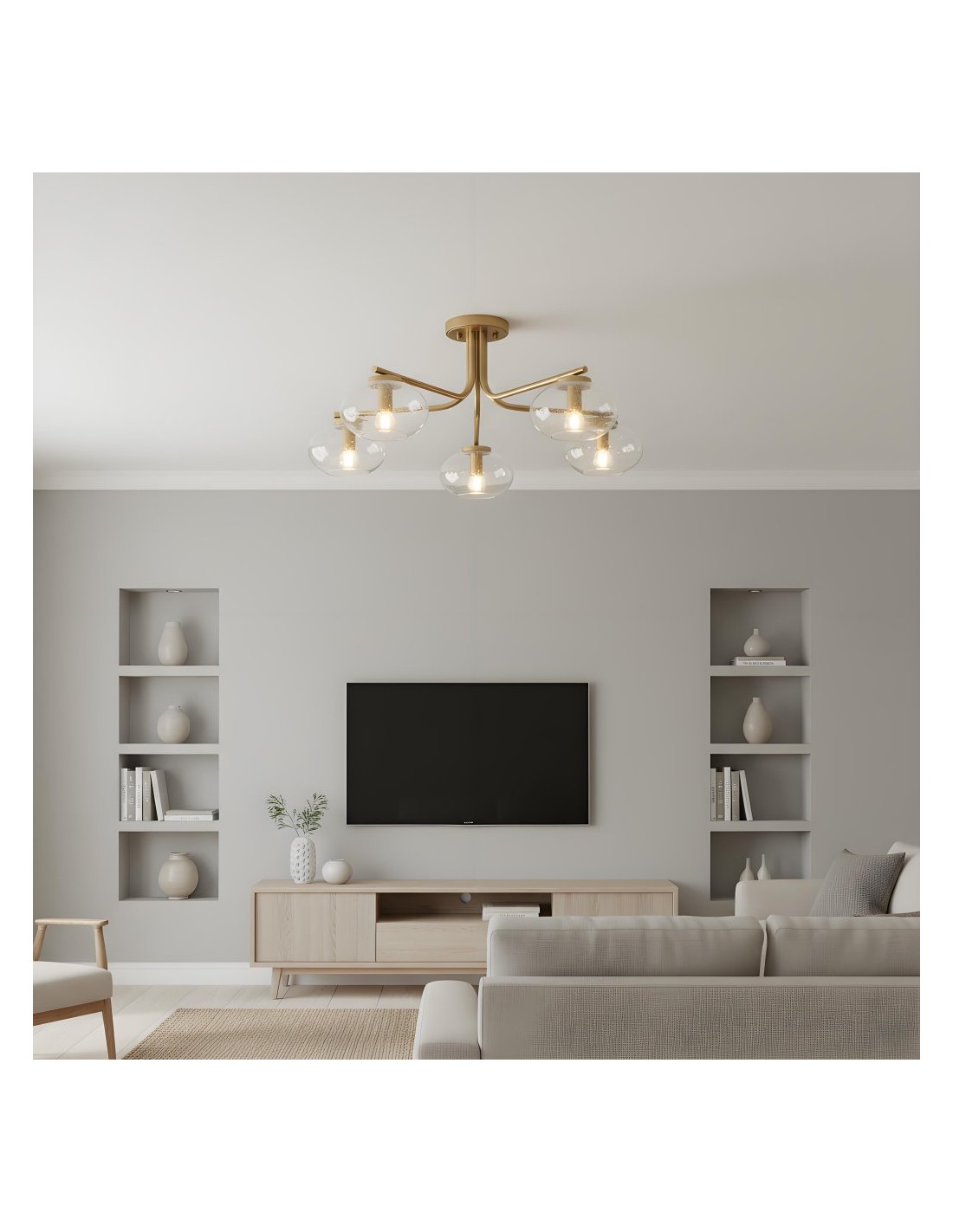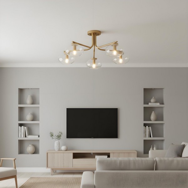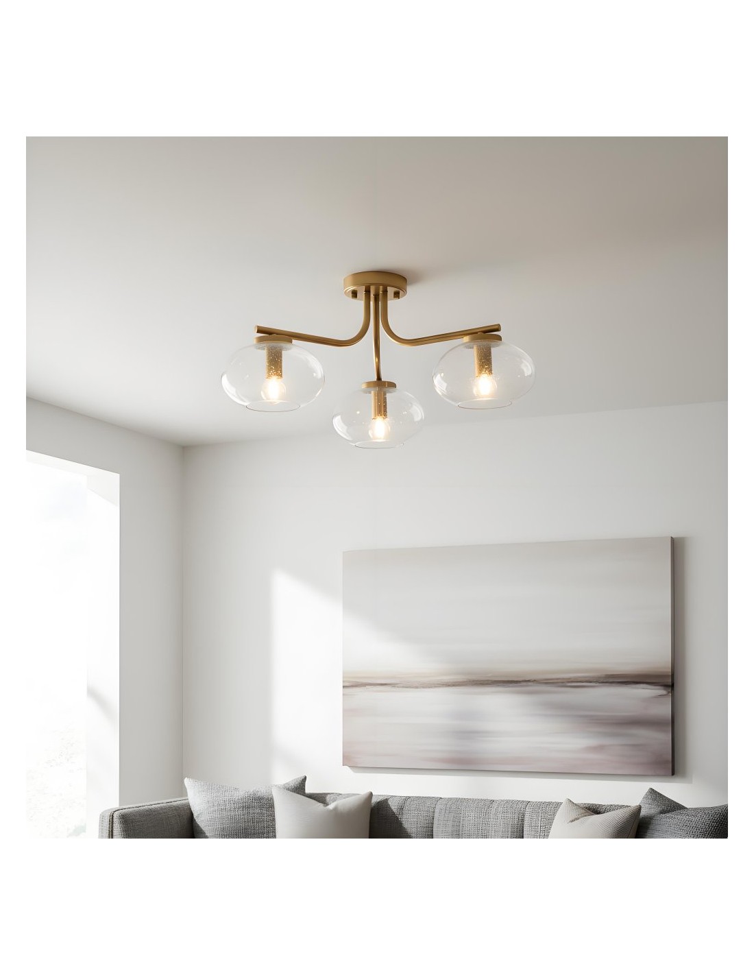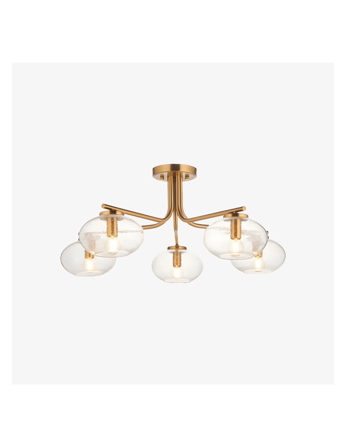 The ceiling lamp features a transparent bubble glass shade crafted using a hand-blown technique, resulting in a beautifully textured and shimmering effect under light. The brass-plated arm boasts smooth, clean lines, giving the lamp a sculptural three-dimensional feel while maintaining an elegant and understated style. It is suitable for living rooms or hallways.