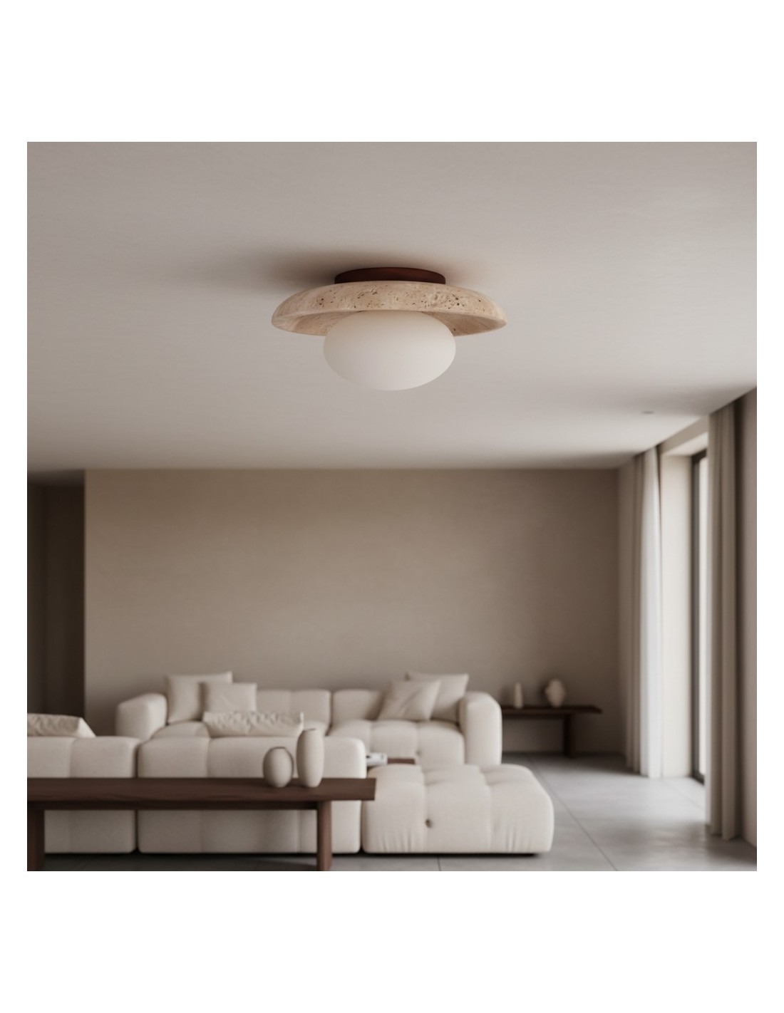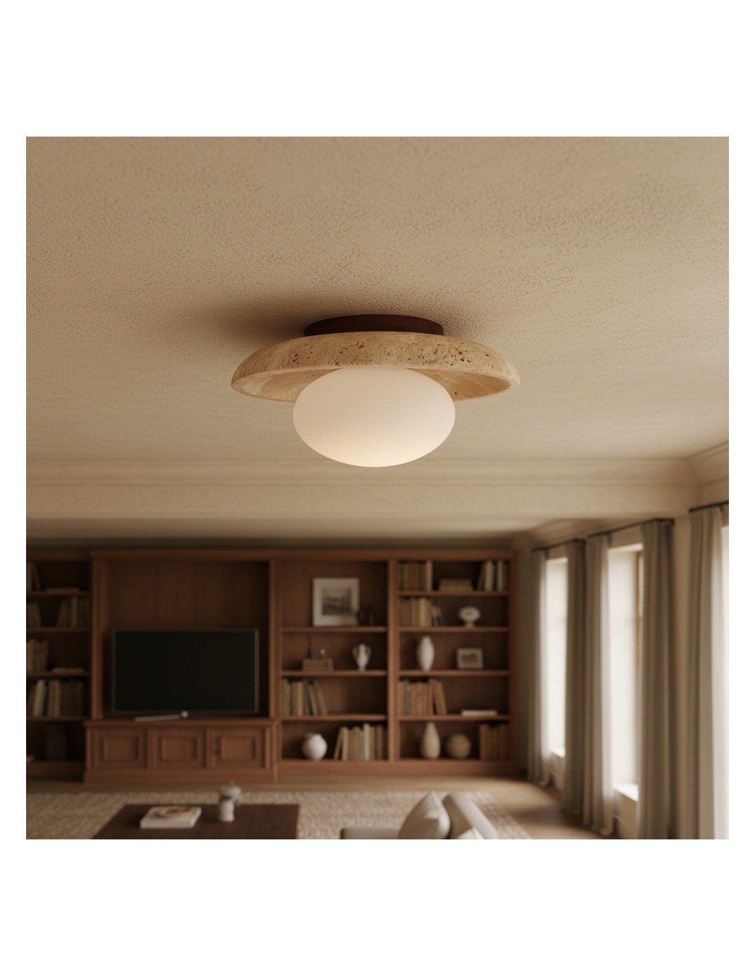 The Calivra Modern Travertine Round Ceiling Light is a refined flush mount fixture that blends natural stone texture with minimalist design. A smooth travertine-accented shade softly diffuses ambient light, creating a warm and inviting glow. This versatile ceiling lamp is ideal for hallways, bedrooms, kitchens, and living spaces.