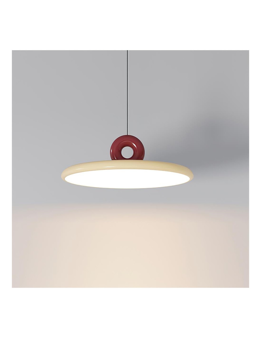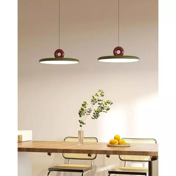The Pendant Lamp is a delightful blend of contemporary design and playful aesthetics. This lamp features a sleek, wide-brimmed circular shade in a rich, matte green finish that effortlessly complements the bold, burgundy red accent of the lamp's top, shaped like a modernist loop. Ideal for modern kitchens, dining areas, or creative spaces, the Pendant Lamp adds a splash of color and a modern twist to any decor, infusing the environment with a lively, artistic vibe.