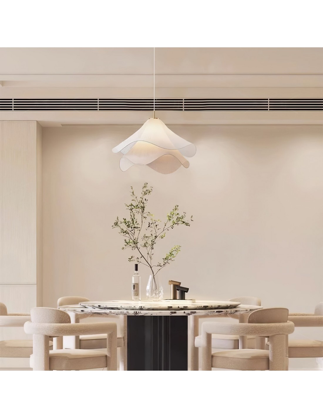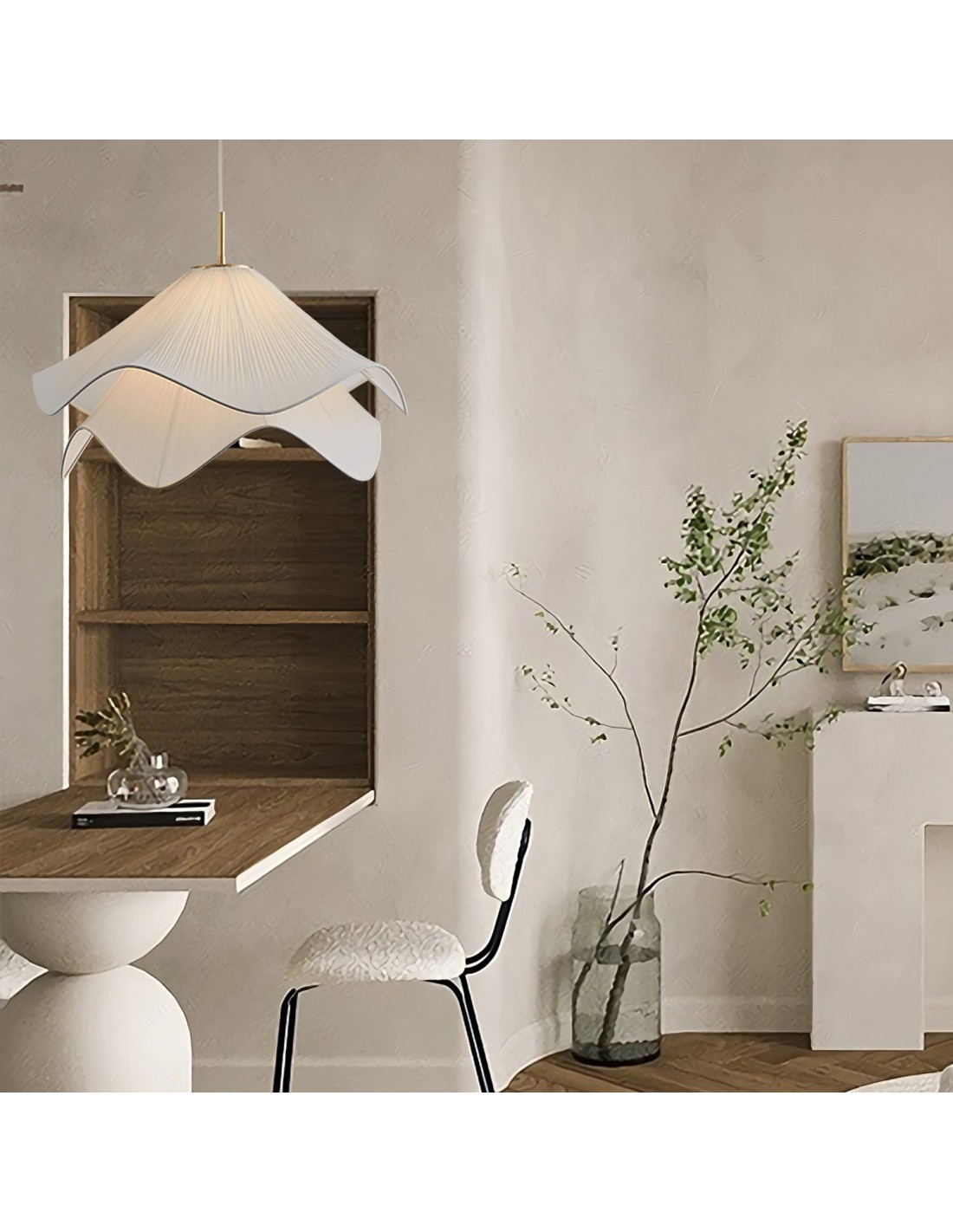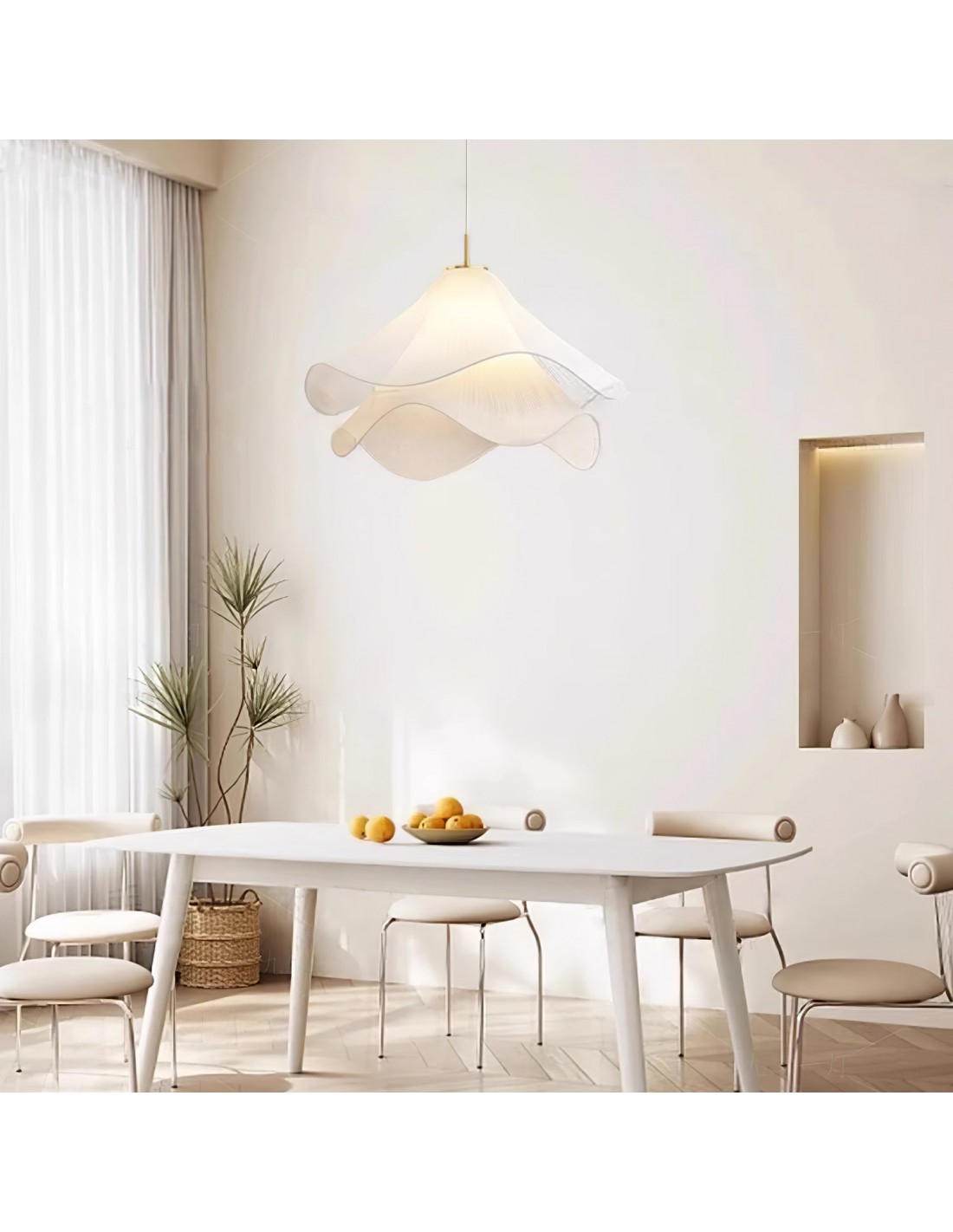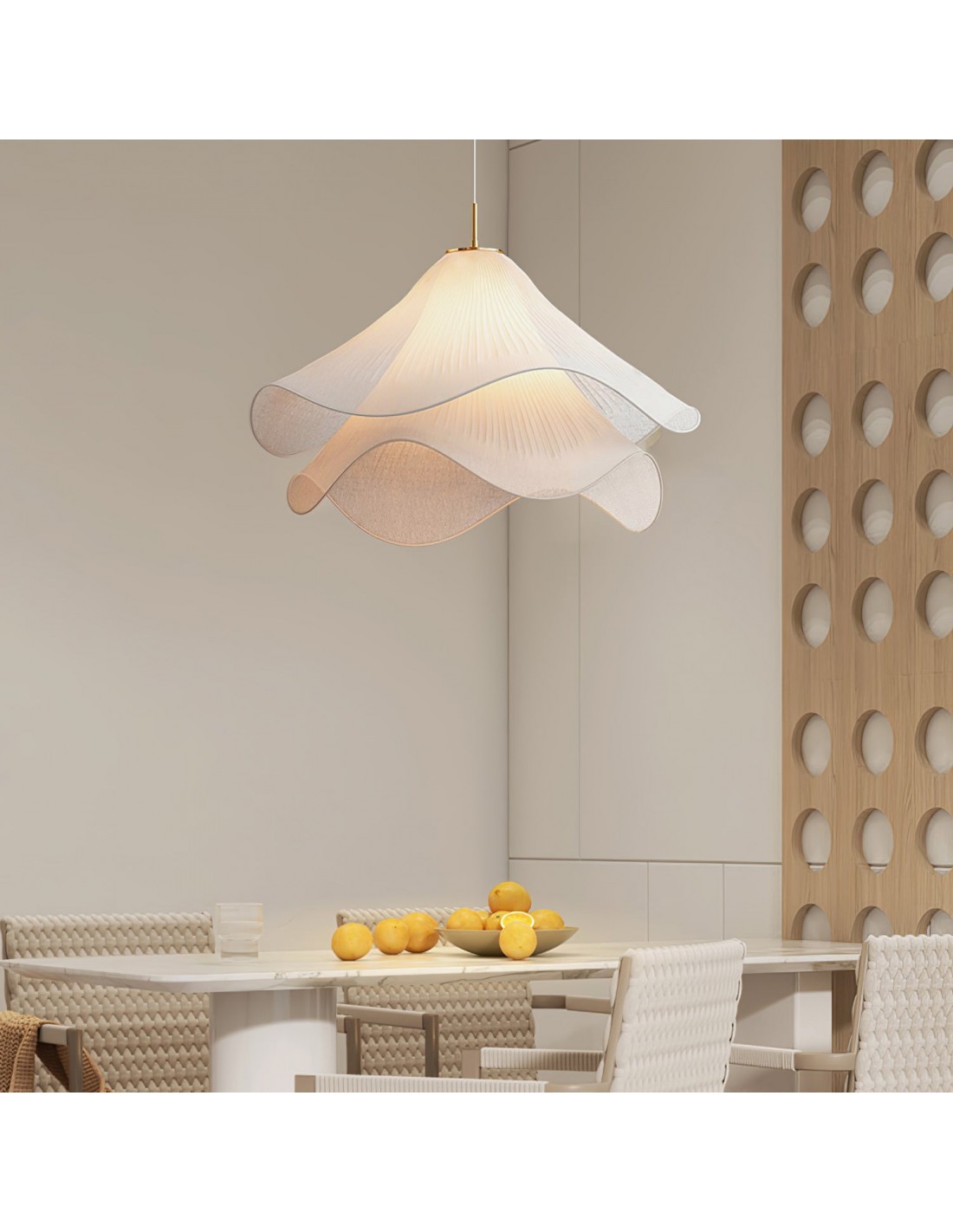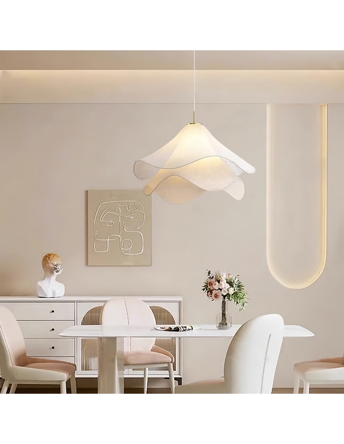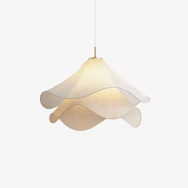 The Ethereal Bloom Pendant Light is an elegant and graceful suspension piece featuring multiple layers of light white fabric with delicate pleats, creating an energetic appearance reminiscent of blooming flowers or swirling skirts. Soft light diffuses through the layered shades, accentuating the gleaming brass hardware of the pendant. This delicate look will float beautifully above dining tables, living rooms, or bedrooms.