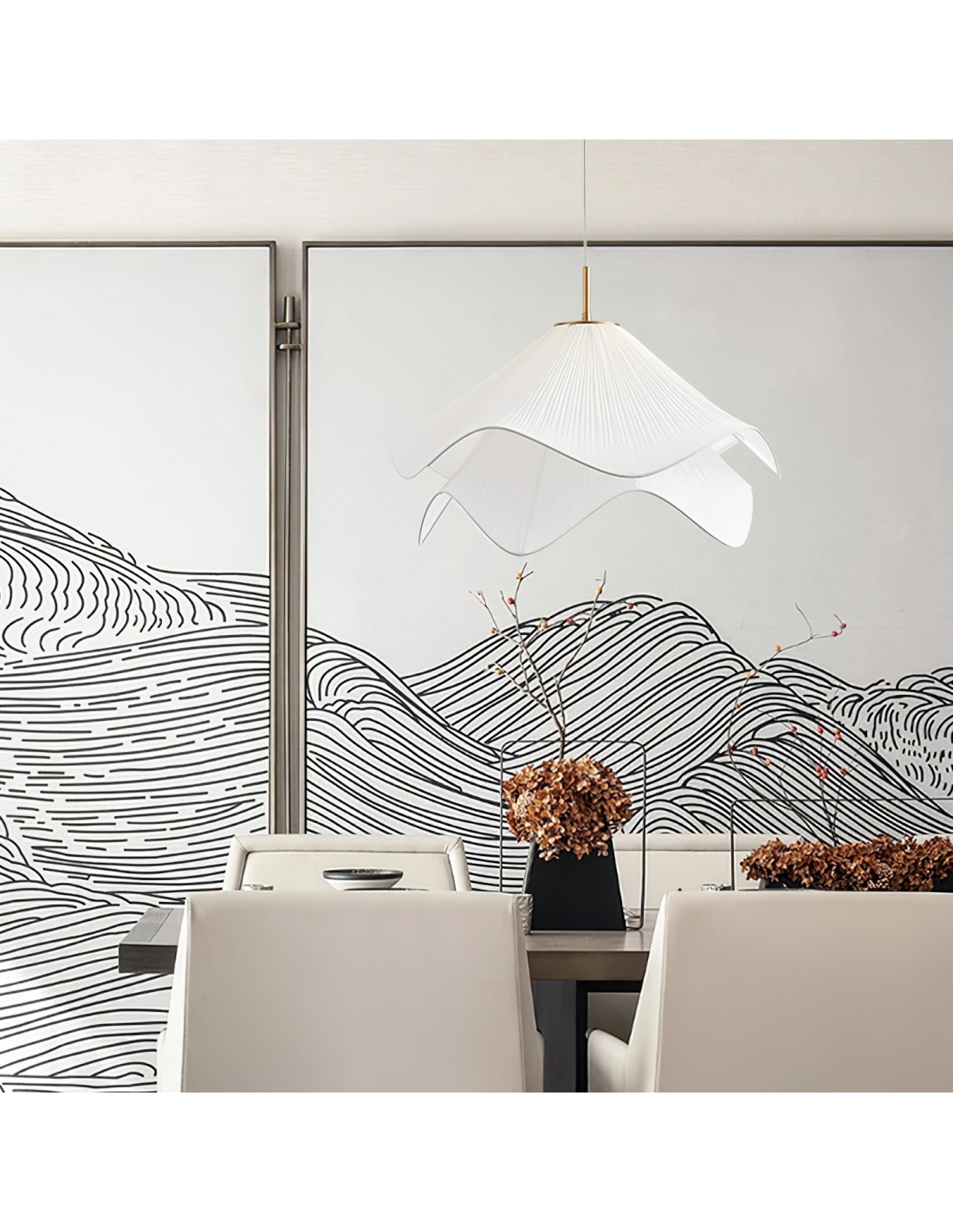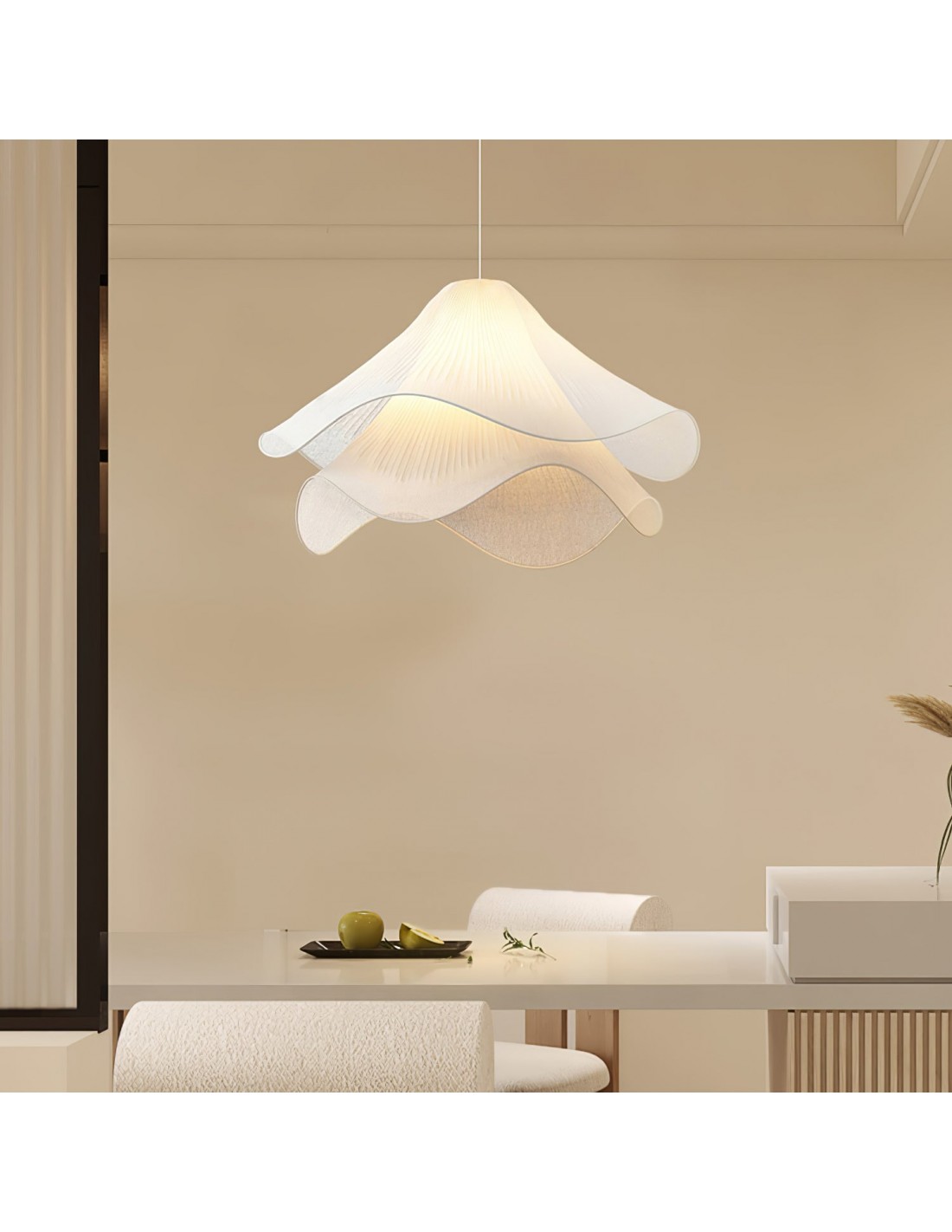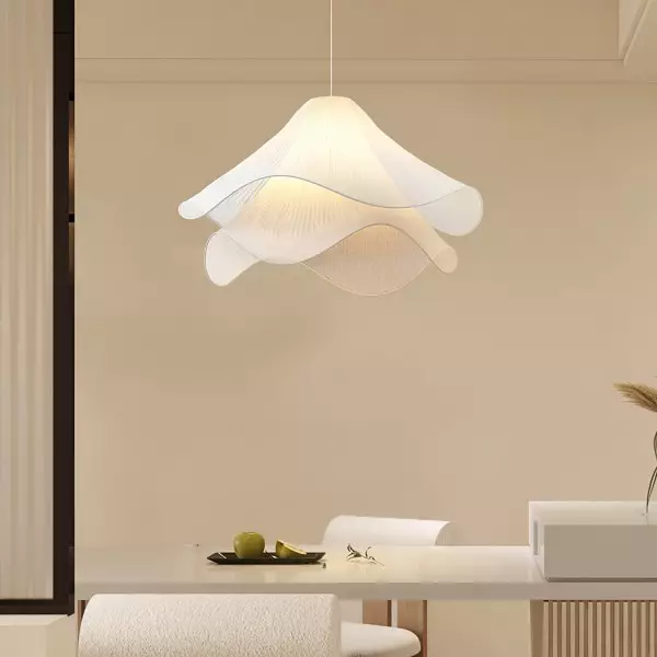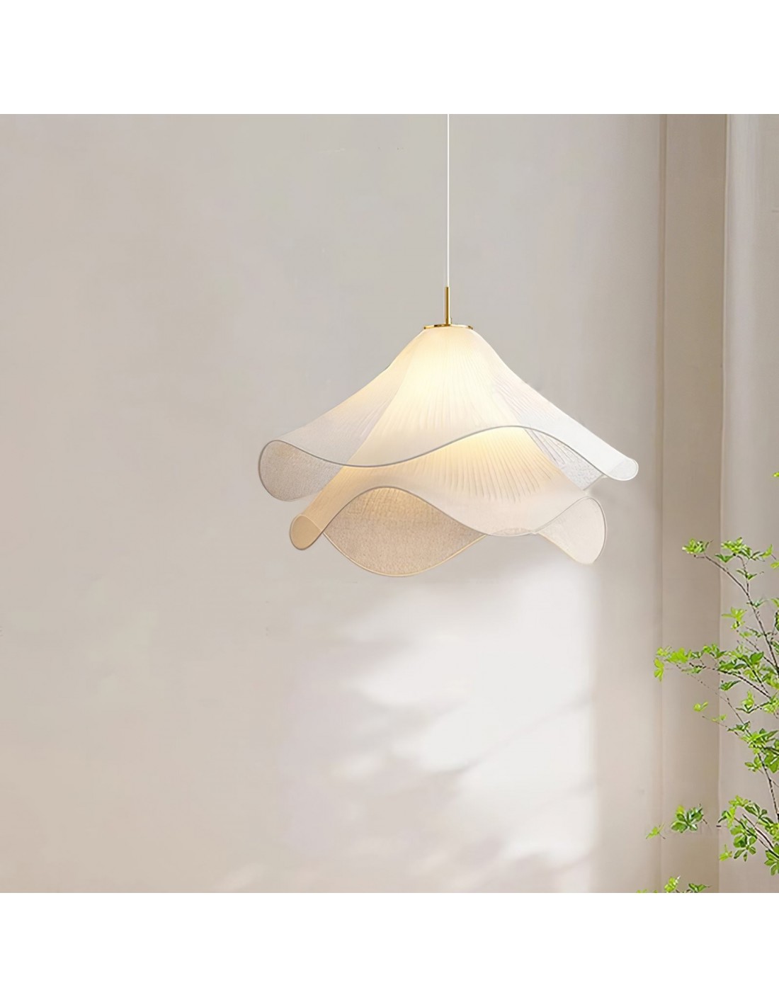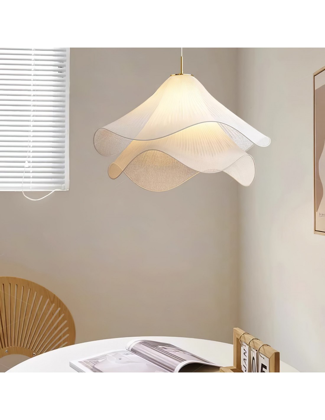 The Ethereal Bloom Pendant Light is an elegant and graceful suspension piece featuring multiple layers of light white fabric with delicate pleats, creating an energetic appearance reminiscent of blooming flowers or swirling skirts. Soft light diffuses through the layered shades, accentuating the gleaming brass hardware of the pendant. This delicate look will float beautifully above dining tables, living rooms, or bedrooms.
