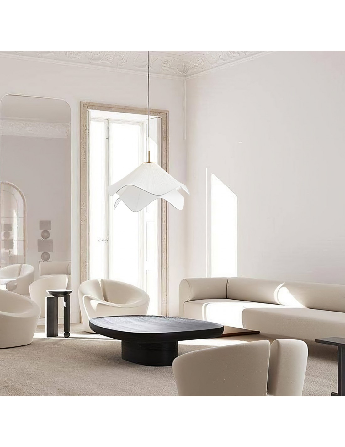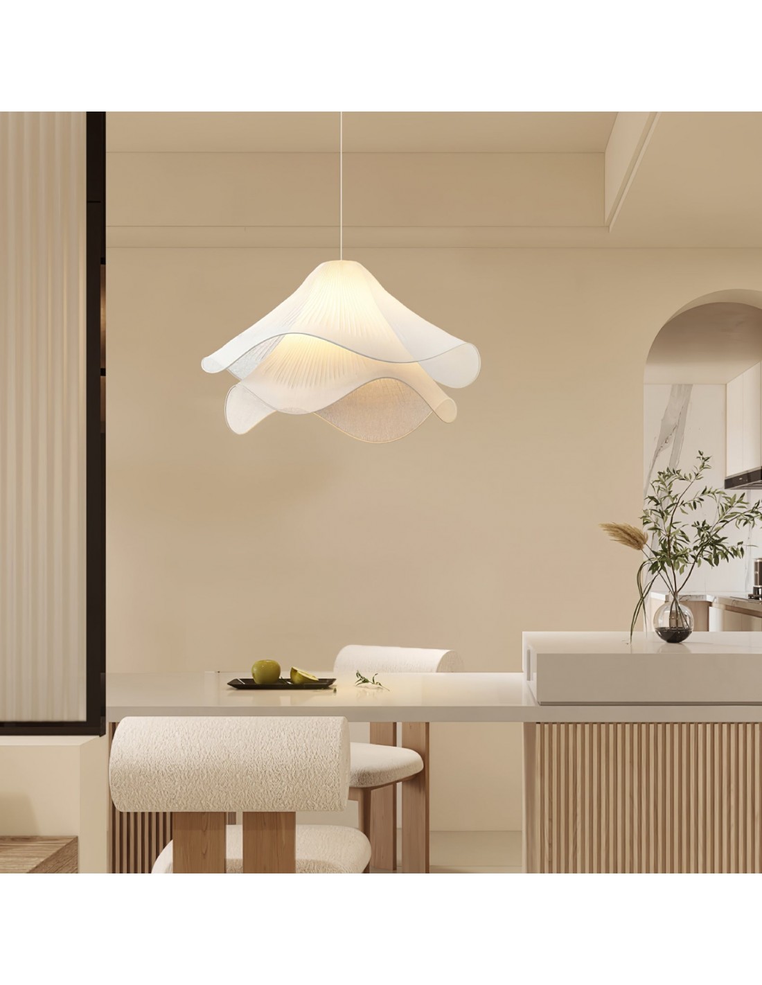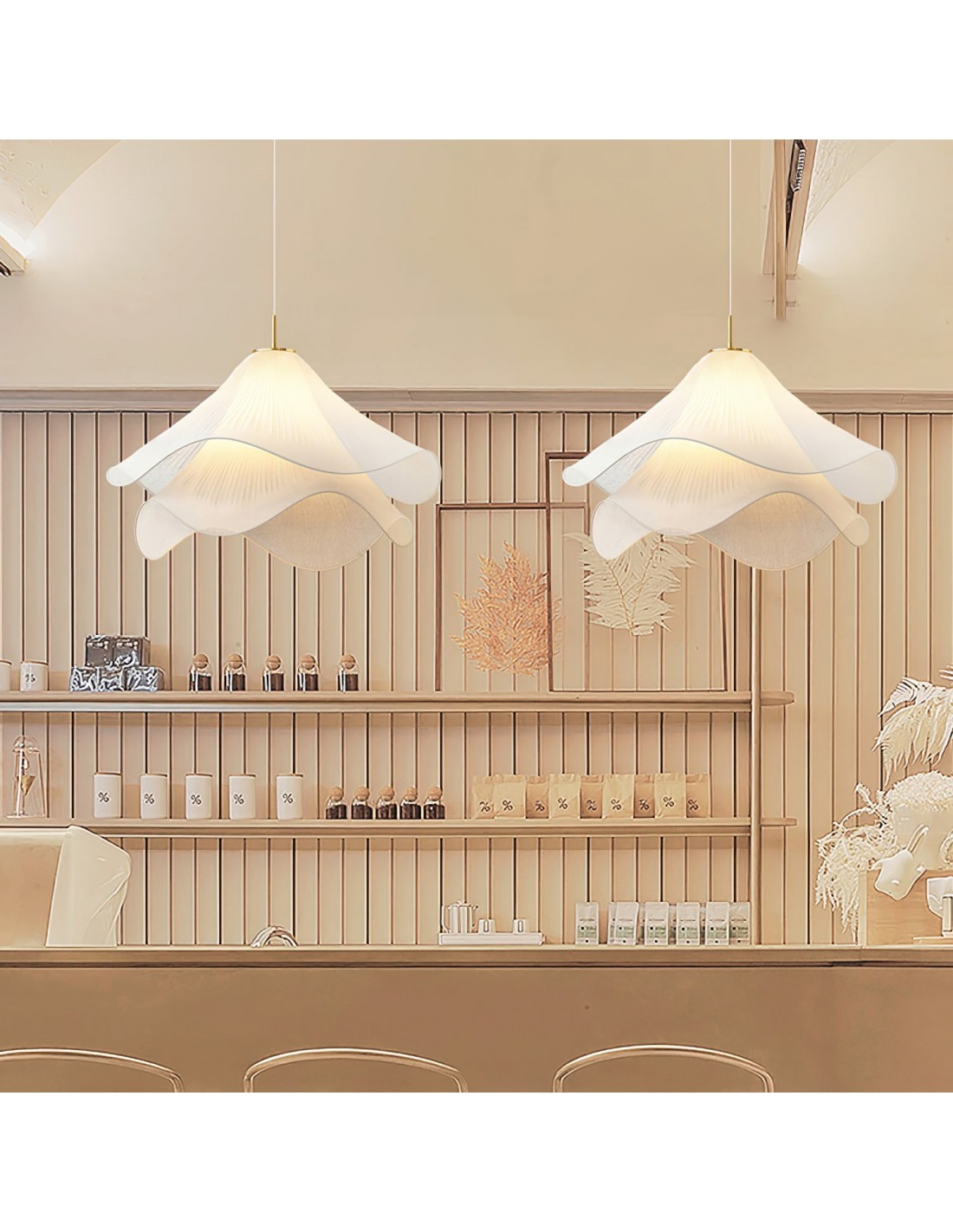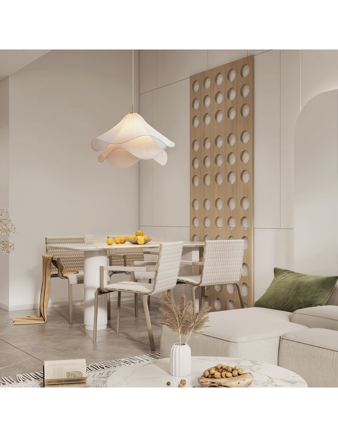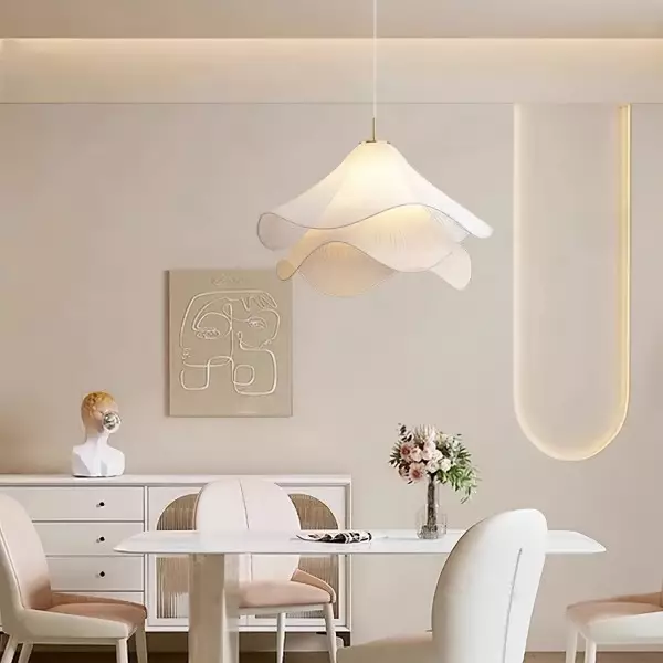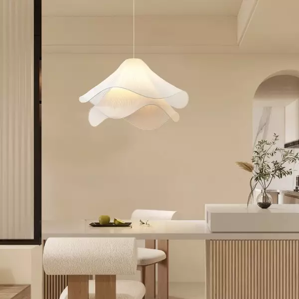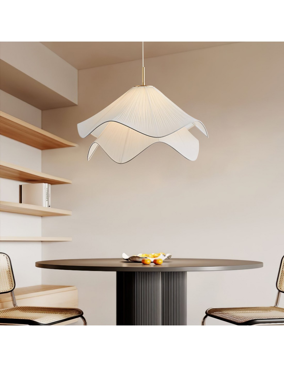 The Ethereal Bloom Pendant Light is an elegant and graceful suspension piece featuring multiple layers of light white fabric with delicate pleats, creating an energetic appearance reminiscent of blooming flowers or swirling skirts. Soft light diffuses through the layered shades, accentuating the gleaming brass hardware of the pendant. This delicate look will float beautifully above dining tables, living rooms, or bedrooms.