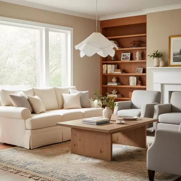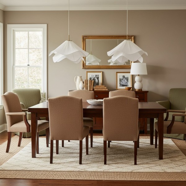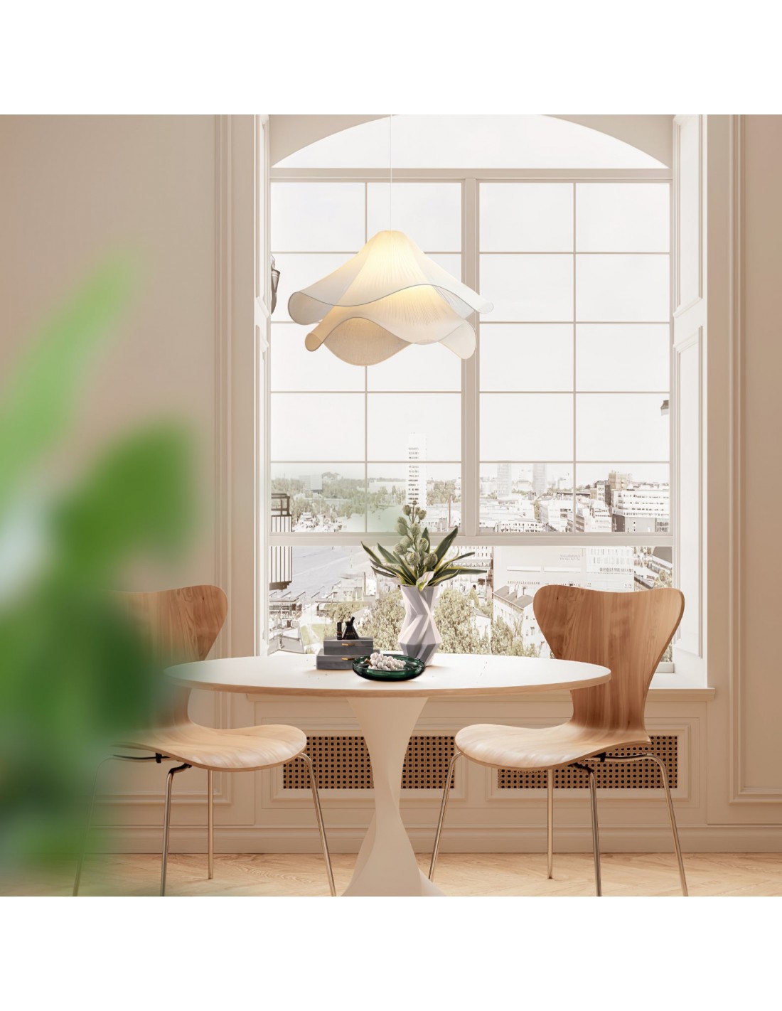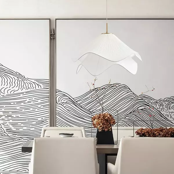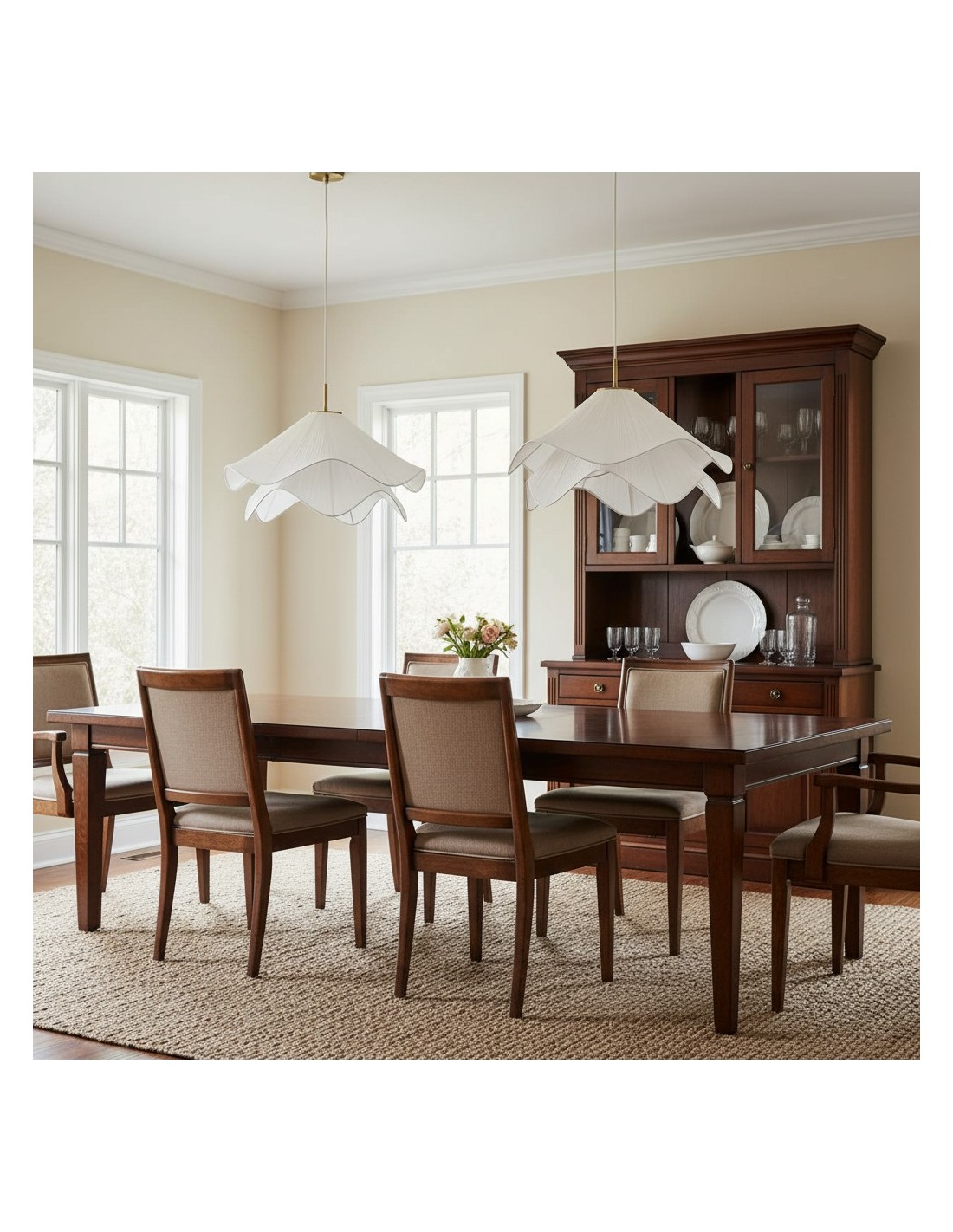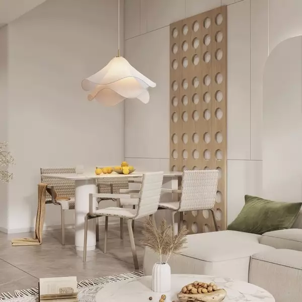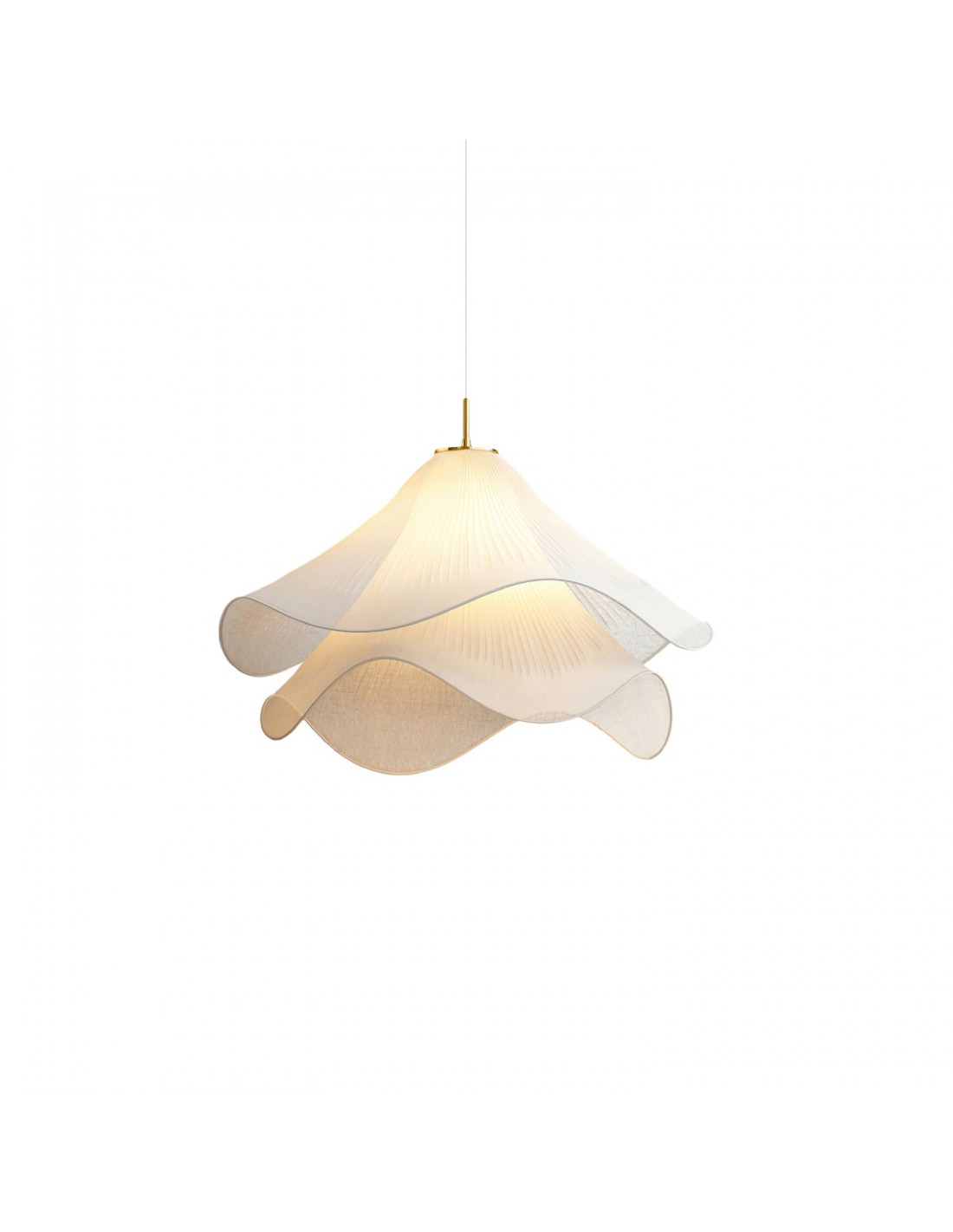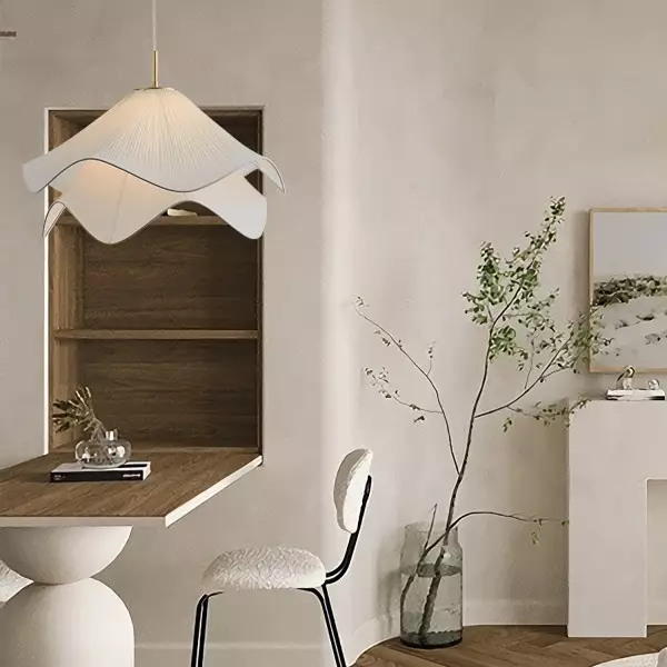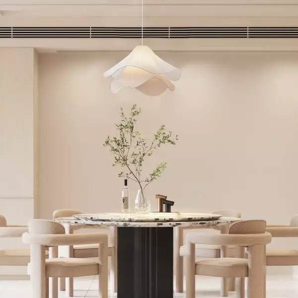 The Ethereal Bloom Pendant Light is an elegant and graceful suspension piece featuring multiple layers of light white fabric with delicate pleats, creating an energetic appearance reminiscent of blooming flowers or swirling skirts. Soft light diffuses through the layered shades, accentuating the gleaming brass hardware of the pendant. This delicate look will float beautifully above dining tables, living rooms, or bedrooms.