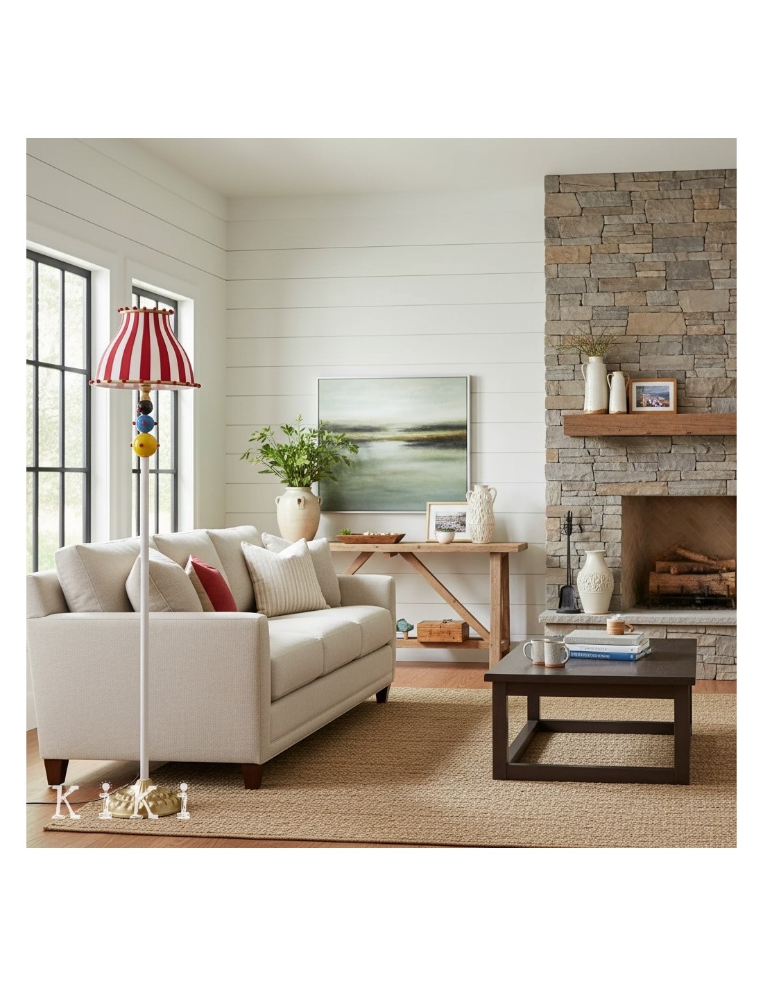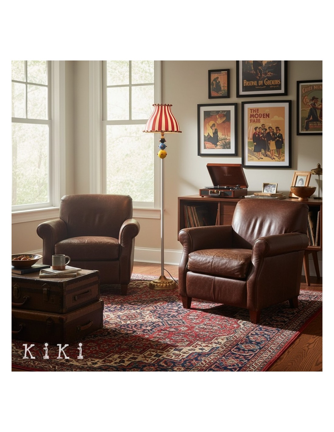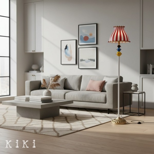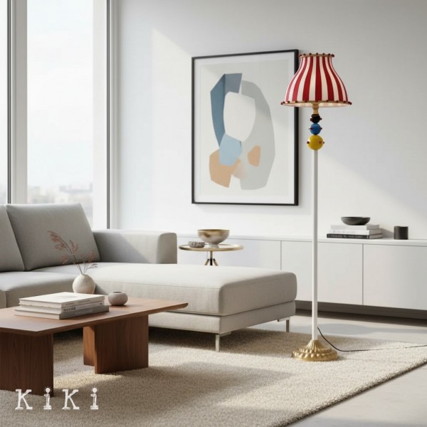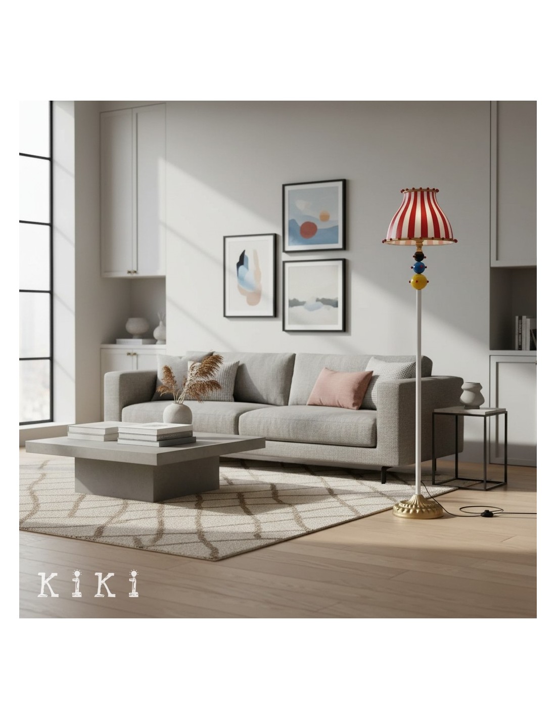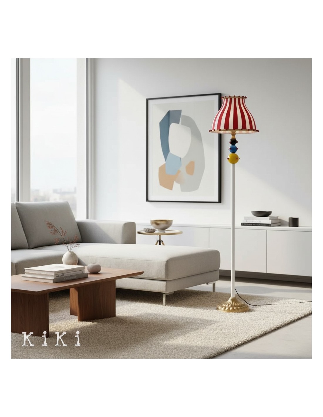 The Festilo Circus floor lamp features a striking sculptural design with a curved arch profile, adding both height and visual drama to any interior space. Its combination of metal and glass materials creates a refined yet playful aesthetic, making it a standout piece in contemporary and artistic homes.