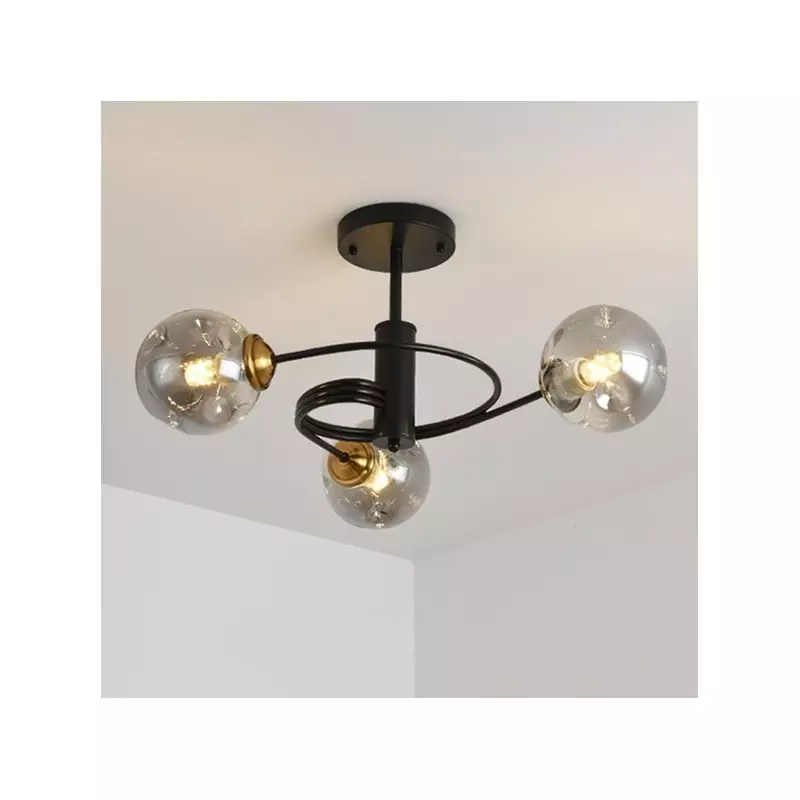 Globe Combination Pendant Lamp features a circular body attached by glass balls like a tornado. With amber or smoky gray glass, the graceful color scheme make it eye-catching in any room. Available in two sizes and two finishes.