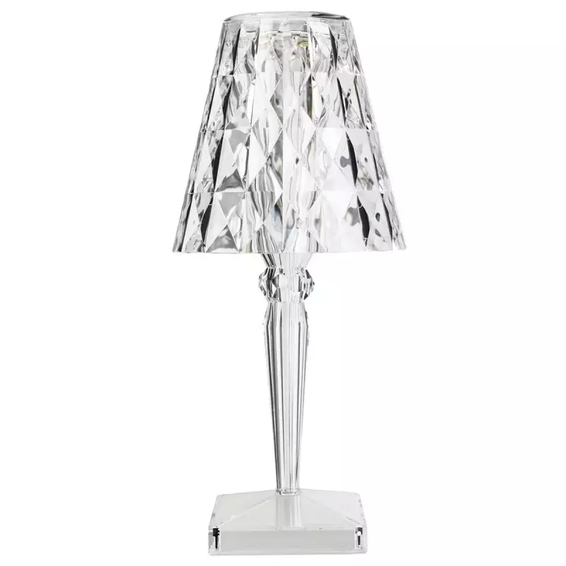 The Battery Lamp shows an interesting way of being a table lamp as a movable light source. The classic Baroque style is combined with the rechargeable LED light source, which is elegant and innovative. This small and delicate battery table lamp can be used both indoors and outdoors. Made from PMMA, its prism like lampshade is composed of regular patterns. When illuminated, Battery LED light can create a brilliant shadow like a solar flower. This dynamic view will let people indulge in the gorgeous visual feeling. There is a switch button on the base. On the other side, there is a usb interface available for charge.