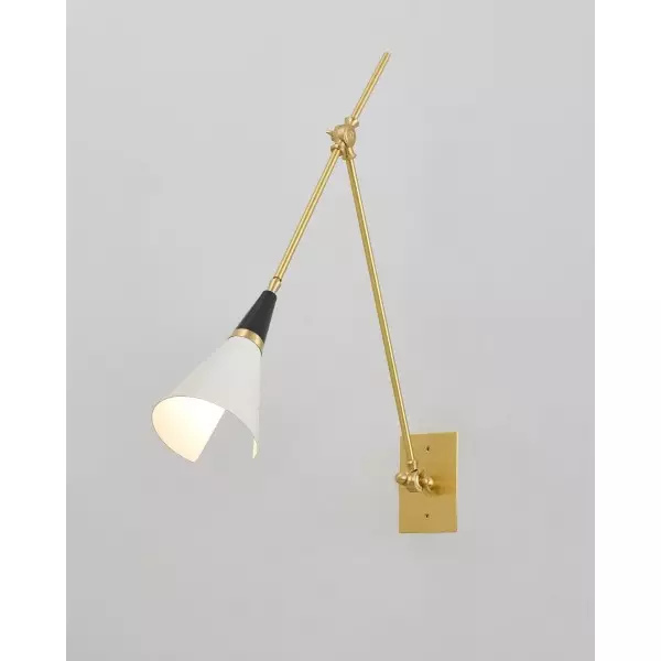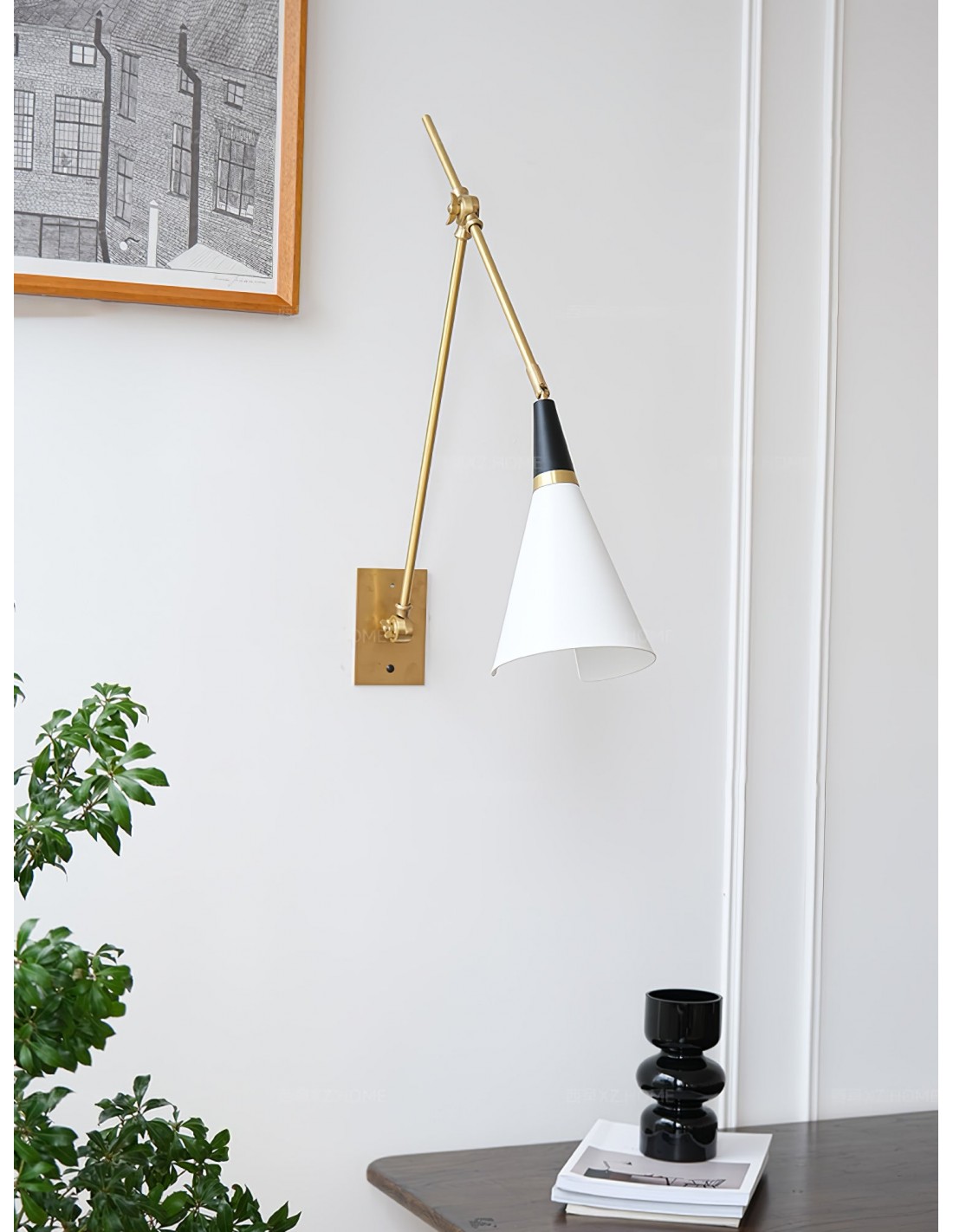 This vintage metal adjustable swing arm wall lamp has two articulated joints and a swivel mechanism. Its unique angled shade design allows for flexible customization. Elevate your home decor with this timeless and adjustable wall lamp.
