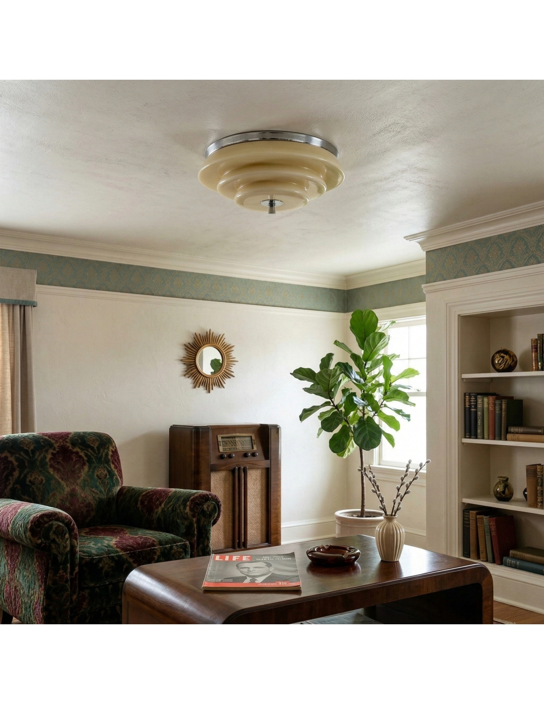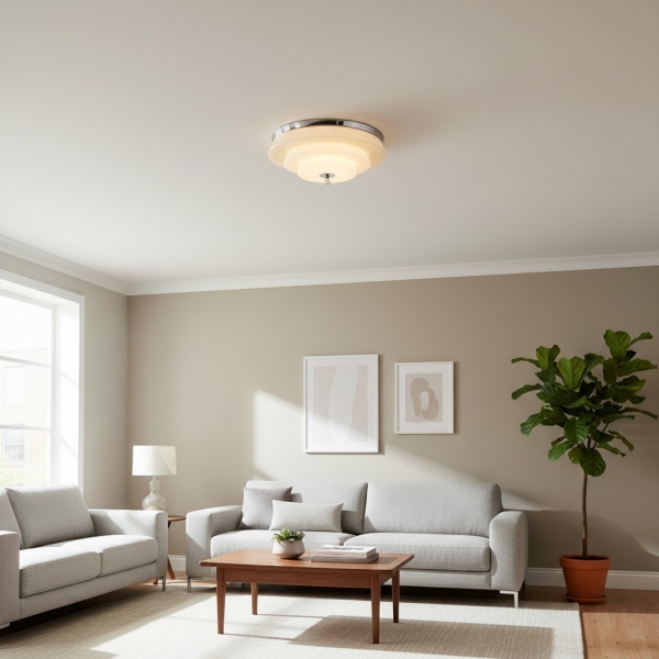 This decorative ceiling light features a tiered ripple silhouette with softly rounded curves, evoking retro elegance and timeless charm. Its sculptural design gently diffuses light, creating a calm atmosphere for hallways and bedrooms.