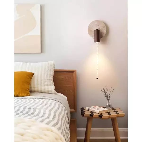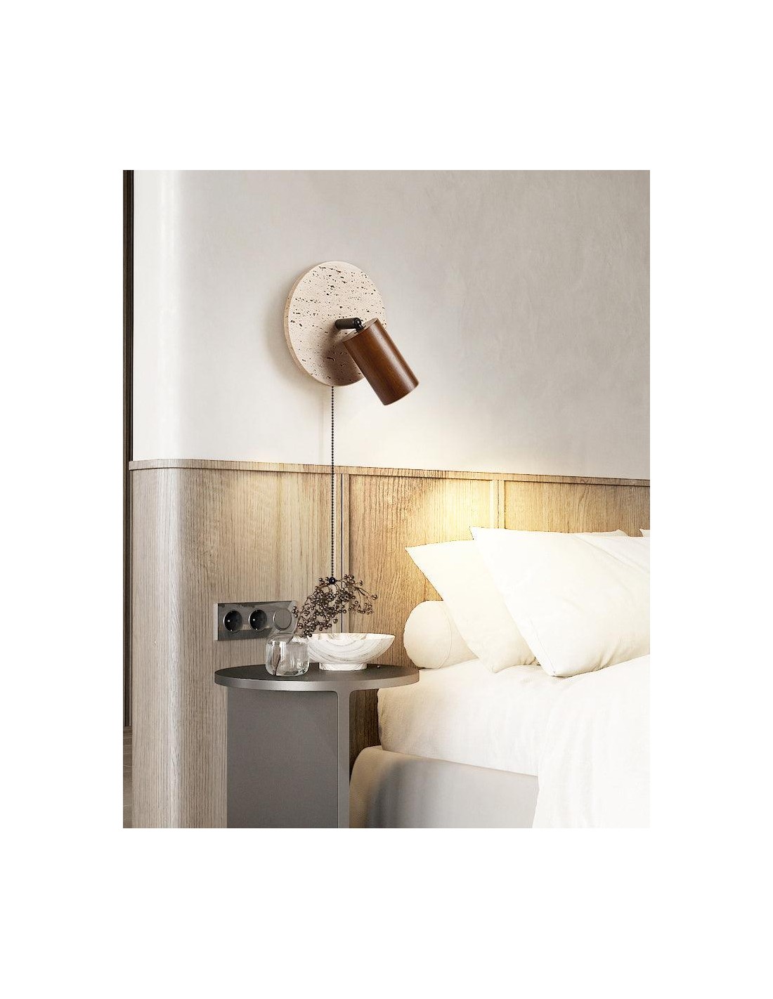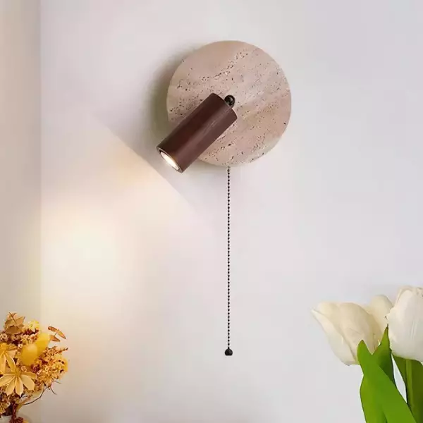 Discover the minimalist beauty of the Vintage Yellow Travertine Wall Lamp, a light fixture that brings a light and modern touch to interior decor with its pure lines and the perfect combination of natural materials. The natural rusticity of the yellow travertine and the warm sheen of the wood complement each other beautifully. The pull-chain switch adds a hint of vintage charm, offering convenience and practicality. Whether used alone or in pairs, this lamp provides soft yet focused lighting, ideal for creating a cozy reading nook or enhancing the ambiance of hallways and entryways.
