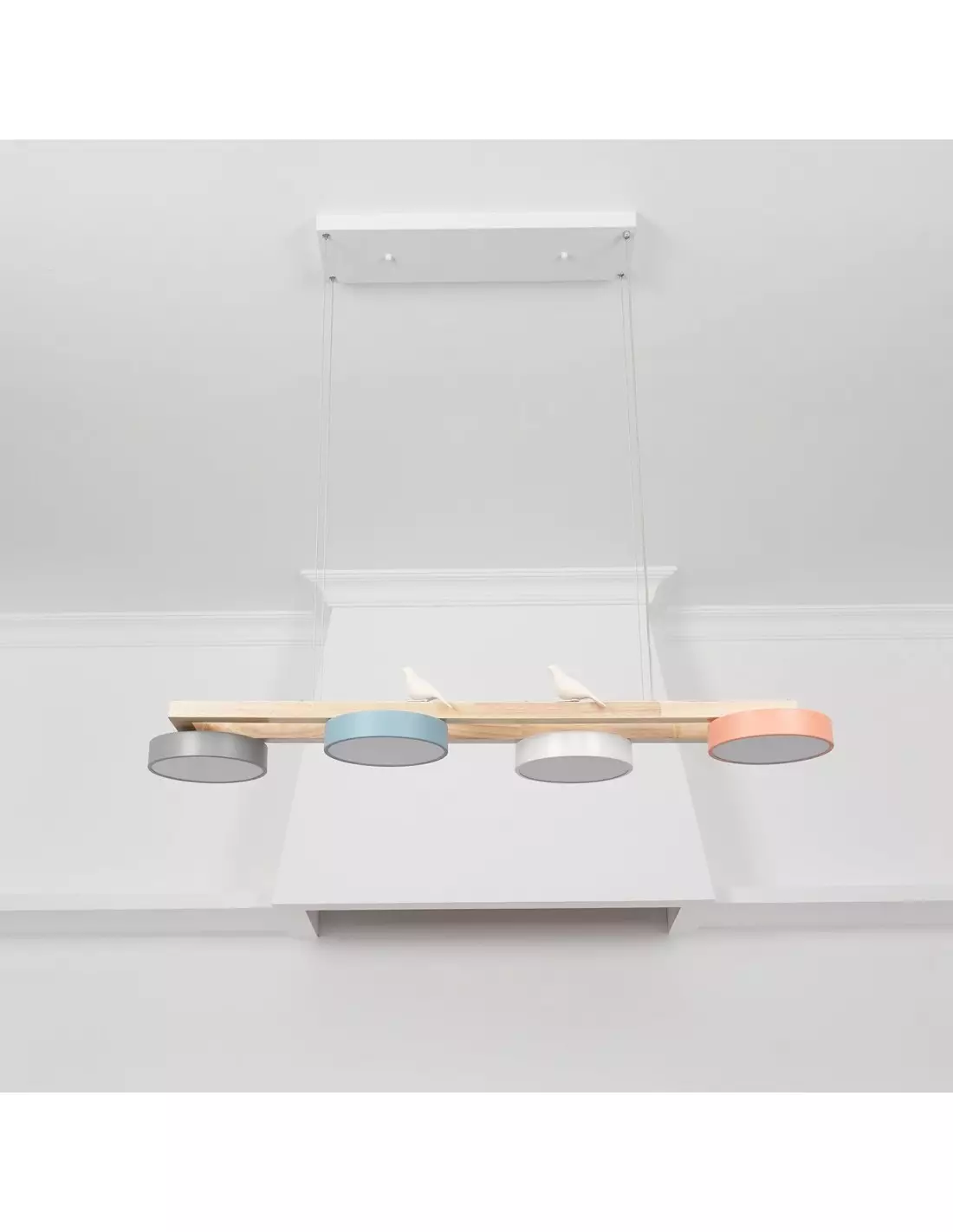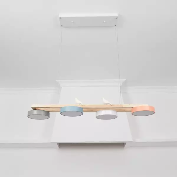 This New Style Fashion Bird Long Chandelier blends nature-inspired elements with modern design, featuring a wooden beam that elegantly supports three minimalist lampshades. The subtle addition of two delicate bird figurines perched atop the beam adds a serene, making it a perfect piece for spaces that seek to combine contemporary style with organic accents. Ideal for placement above a dining table or in a softly styled living room, this light fixture not only illuminates spaces but also serves as a focal point of artistic decor.