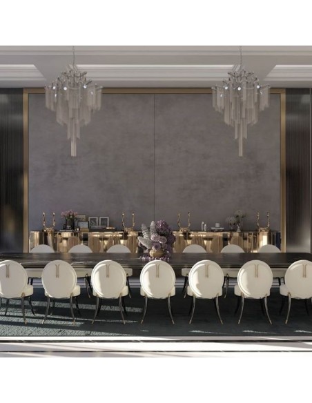 Stream Suspension is an impressive presence in any room. Like other work, Stream’s design exploits the physical characteristics of the materials used to envelop a room in a unique, immersive light. Here, over seven kilometers of metal chain appear to flow down from the undulating, nickel-plated frame. These cascading tiers project a streaking, yet tranquil, shadow throughout the room.