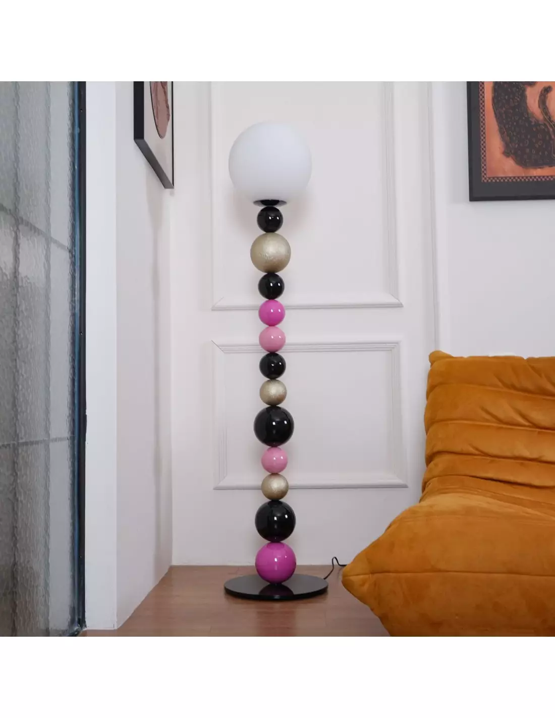 Introducing the Modern Gourd Ball Floor Lamp, a true statement piece that combines whimsy and elegance. This floor lamp stands out with its vertical array of colorful spheres, including shades of pink, black, gold, and white, each contributing a playful yet chic vibe to any space. With its vibrant colors and striking design, this lamp is not just a source of light but a centerpiece that sparks conversation and admiration.