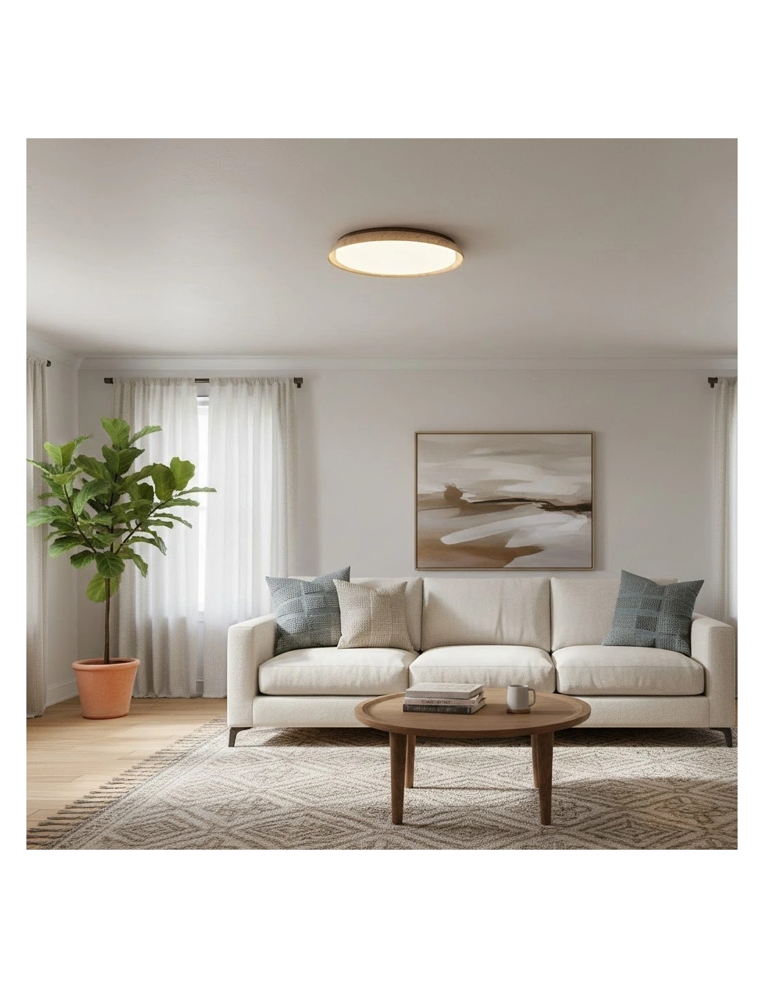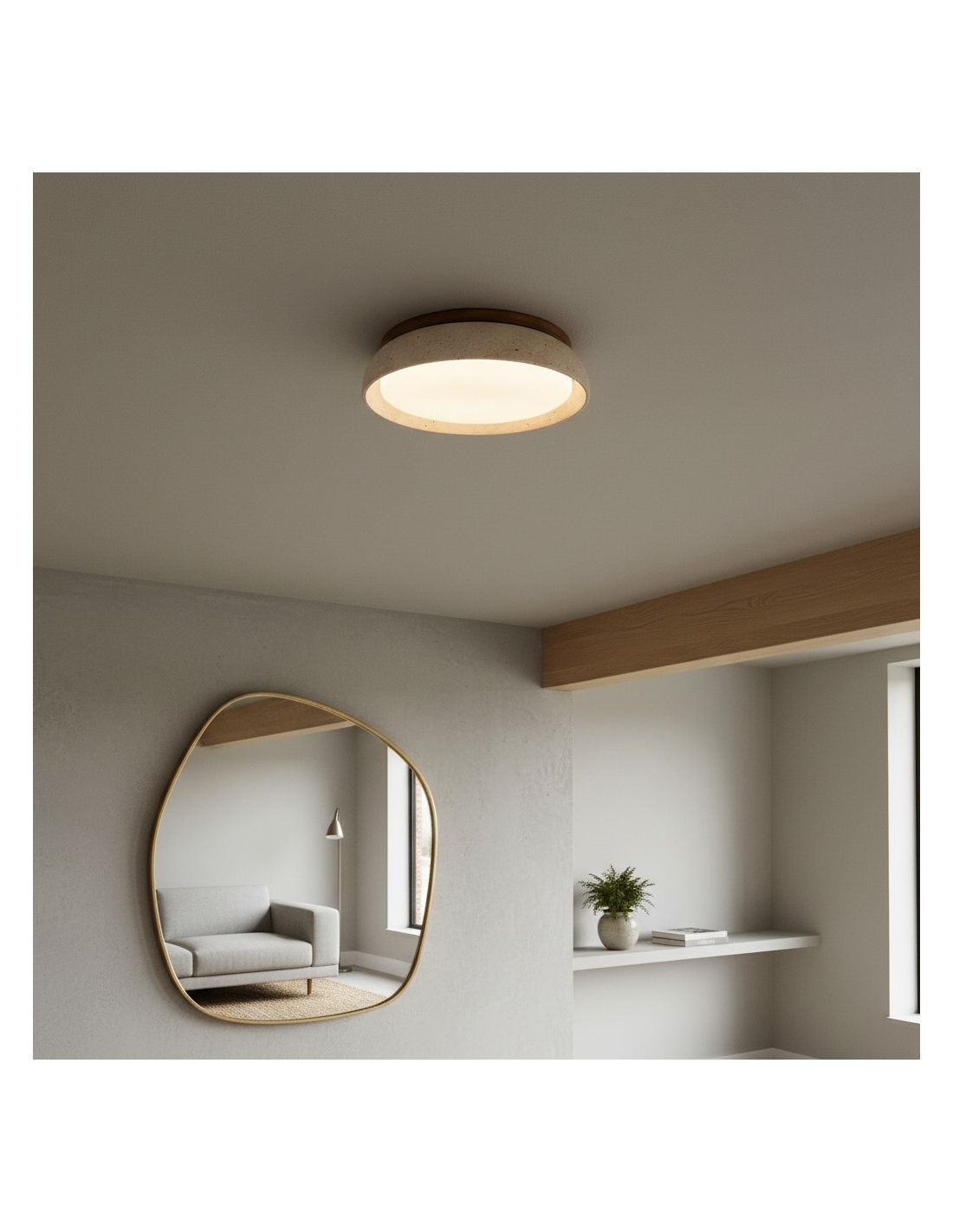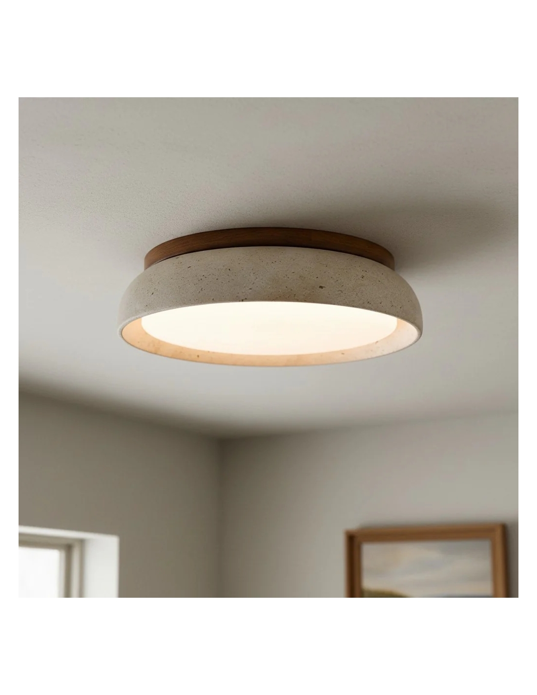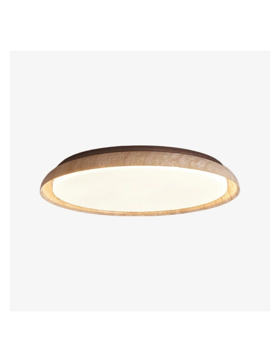 The Torvella Travertine Ceiling Light features a clean circular silhouette with a sculpted disc on a wood base, adding subtle elegance. This flush mount provides warm, diffused light for living rooms, bedrooms, hallways, or dining areas.