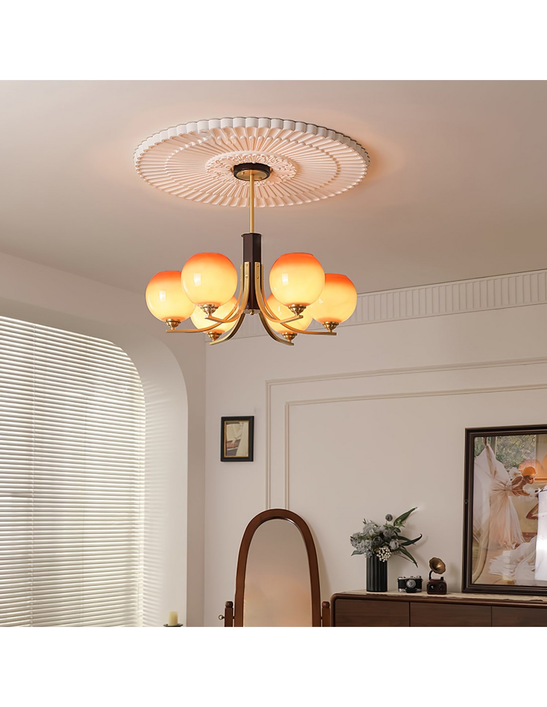 These globes are gracefully supported by sleek, brass-finished arms, blending timeless design with contemporary warmth. Ideal for dining rooms or living areas, this chandelier creates a cozy, inviting atmosphere, perfect for both modern and vintage-inspired interiors.