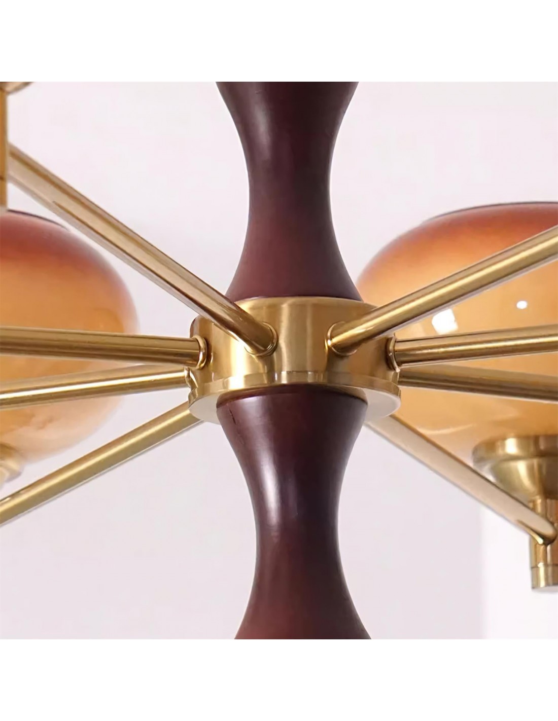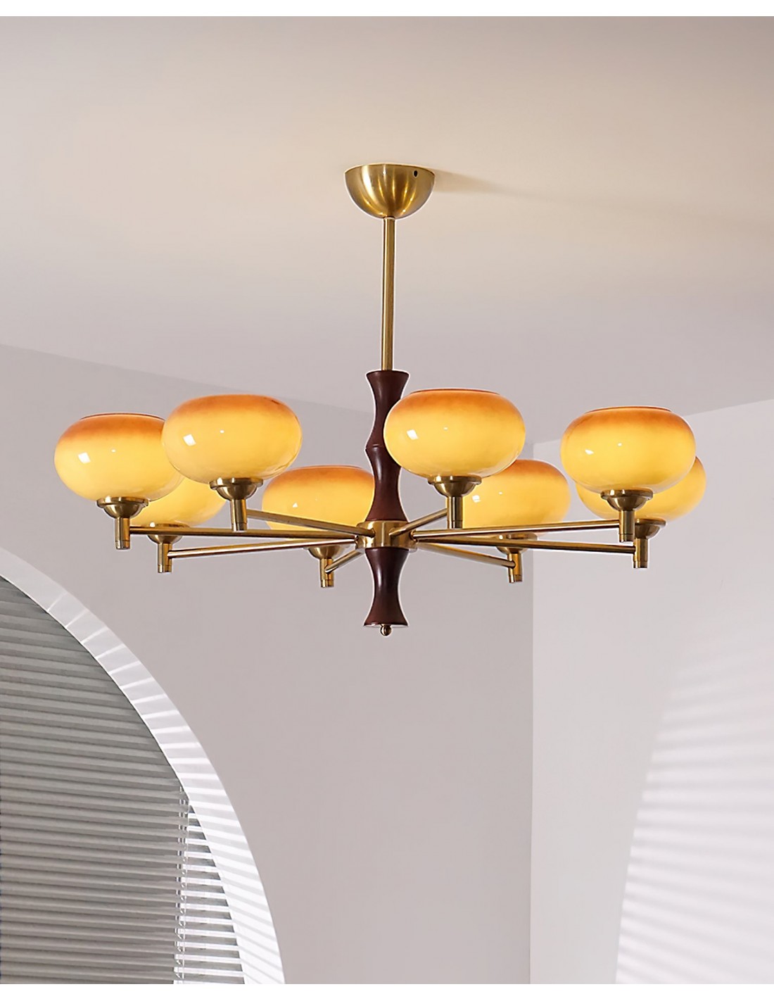 Embrace the charm of the past with a modern twist in the Vintage Mid Century Persimmon Glass Chandelier. This captivating fixture showcases a central column in a deep, rich hue, contrasted by sweeping arms in a golden finish that carry opulent, golden-hued globes. Each globe diffuses light softly, creating a warm and inviting atmosphere in any setting. The chandelier's sophisticated color palette and elegant curves make it a standout piece for both contemporary and classic interiors.