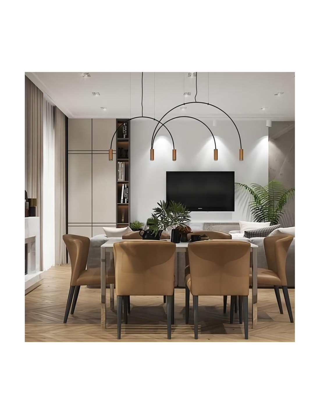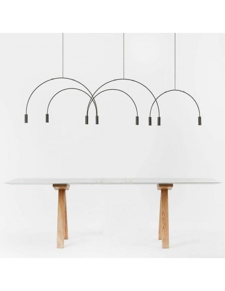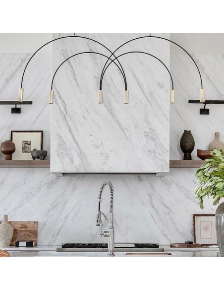 The Volta Suspension offers a chic, modern look featuring gracefully overlapping arced arms finished in Black with cylindrical aluminum heads and acrylic lens diffusers. Composed of two large arcs with two smaller inner arcs. Available finished in Black or Gold with a Black or White finished canopy. Suspension lamp with metal body with integrated LED, Adjustable height and individual canopy, suitable for creating compositions. Suspension lamp with metal body with integrated dimmable LED, cylindrical aluminium heads and acrylic (PMMA) lens diffusers. Adjustable height and individual canopy, suitable for creating compositions. Ideal for the living room, dining room, kitchen island, bedroom, bar, restaurant, hotel and retail shop.