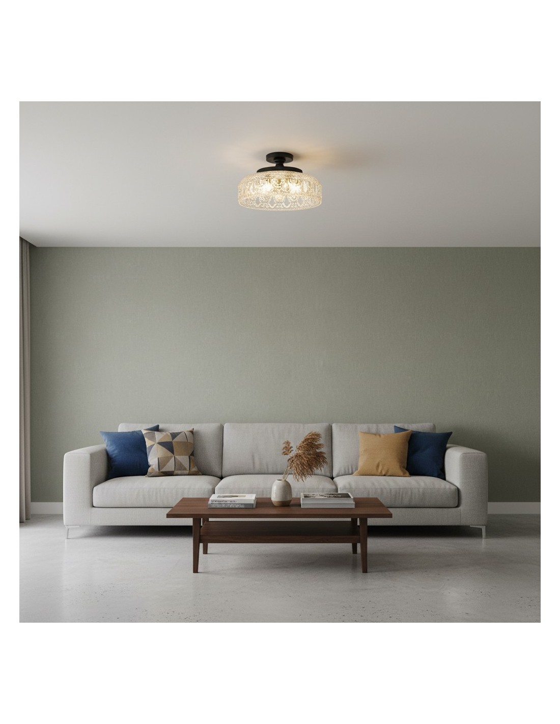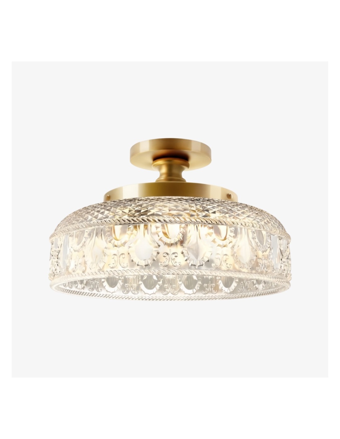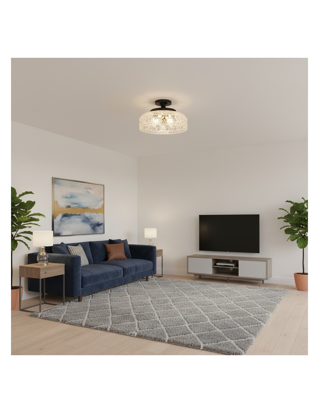 The Zenarivo ceiling light blends vintage elegance with modern cabin style. Featuring an engraved floral glass shade, this semi flush mount design adds visual depth while softly diffusing light to create a warm, romantic glow in interior spaces.