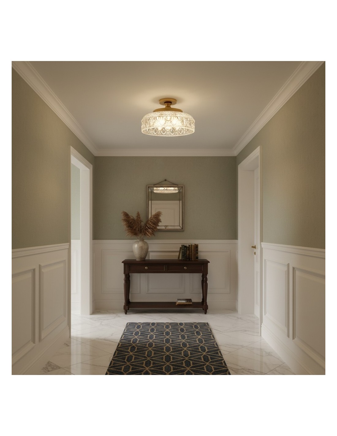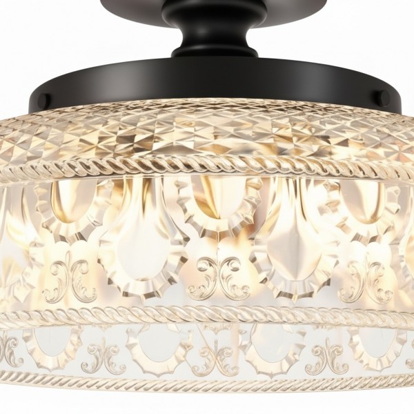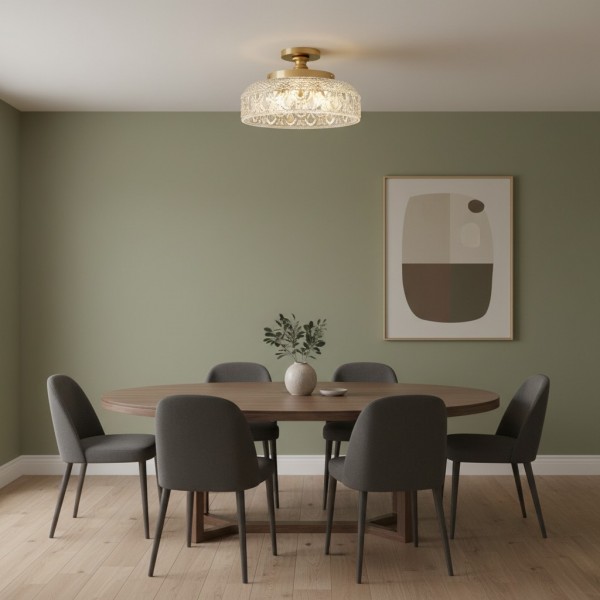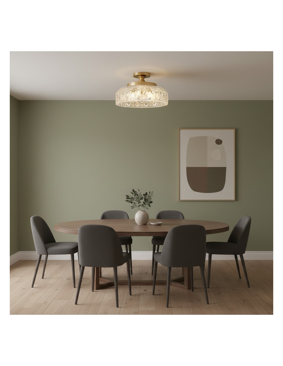 The Zenarivo ceiling light blends vintage elegance with modern cabin style. Featuring an engraved floral glass shade, this semi flush mount design adds visual depth while softly diffusing light to create a warm, romantic glow in interior spaces.