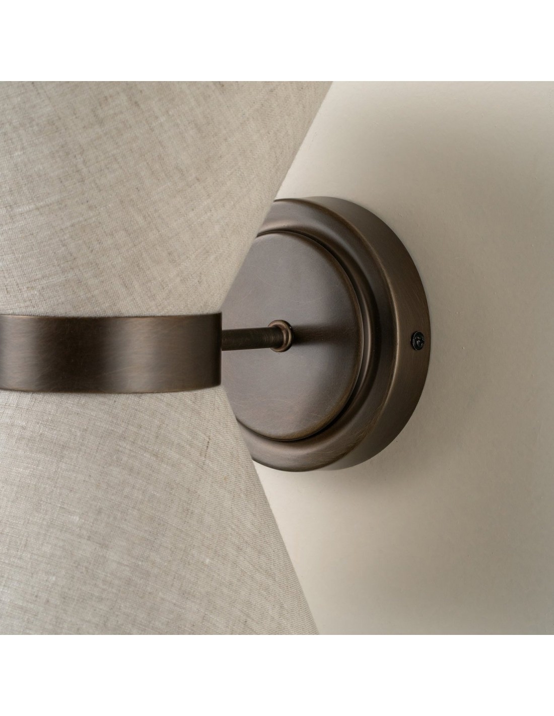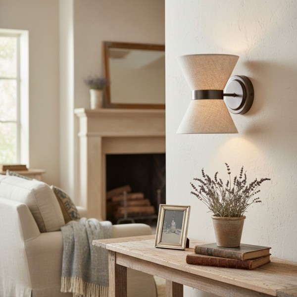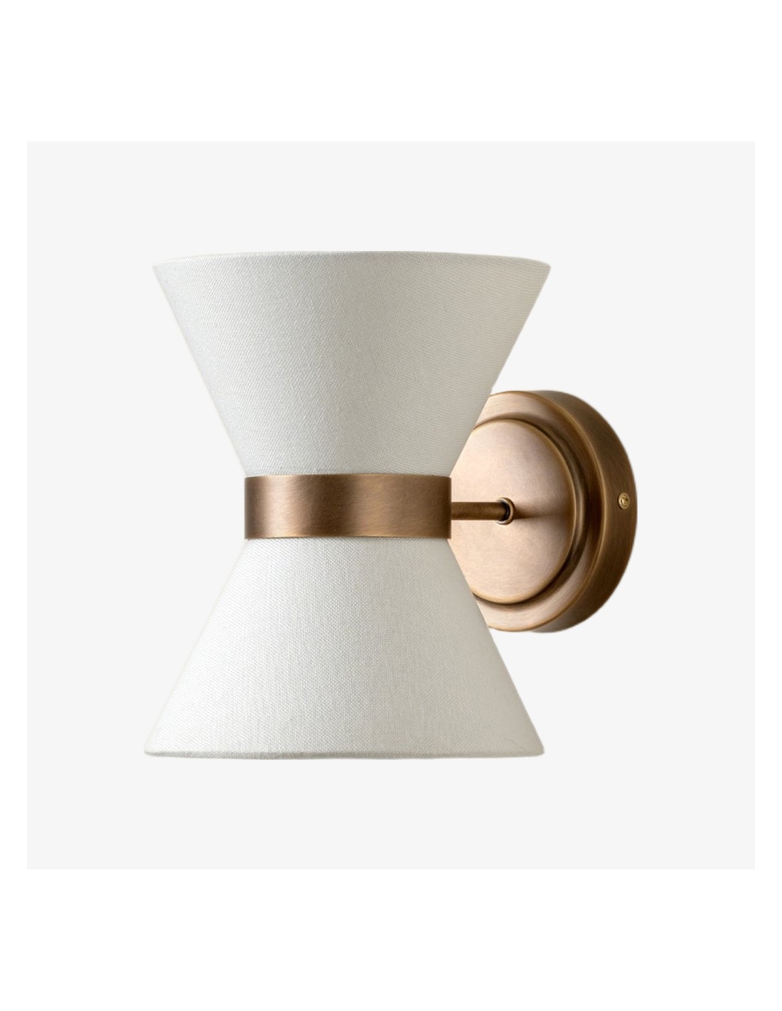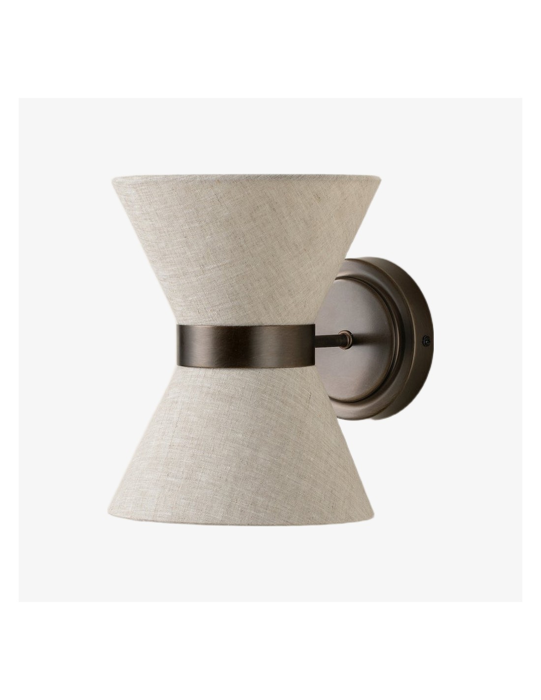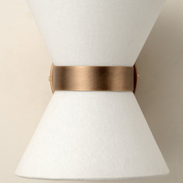 El aplique combina una delicada elegancia con una iluminación práctica. Presenta una pantalla en forma de pajarita, elaborada en lino texturizado, con un cálido marco de latón envejecido que la sostiene con estilo. La luz se dirige hacia arriba a través de la parte superior abierta y hacia abajo a través de un disco difusor de lino, creando una suave luz en capas con sombras sugerentes.