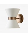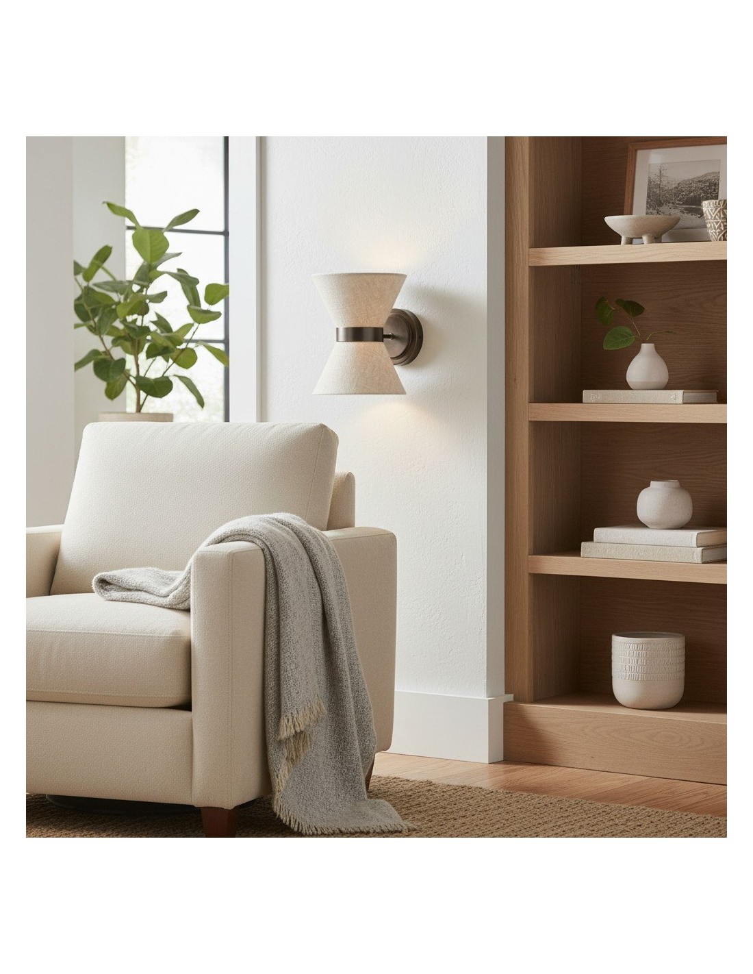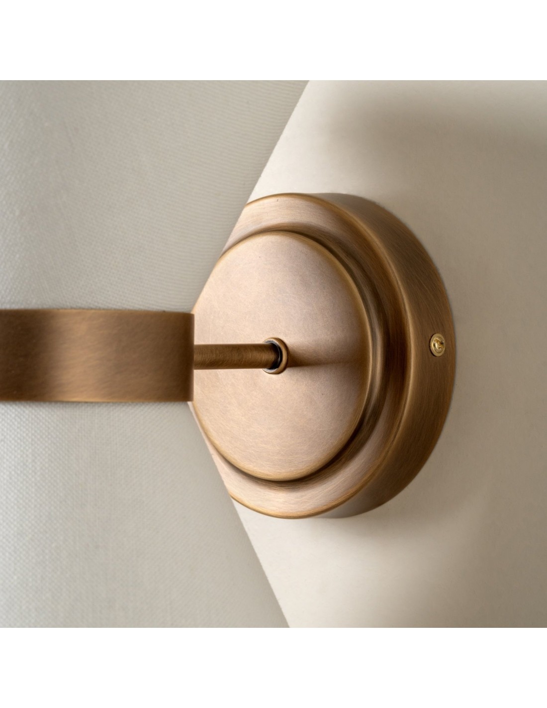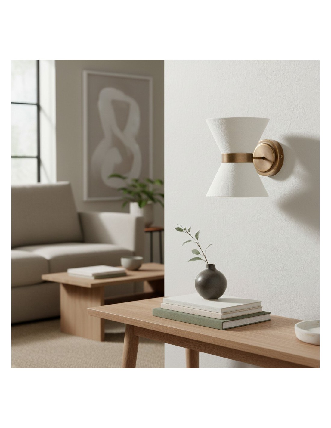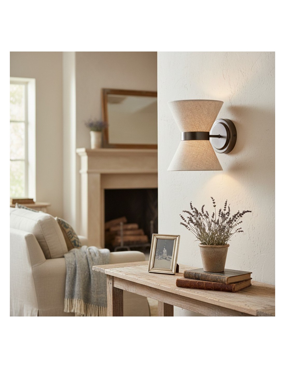El aplique combina una delicada elegancia con una iluminación práctica. Presenta una pantalla en forma de pajarita, elaborada en lino texturizado, con un cálido marco de latón envejecido que la sostiene con estilo. La luz se dirige hacia arriba a través de la parte superior abierta y hacia abajo a través de un disco difusor de lino, creando una suave luz en capas con sombras sugerentes.