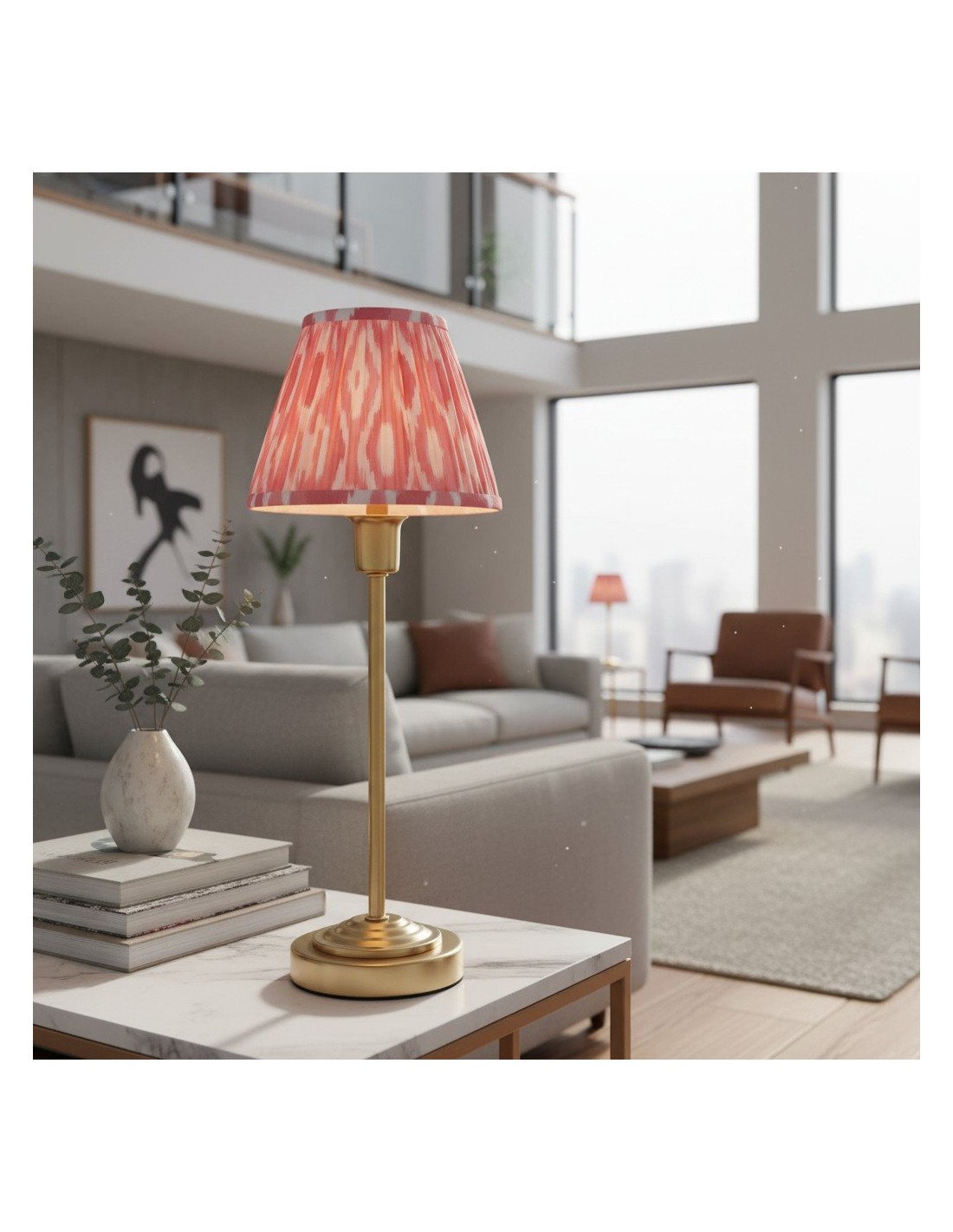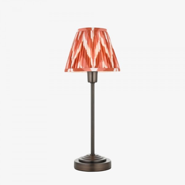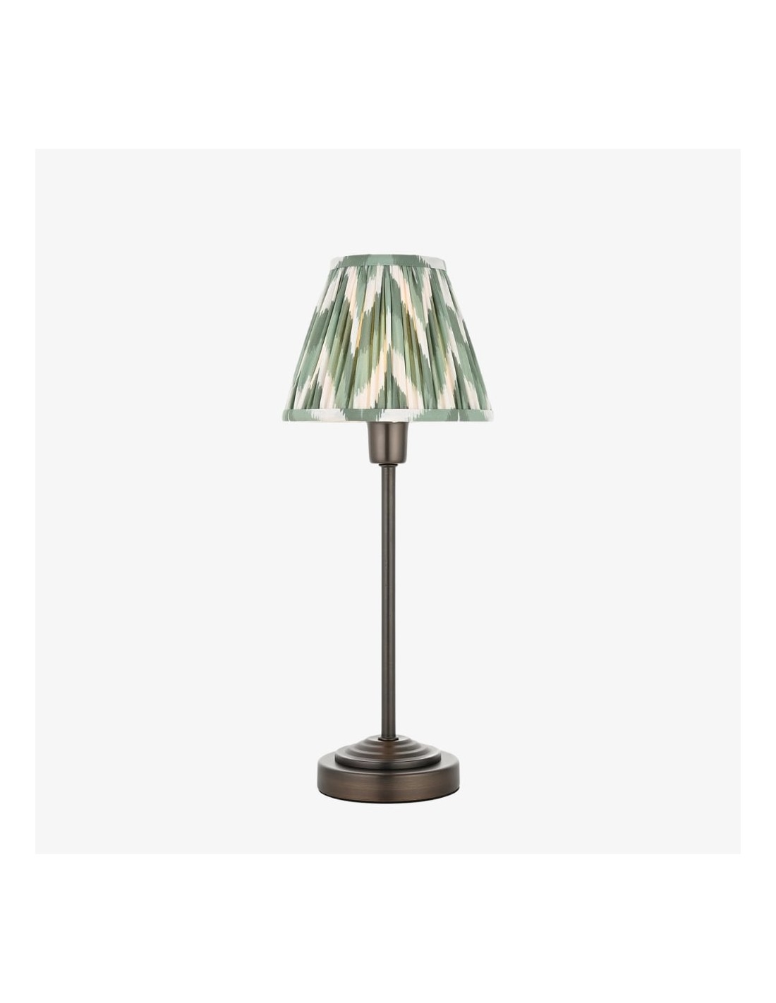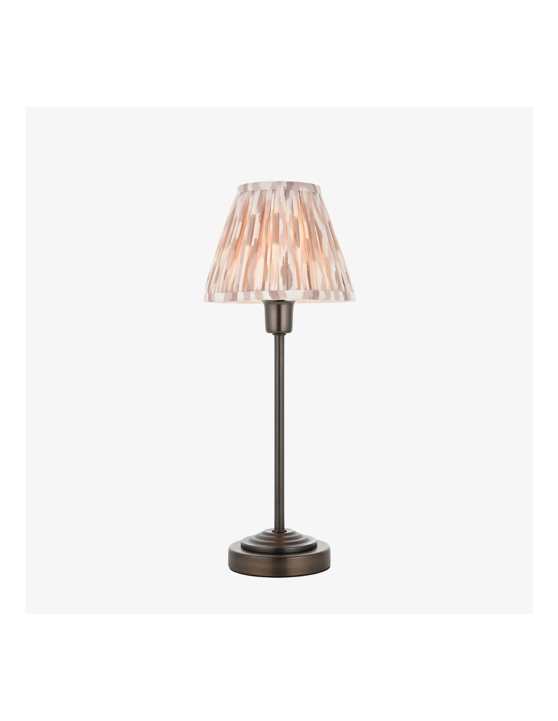 La lámpara de mesa Bronzuno combina una esbelta base metálica con una pantalla de tela a medida de 16 cm para una iluminación refinada y texturizada. Disponible en múltiples acabados metálicos y colores de pantalla, combina elementos contemporáneos y bohemios para ofrecer una iluminación cálida y ambiental, ideal para mesitas de noche, salones, pasillos y despachos en casa.