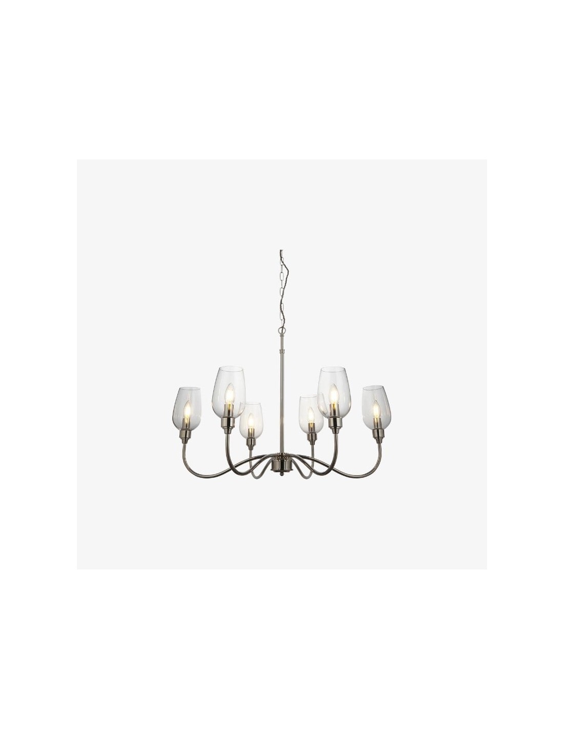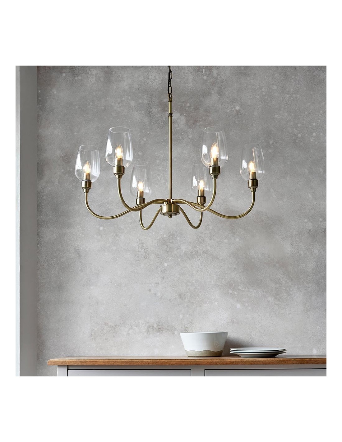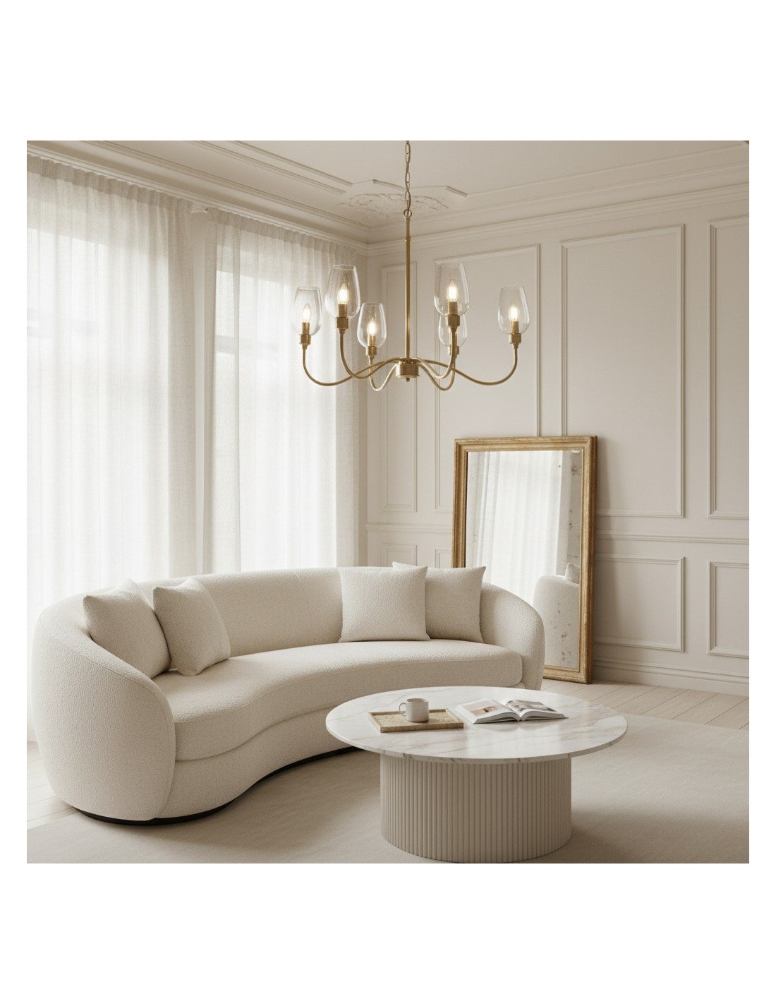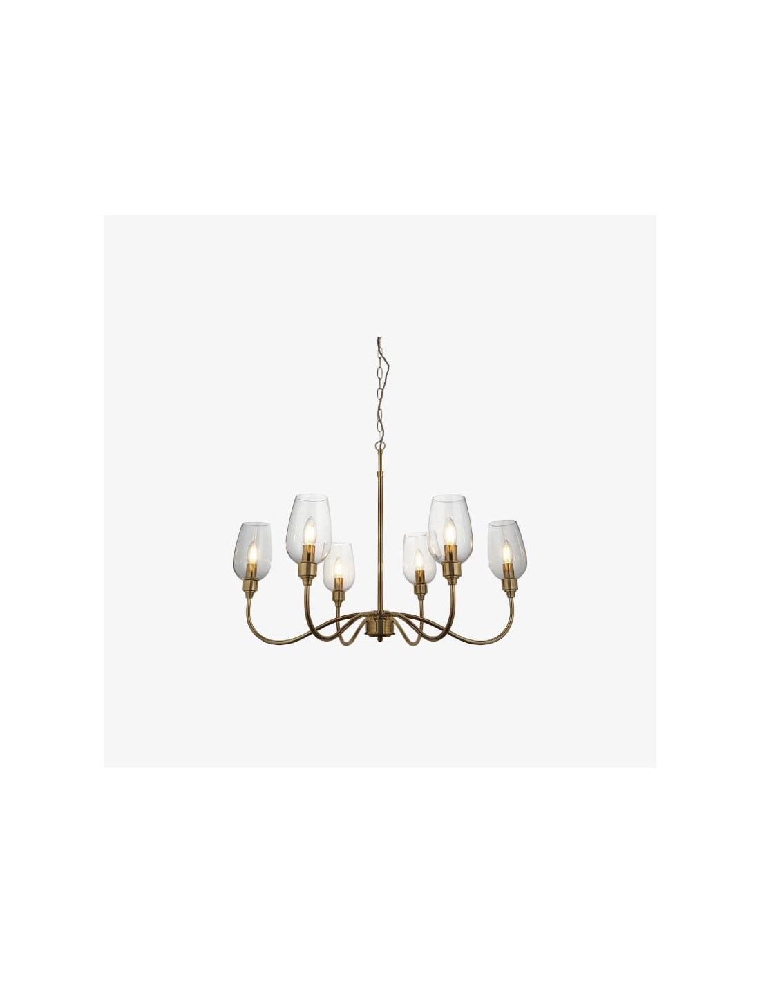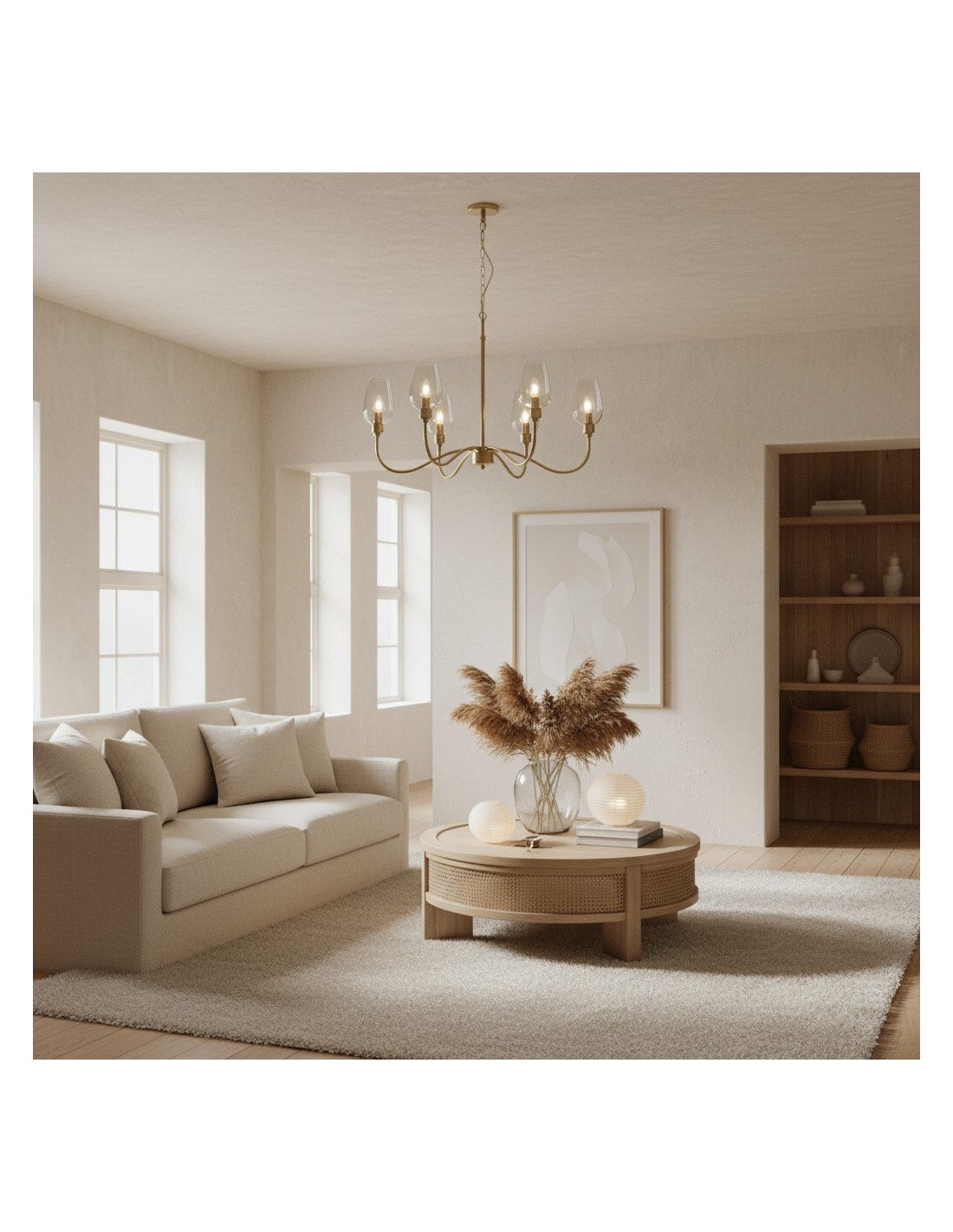 Realza tu espacio con esta impresionante lámpara colgante de 6 luces que combina la elegancia atemporal del Art Déco con la funcionalidad moderna. Con pantallas de vidrio soplado transparente y un marco de metal finamente chapado, esta lámpara ofrece un equilibrio visual refinado y una sensación de lujo.