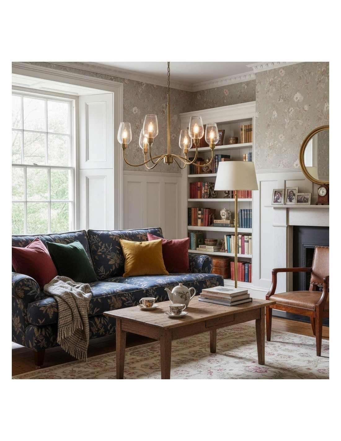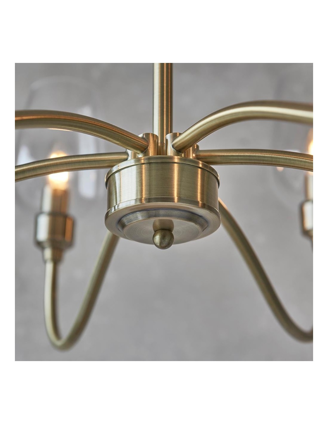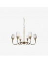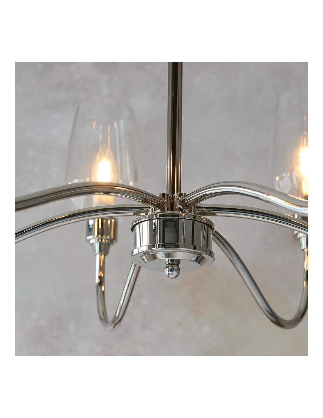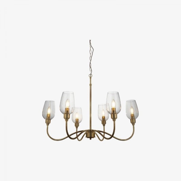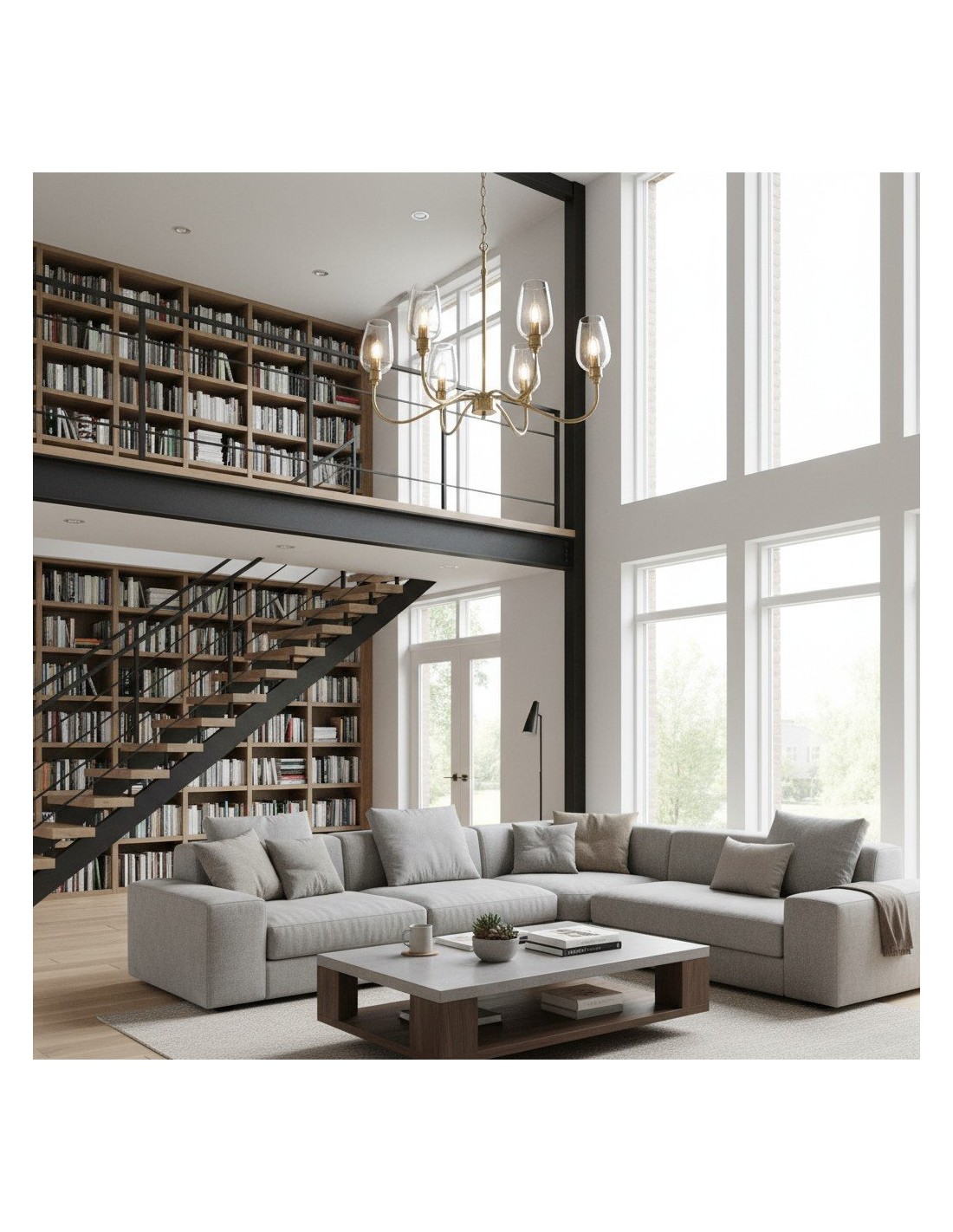 Realza tu espacio con esta impresionante lámpara colgante de 6 luces que combina la elegancia atemporal del Art Déco con la funcionalidad moderna. Con pantallas de vidrio soplado transparente y un marco de metal finamente chapado, esta lámpara ofrece un equilibrio visual refinado y una sensación de lujo.
