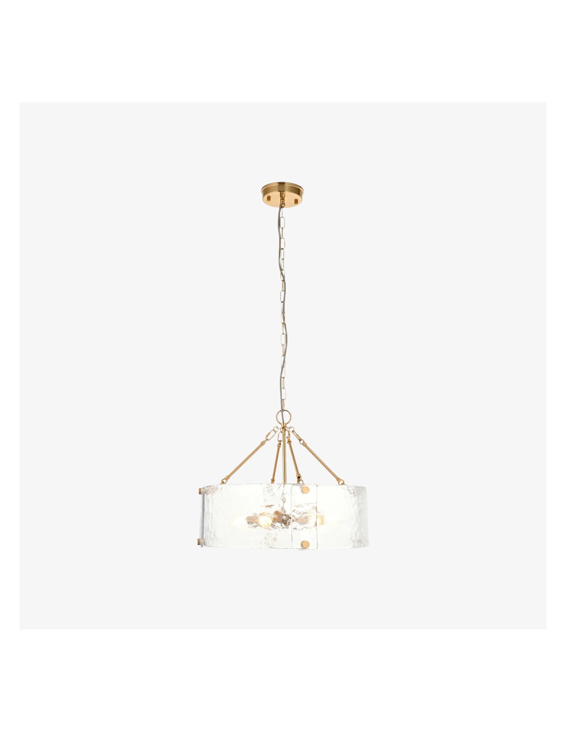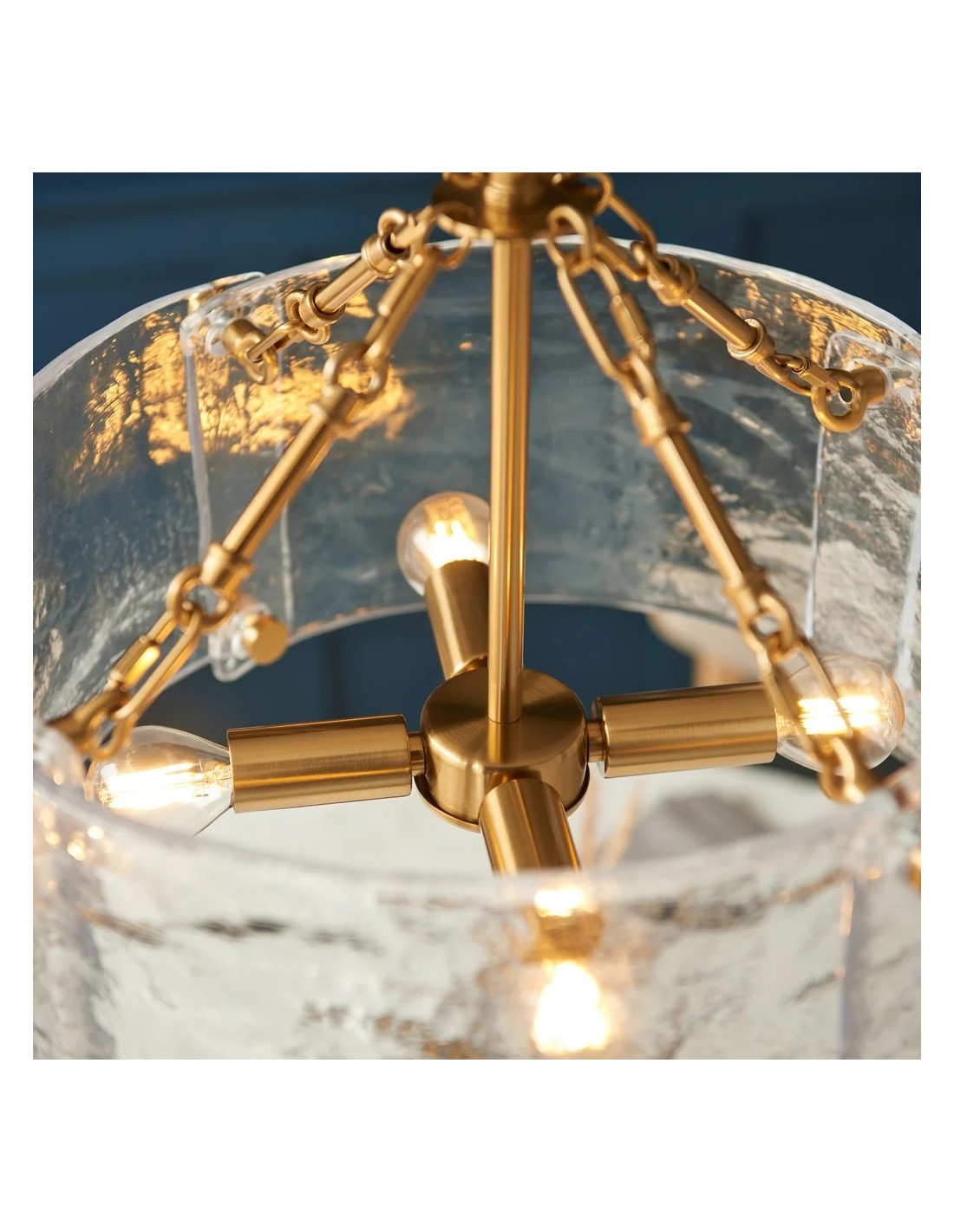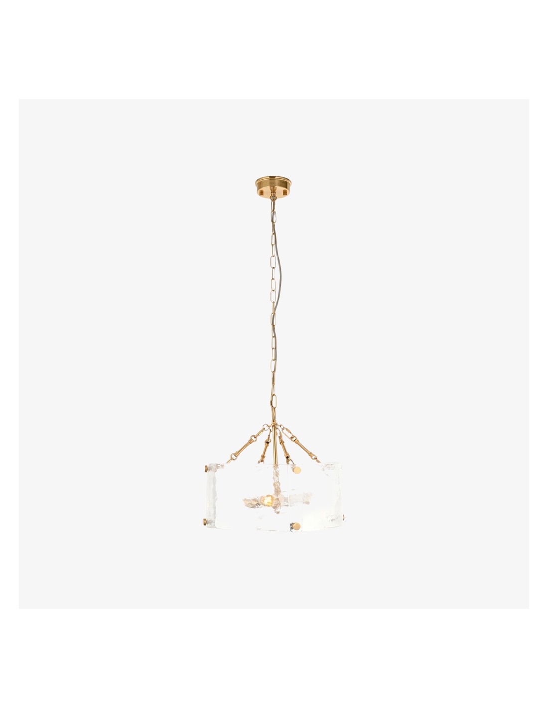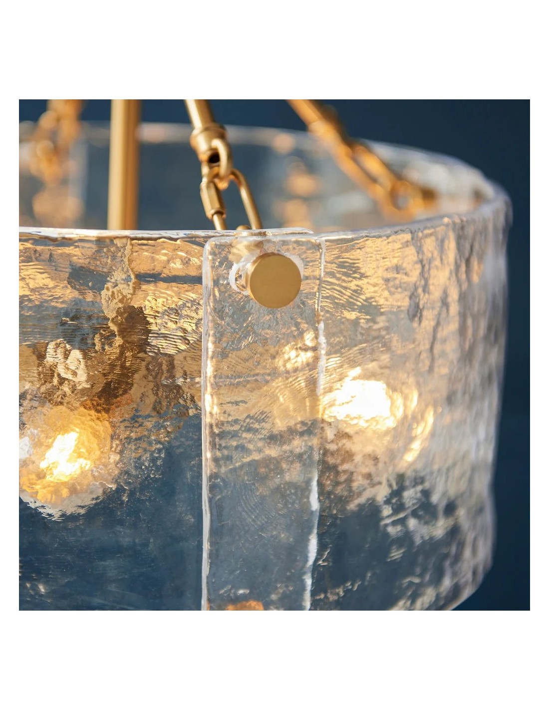 Esta lámpara colgante es una pieza escultural y artesanal. Gruesos paneles de vidrio curvado, hechos a mano, envuelven una cálida estructura de latón envejecido cepillado, creando una pantalla orgánica y texturizada. Suspendida de una cadena de altura ajustable con un cable trenzado gris, se adapta a diversos techos.