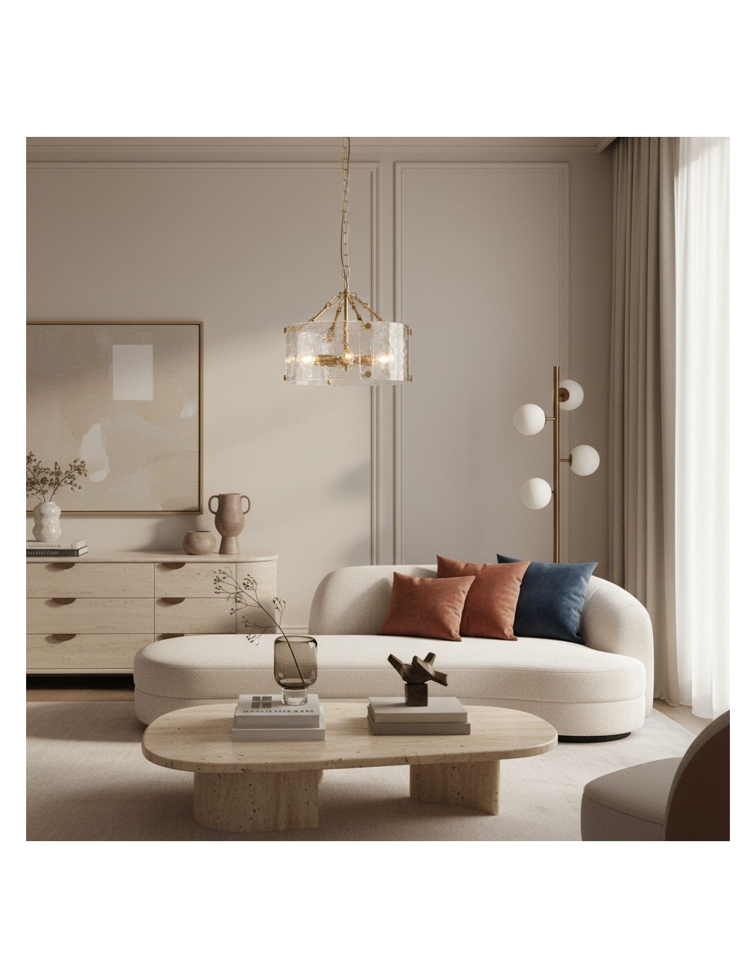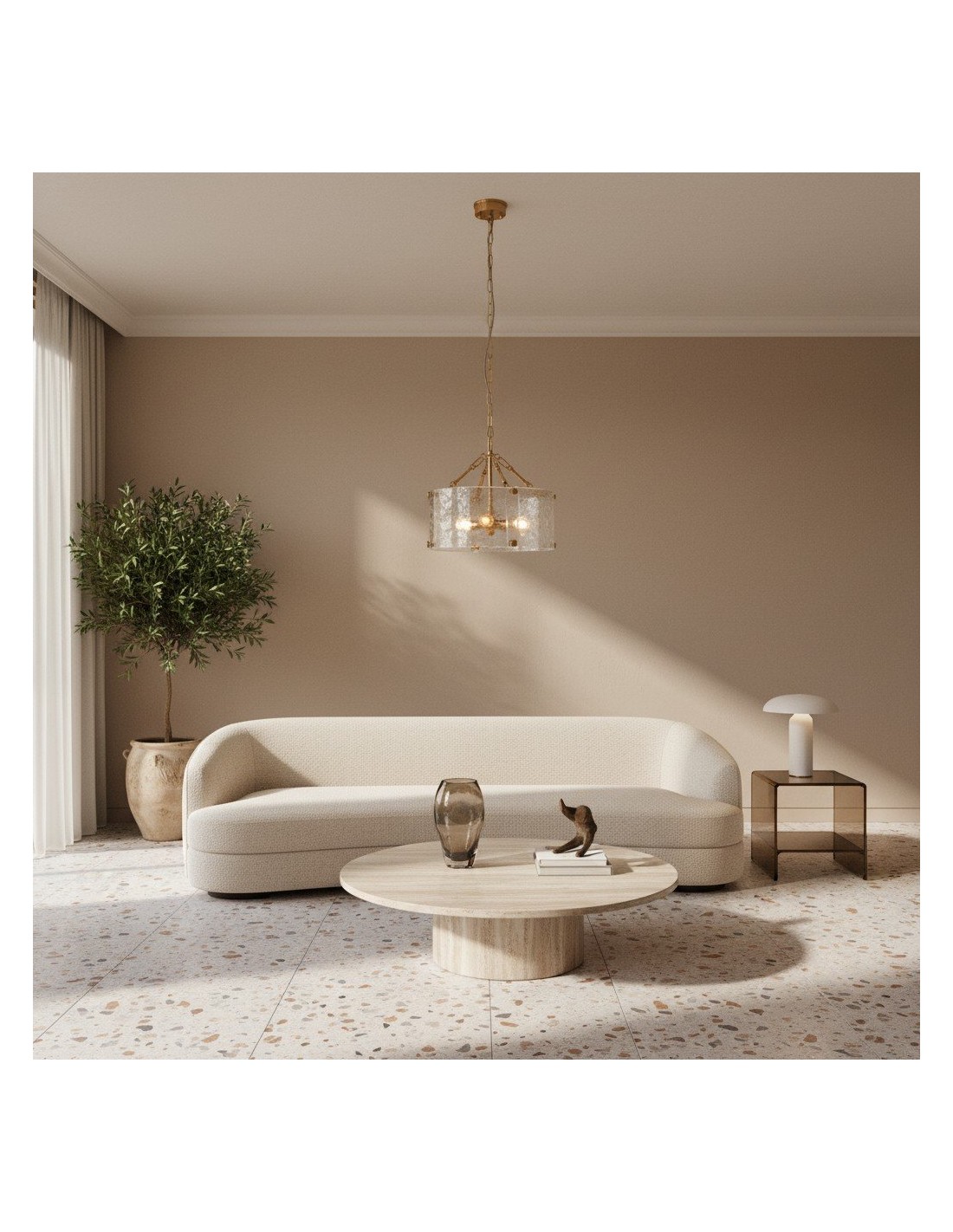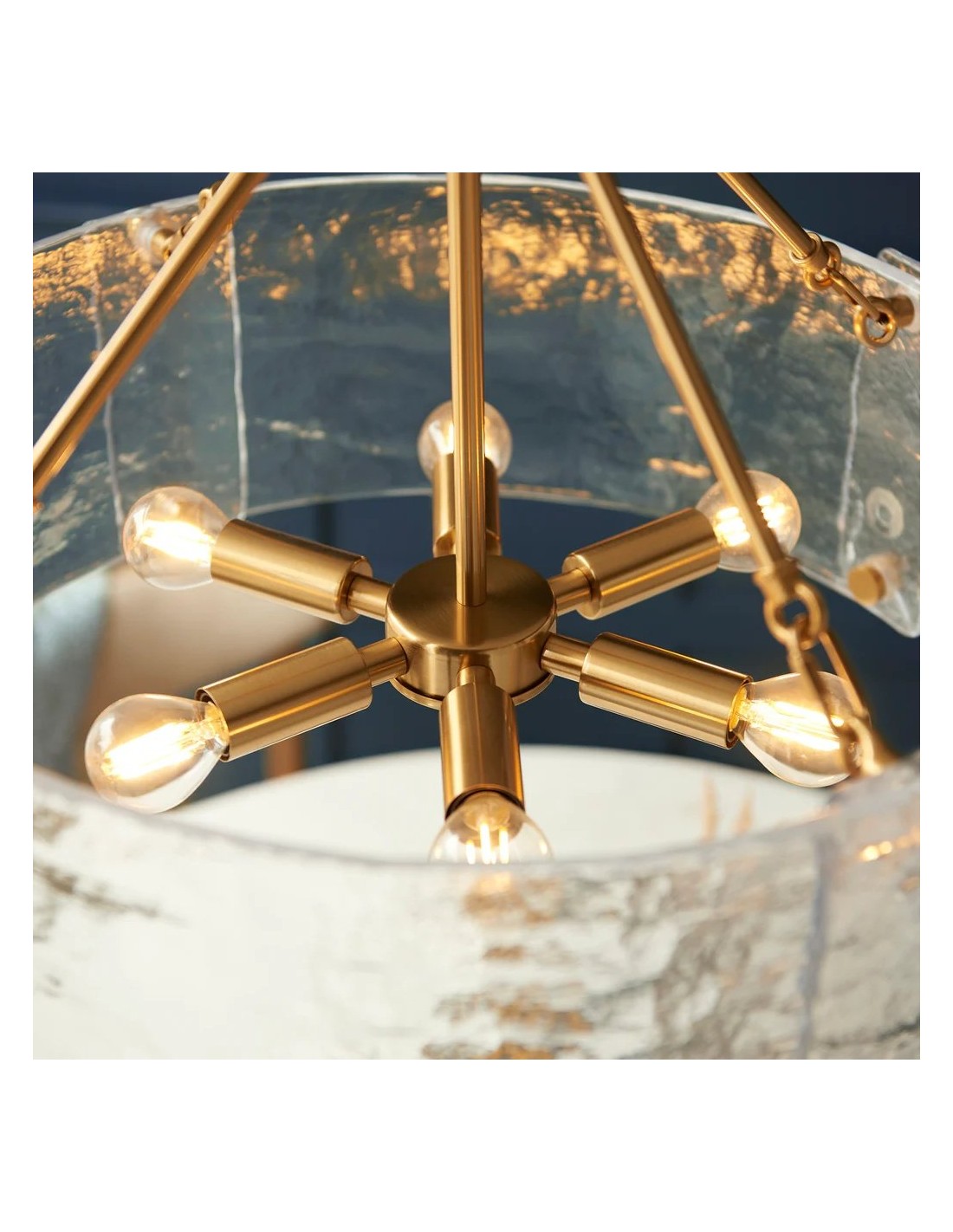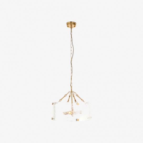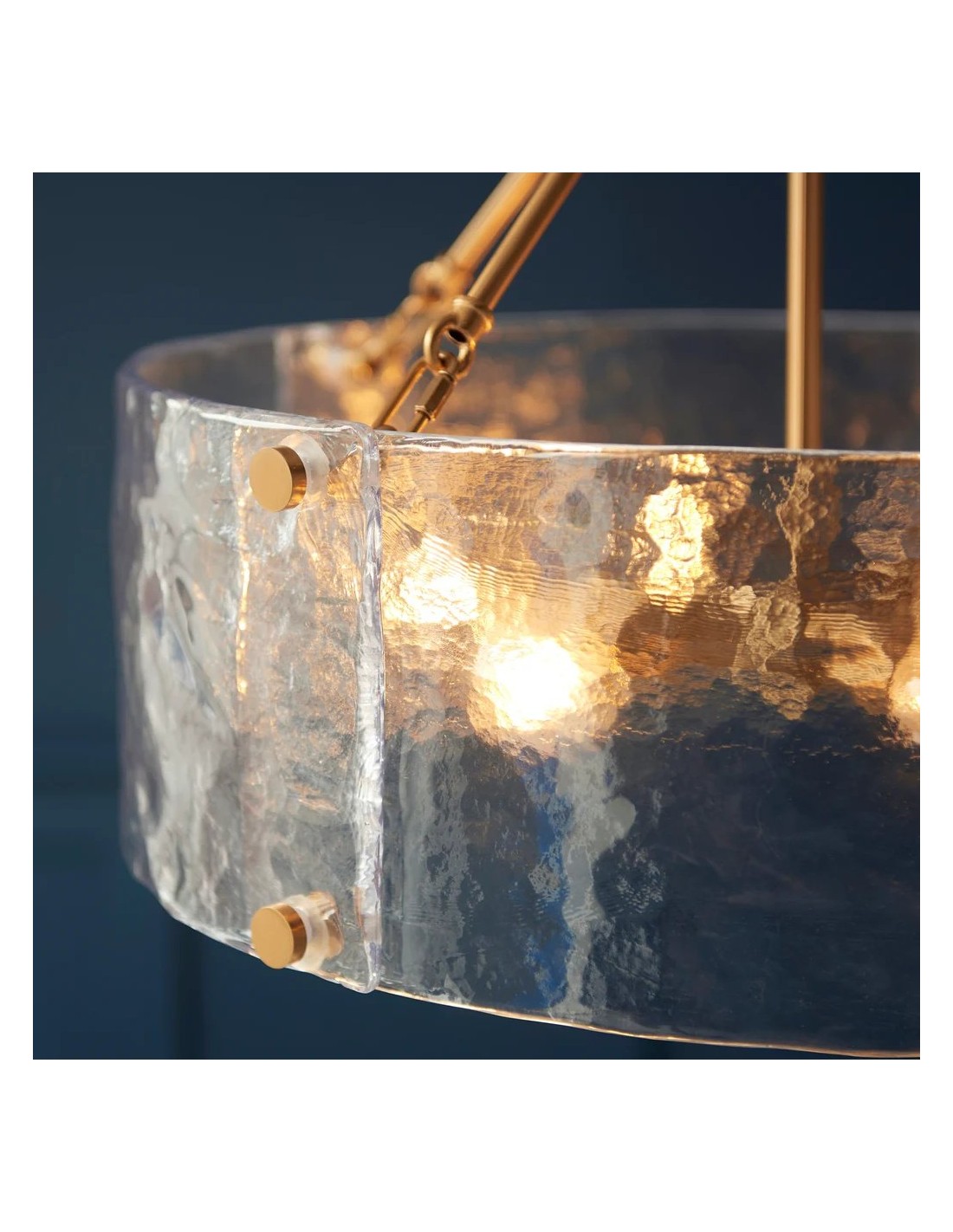 Esta lámpara colgante es una pieza escultural y artesanal. Gruesos paneles de vidrio curvado, hechos a mano, envuelven una cálida estructura de latón envejecido cepillado, creando una pantalla orgánica y texturizada. Suspendida de una cadena de altura ajustable con un cable trenzado gris, se adapta a diversos techos.