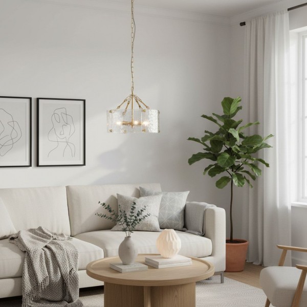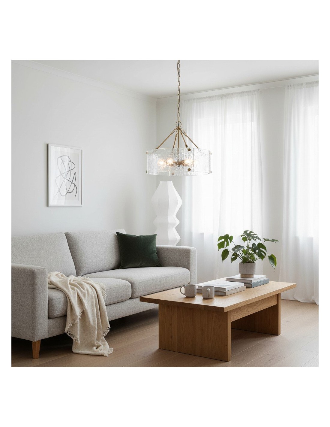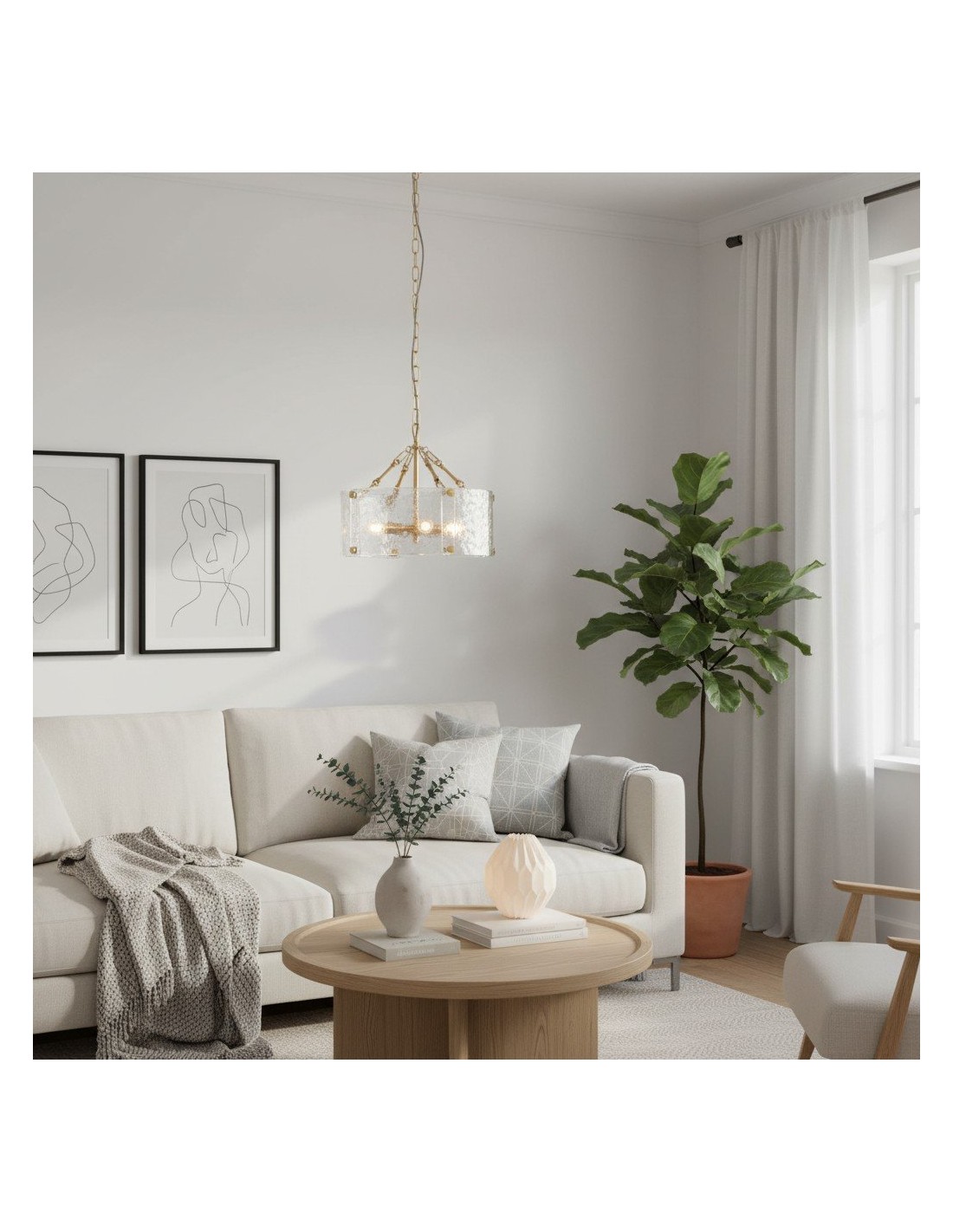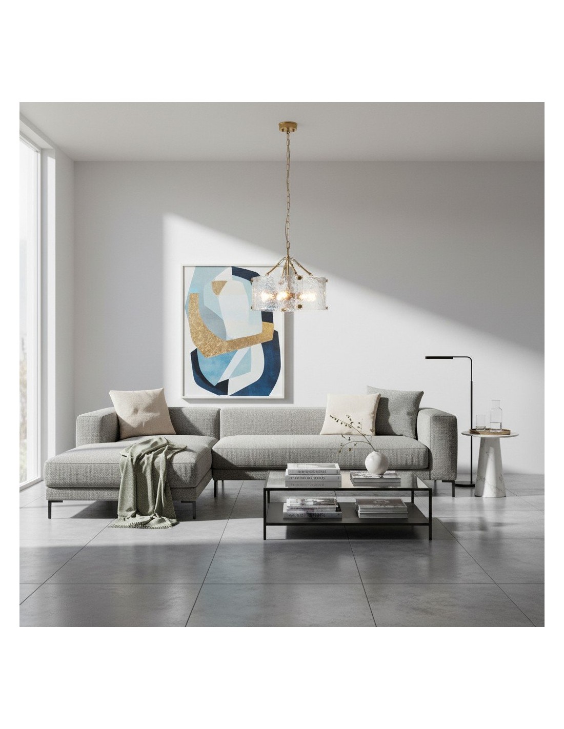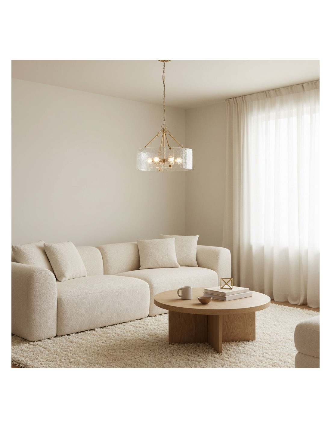 Esta lámpara colgante es una pieza escultural y artesanal. Gruesos paneles de vidrio curvado, hechos a mano, envuelven una cálida estructura de latón envejecido cepillado, creando una pantalla orgánica y texturizada. Suspendida de una cadena de altura ajustable con un cable trenzado gris, se adapta a diversos techos.