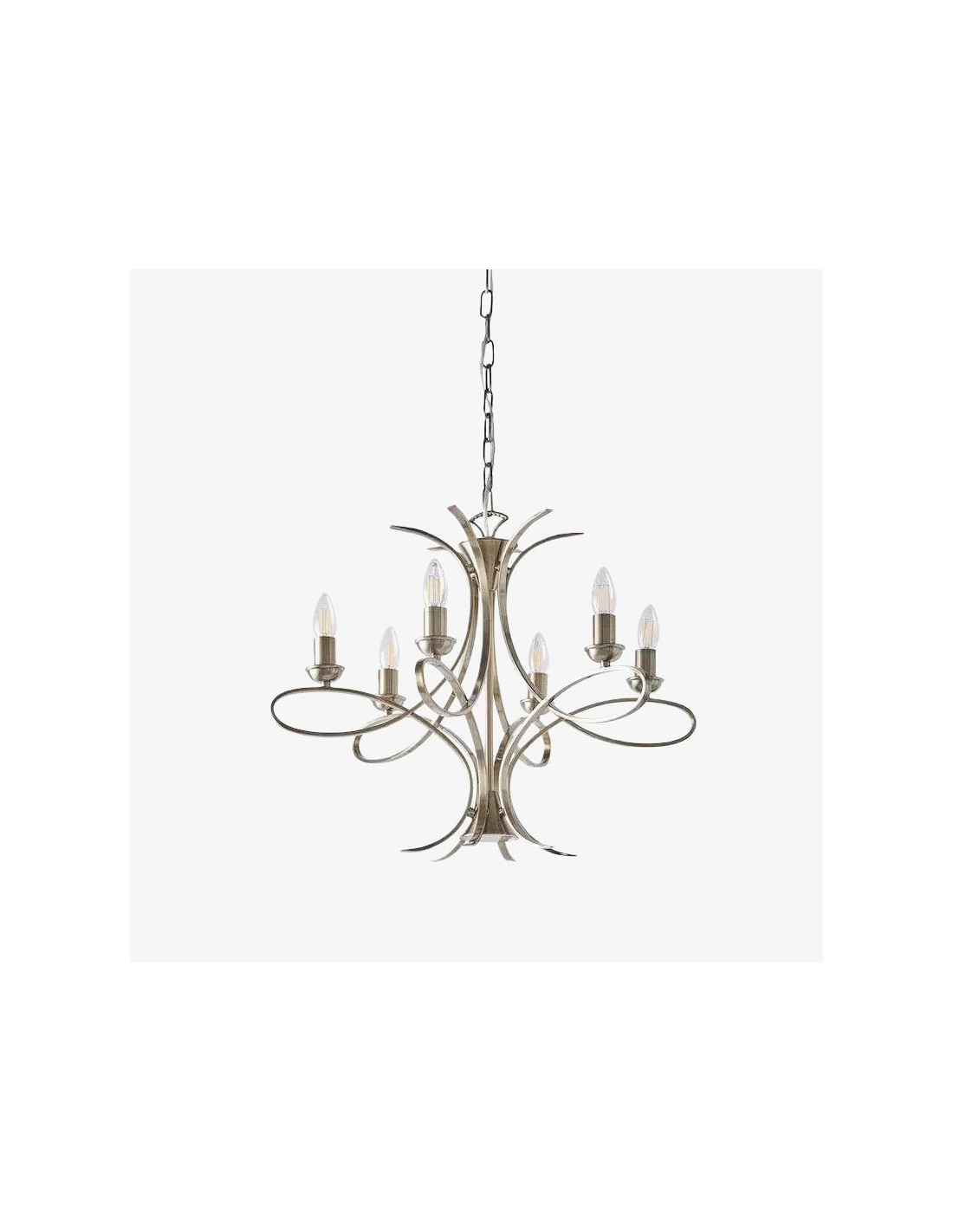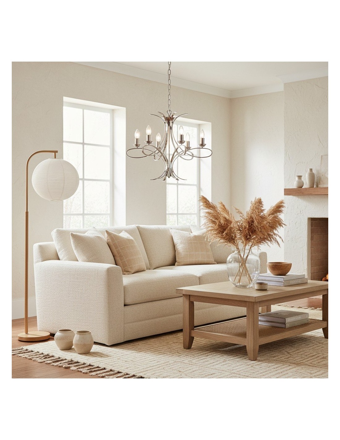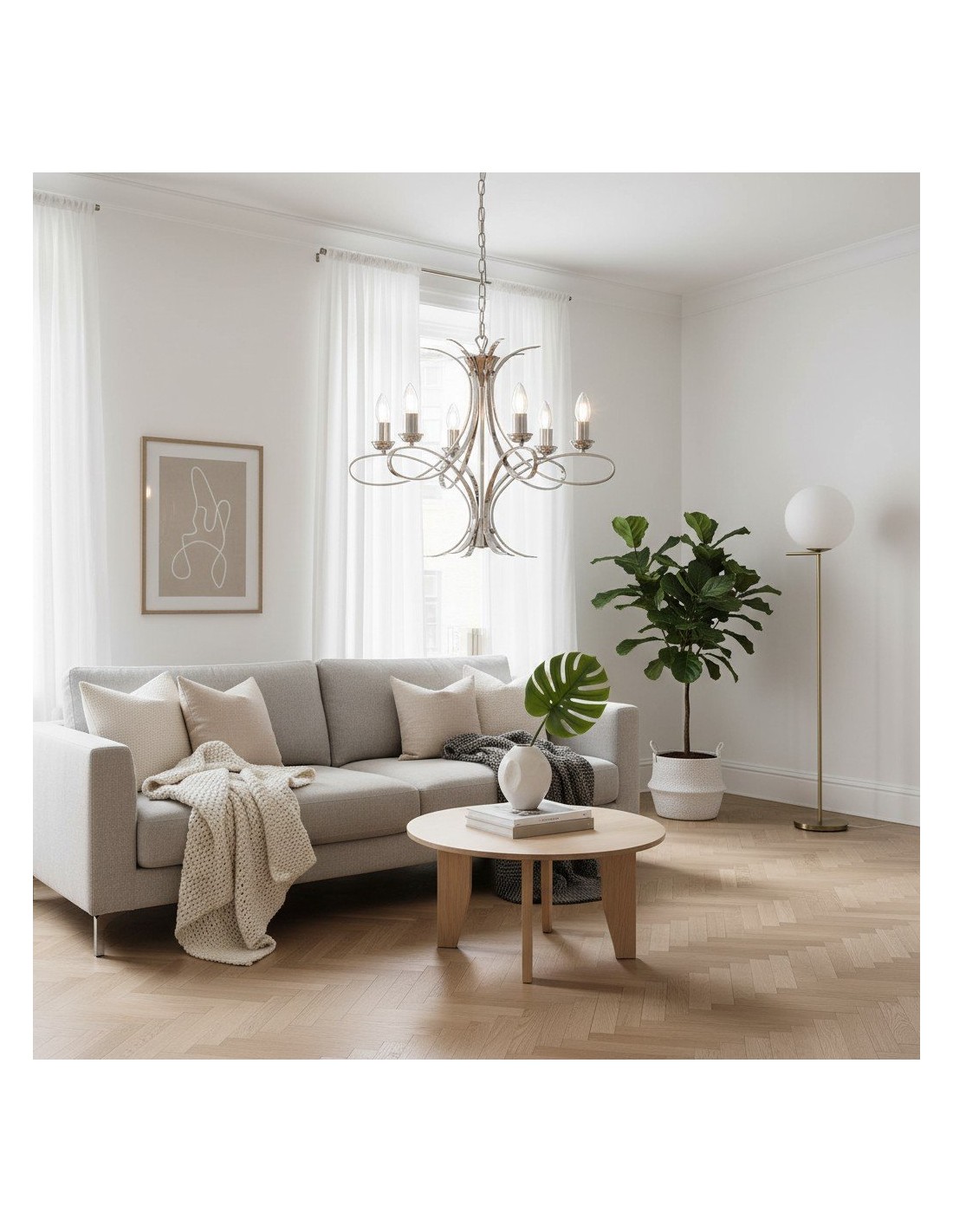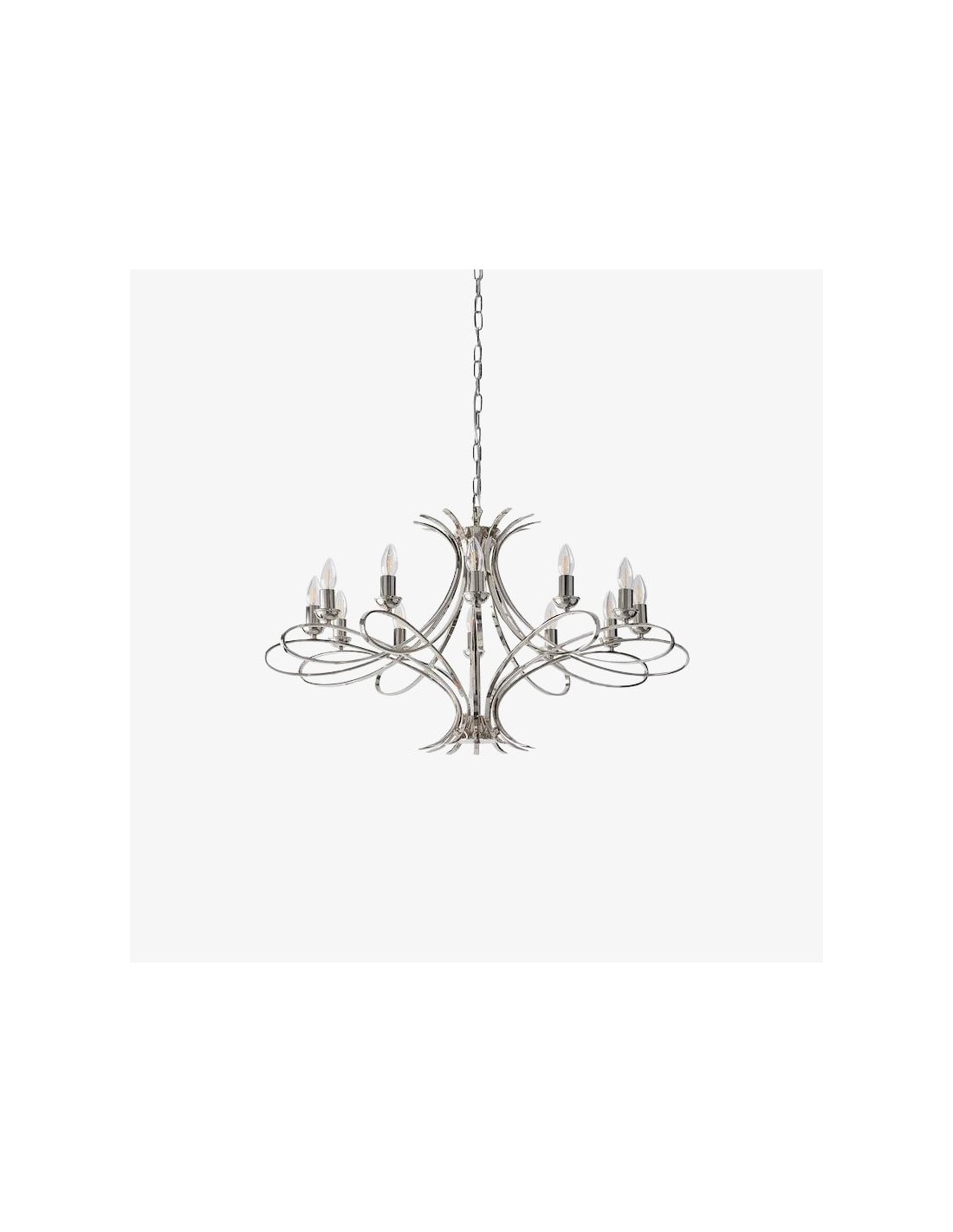 Su diseño multiluz proporciona una generosa iluminación ambiental, ideal para mesas de comedor, islas de cocina o entradas, mientras que su elegante acabado en níquel y latón le aporta un toque sofisticado y urbano. Apta para interiores, esta lámpara de araña admite una variedad de opciones de pantallas y bombillas, lo que permite personalizarla según el espacio y el ambiente.