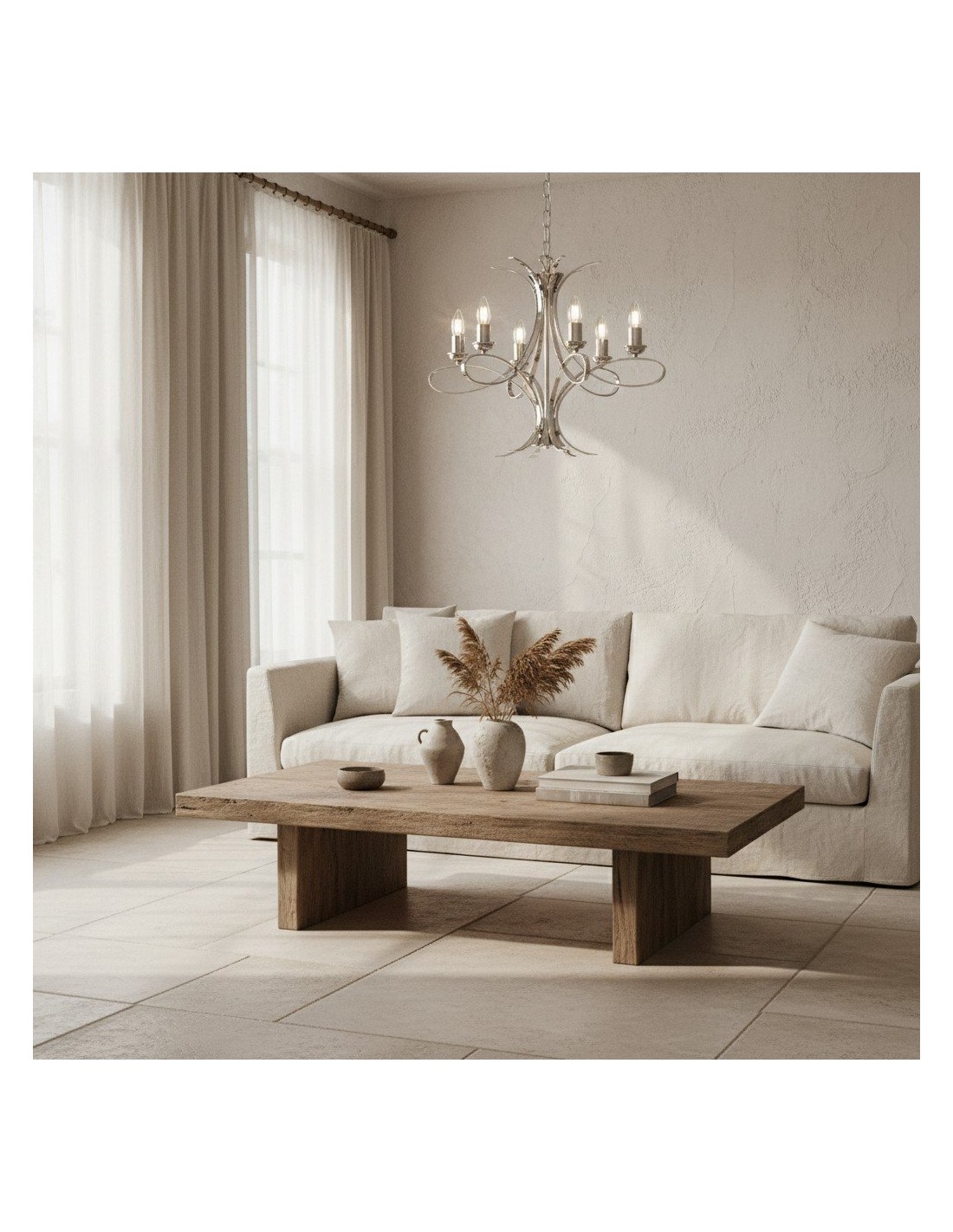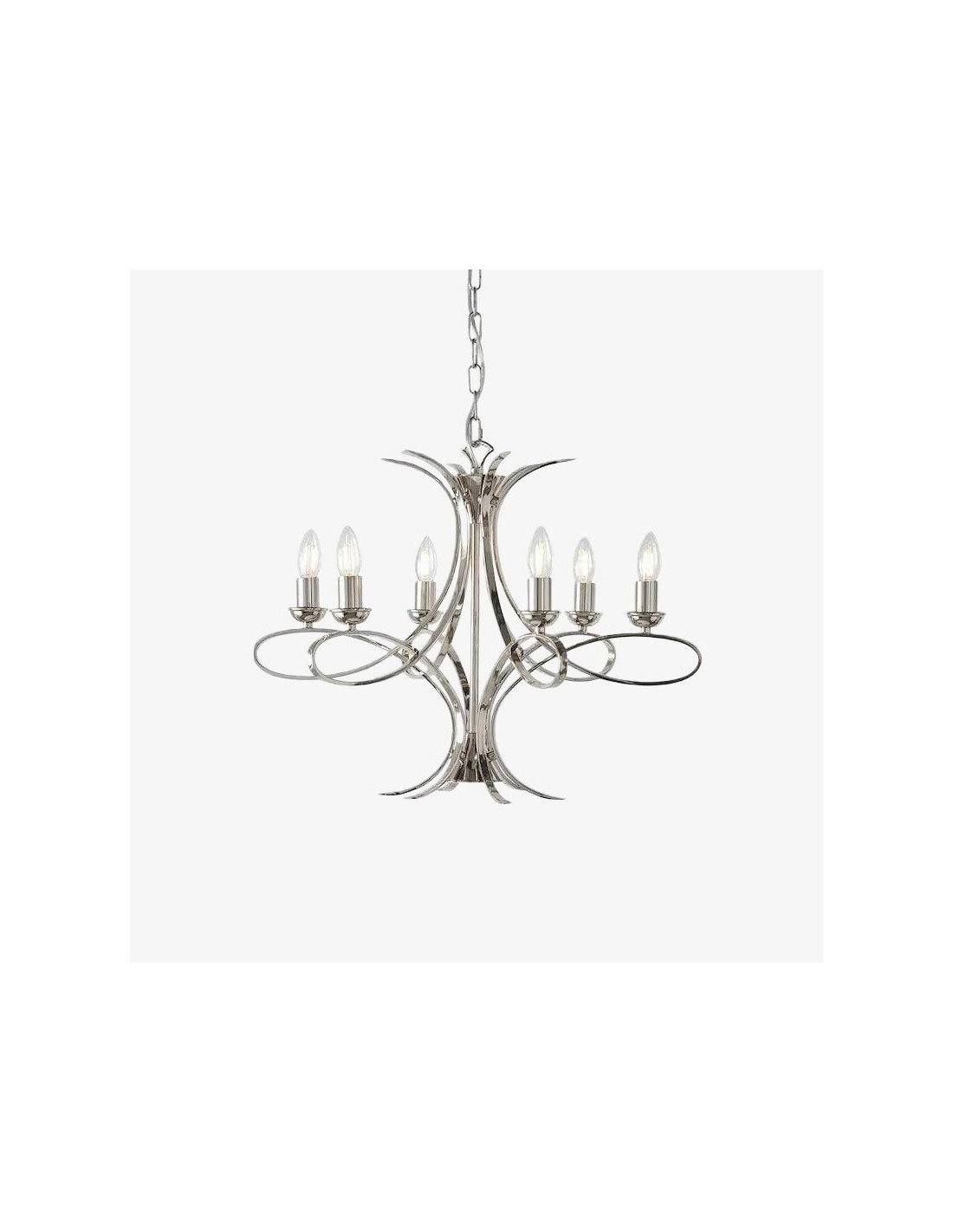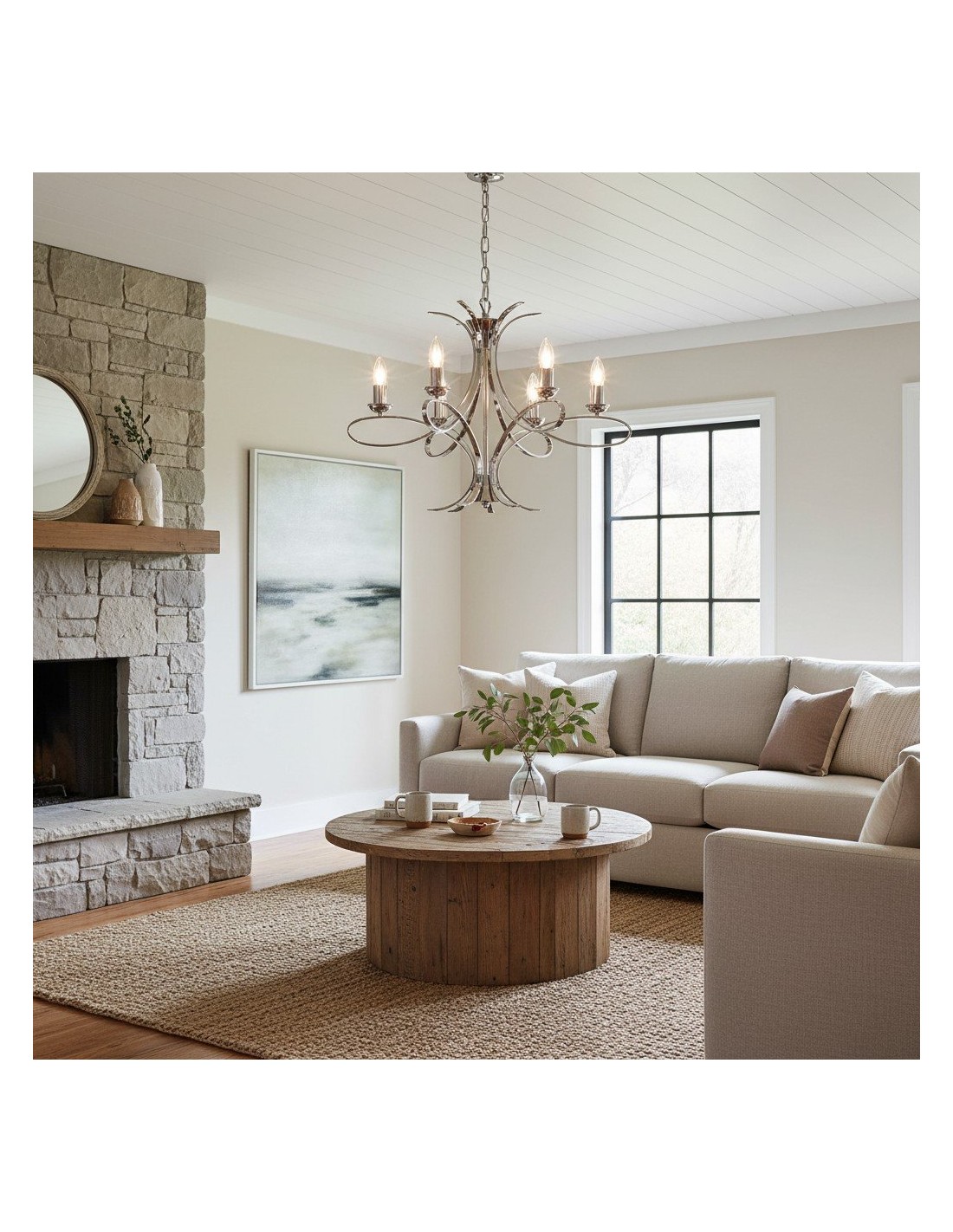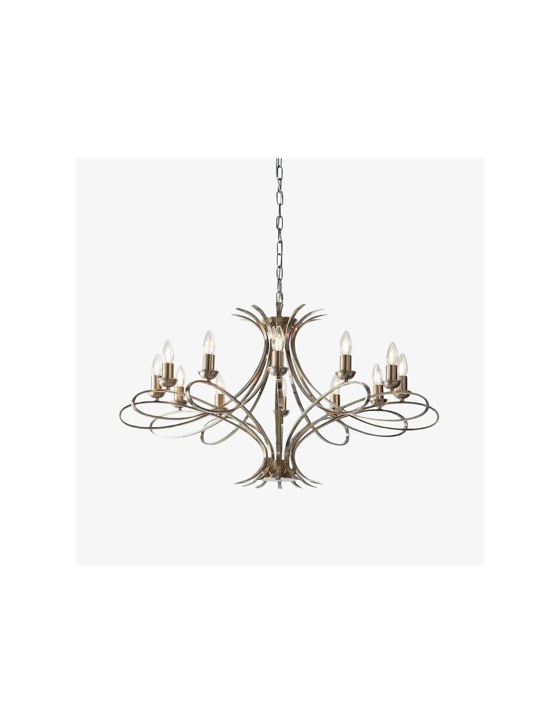 Su diseño multiluz proporciona una generosa iluminación ambiental, ideal para mesas de comedor, islas de cocina o entradas, mientras que su elegante acabado en níquel y latón le aporta un toque sofisticado y urbano. Apta para interiores, esta lámpara de araña admite una variedad de opciones de pantallas y bombillas, lo que permite personalizarla según el espacio y el ambiente.