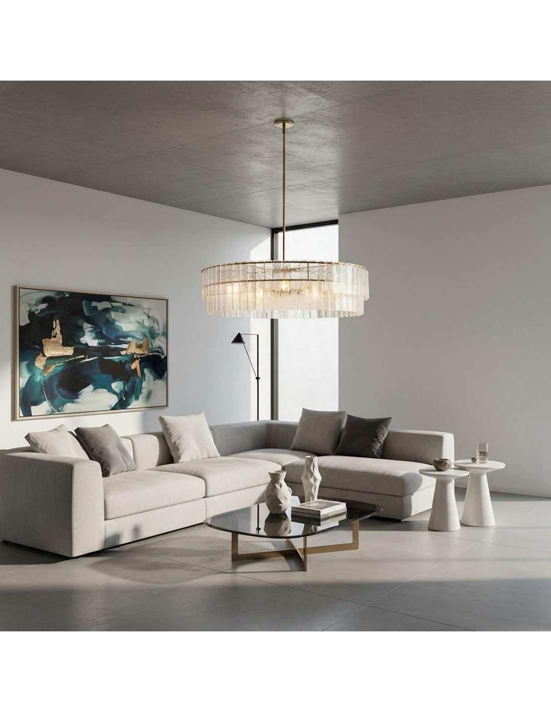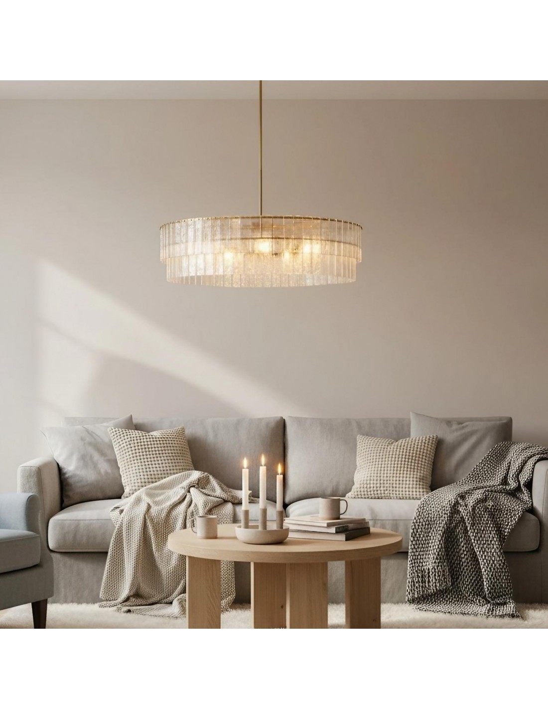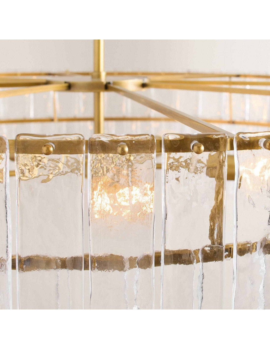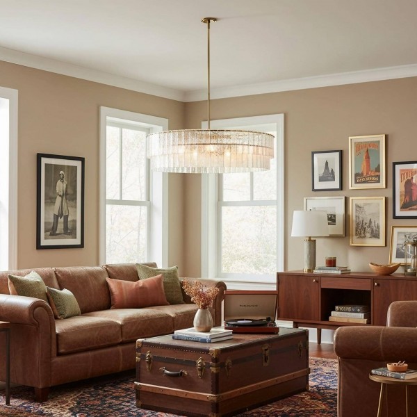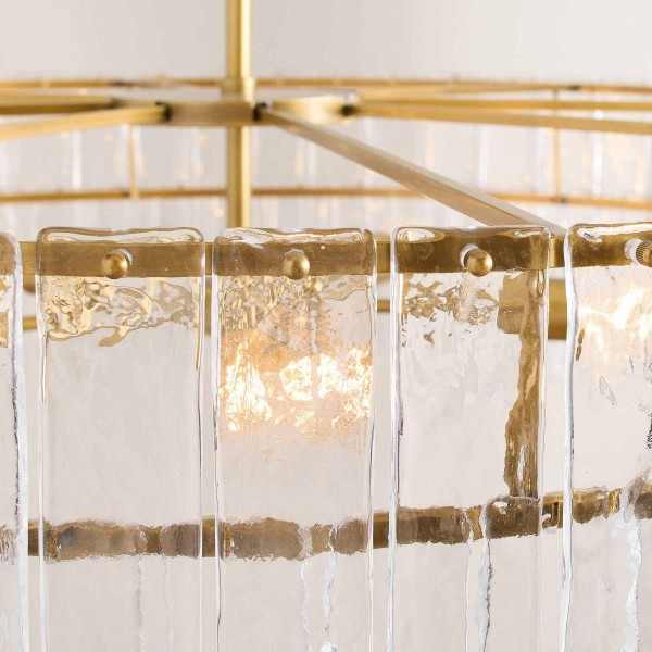 La lámpara de araña Lumvey exhibe lujo moderno con un toque Art Déco. Su diseño redondo y escalonado presenta prismas de vidrio fundidos individualmente que refractan la luz con un efecto brillante similar al agua. Con un refinado marco de metal, crea una impactante declaración en entradas, comedores y salas de estar.