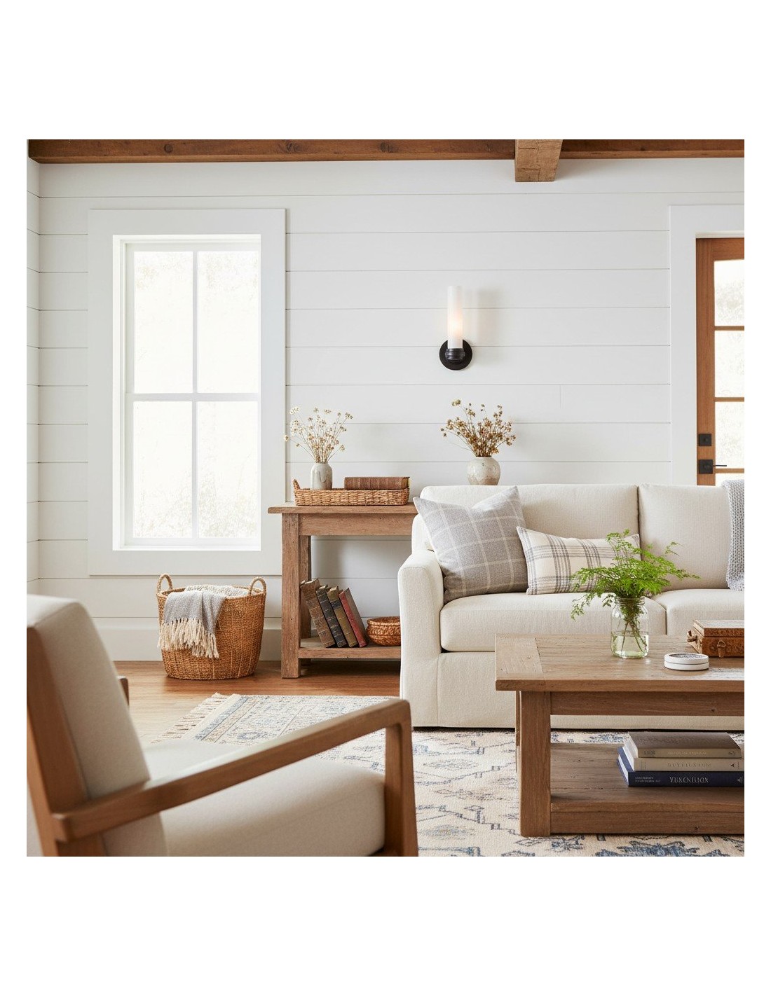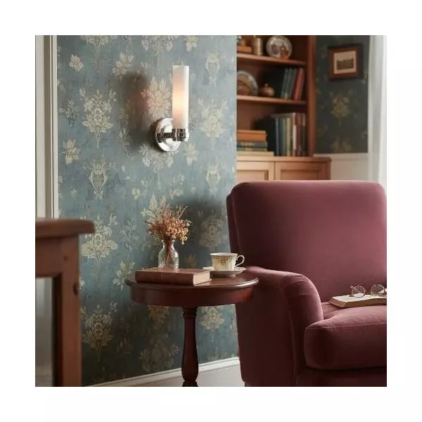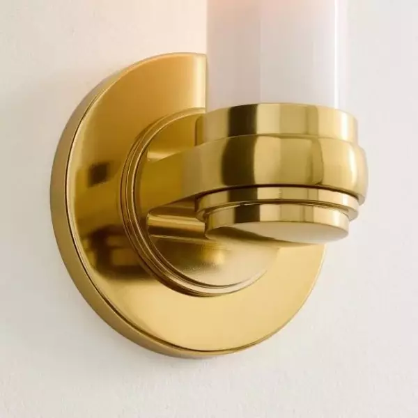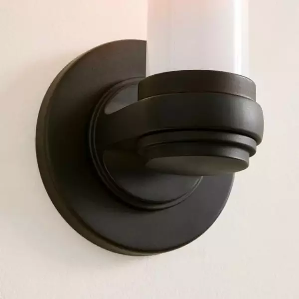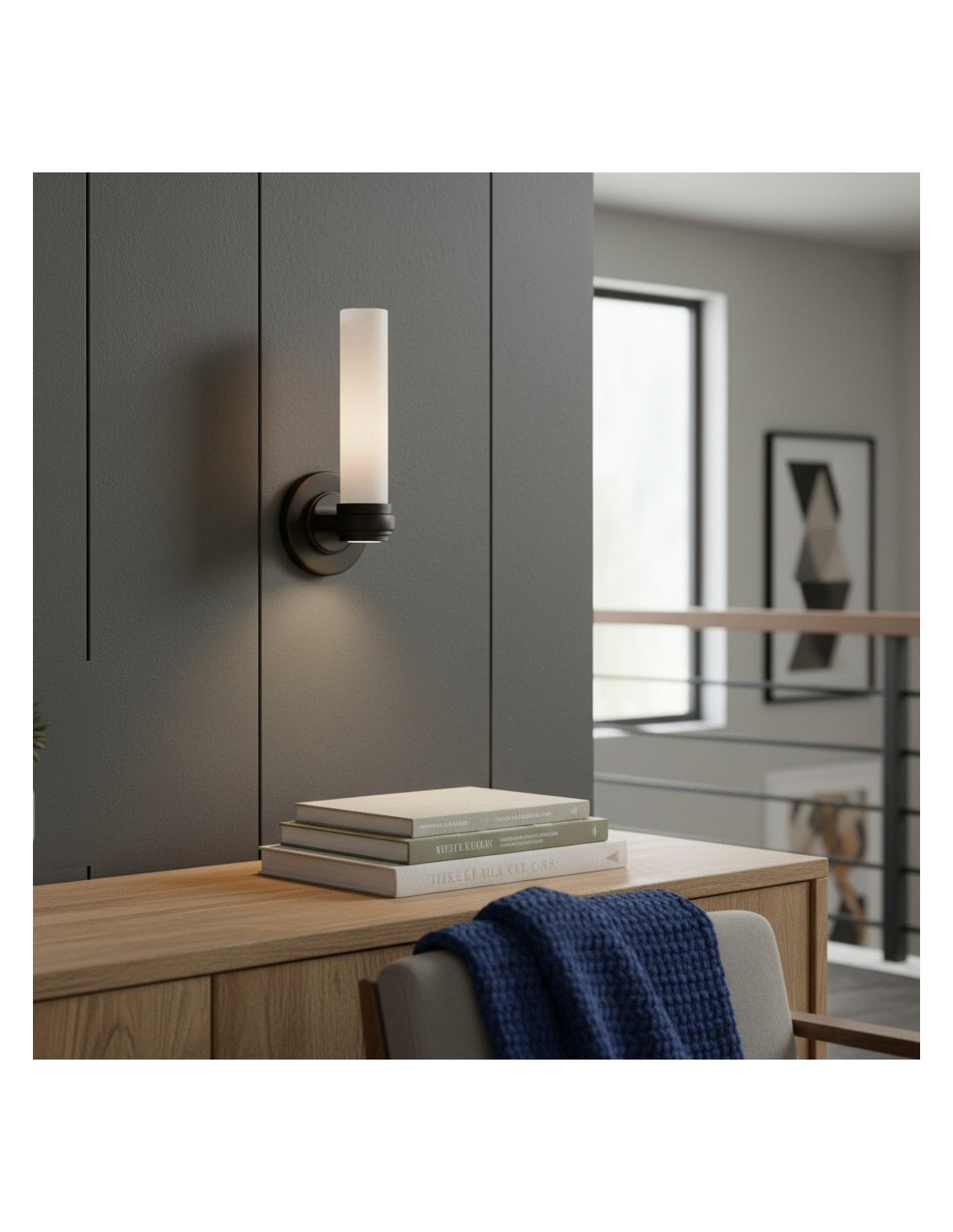 Aplique de pared tubular elegante con pantalla de tubo de vidrio y placa posterior de metal minimalista, que combina estilos modernos para una iluminación ambiental o de trabajo suave.